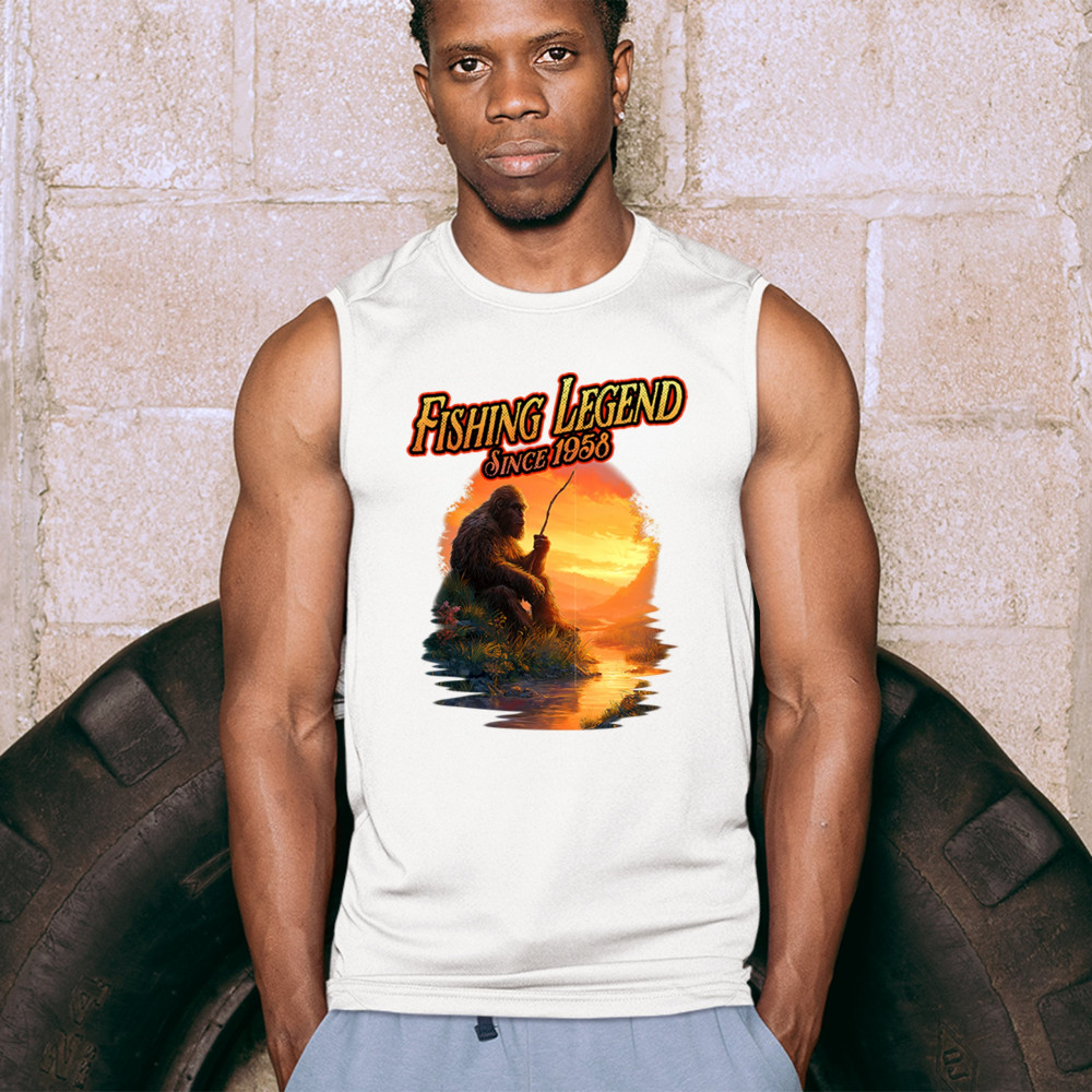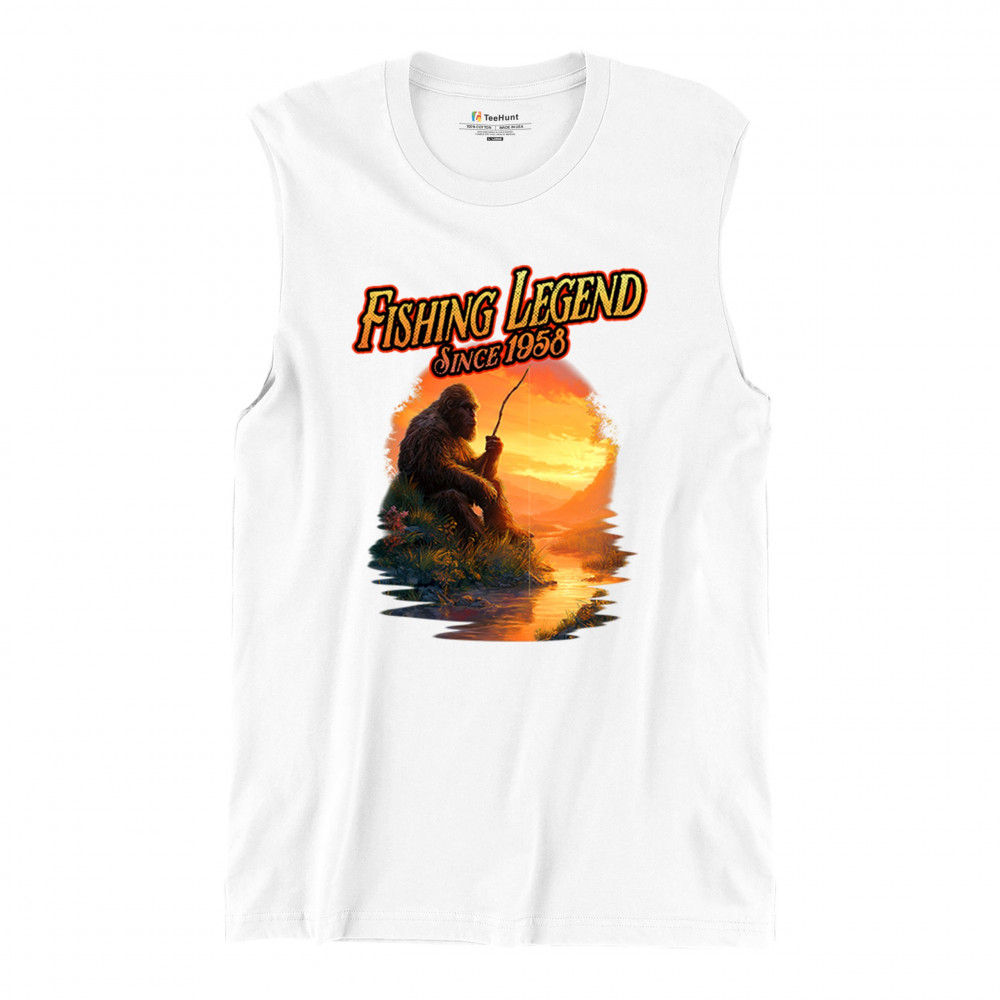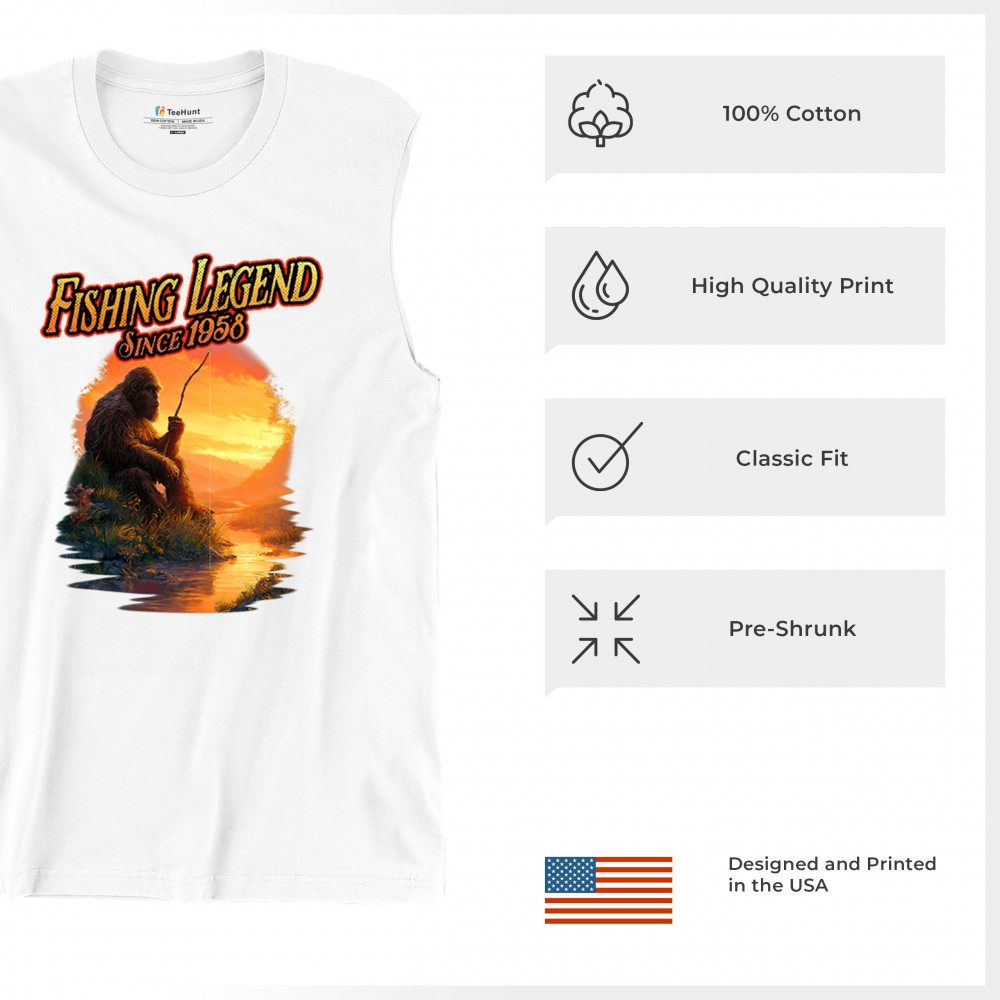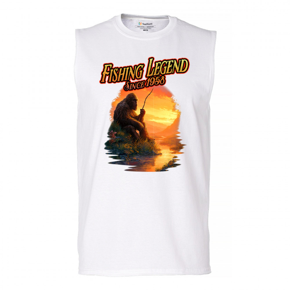 Bigfoot fishing legend design with Sasquatch lifestyle, retro vintage humor, funny wilderness shirt, Father’s Day gift, and campfire style.