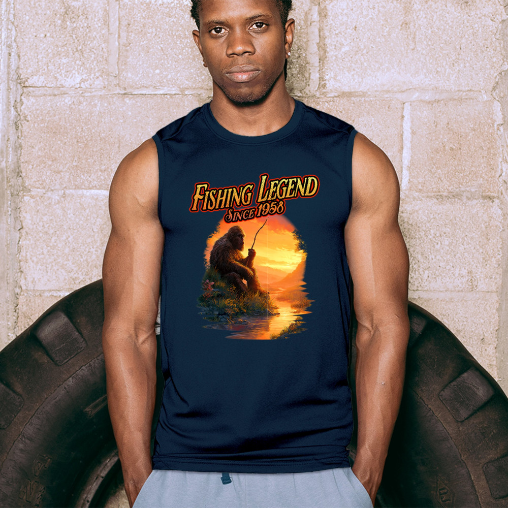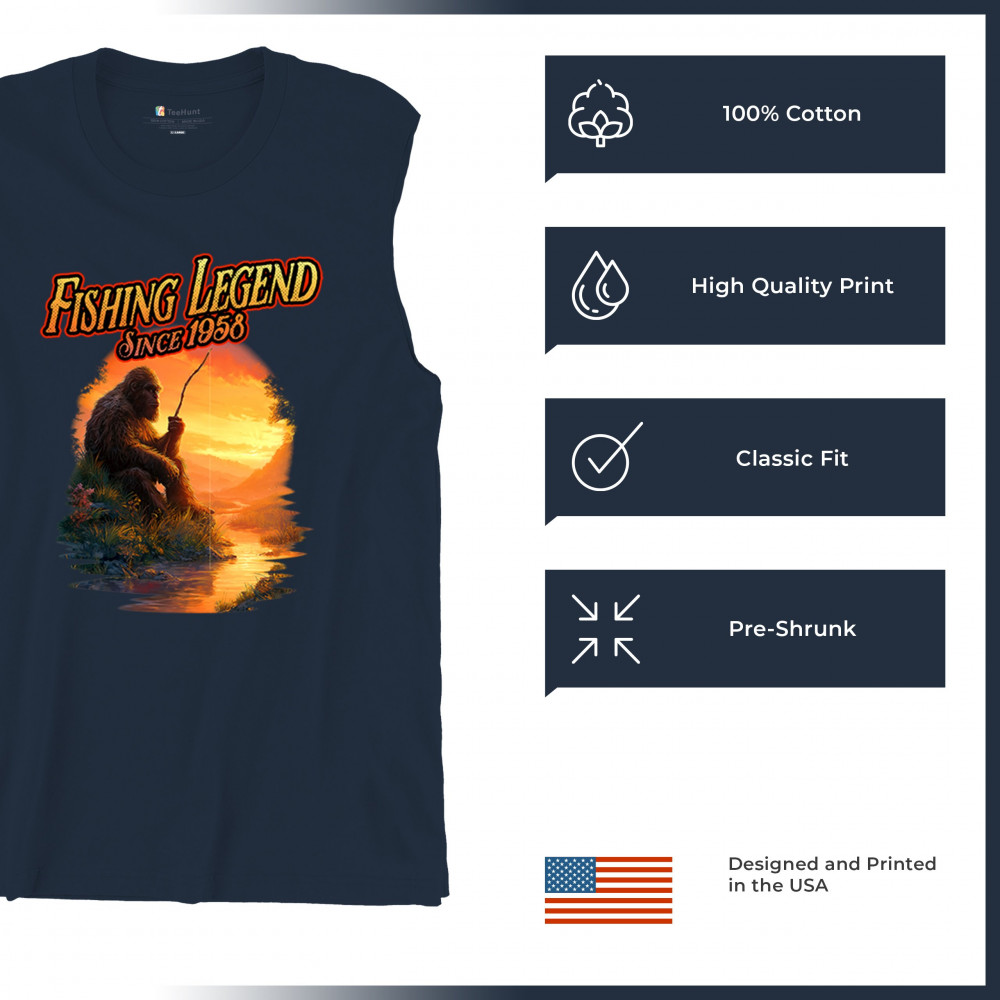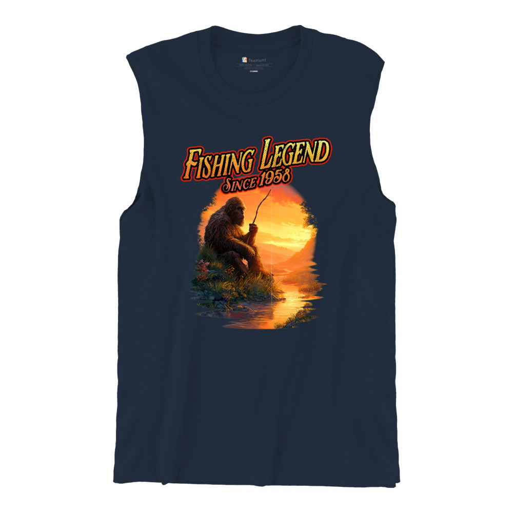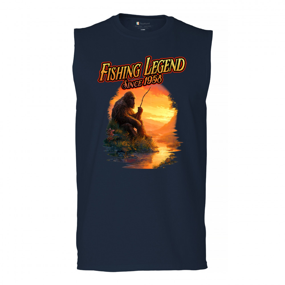 Bigfoot fishing legend design with Sasquatch lifestyle, retro vintage humor, funny wilderness shirt, Father’s Day gift, and campfire style.