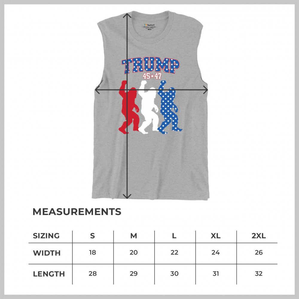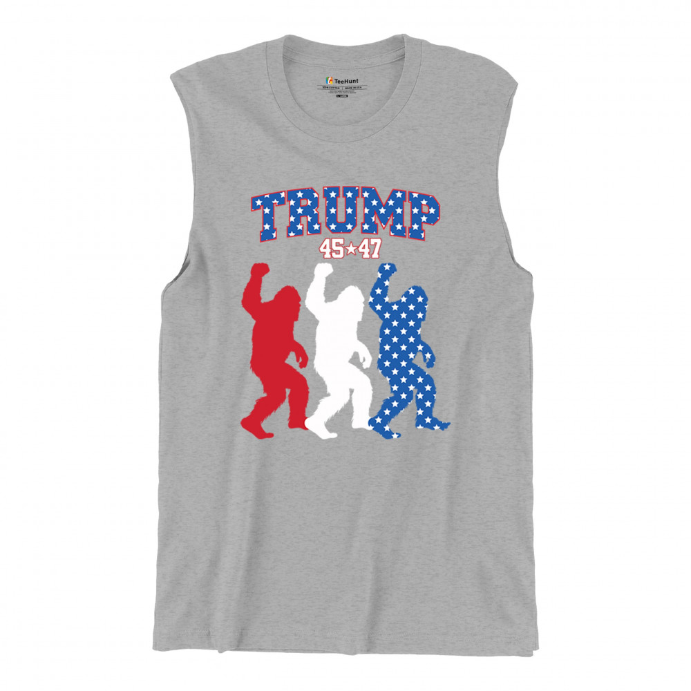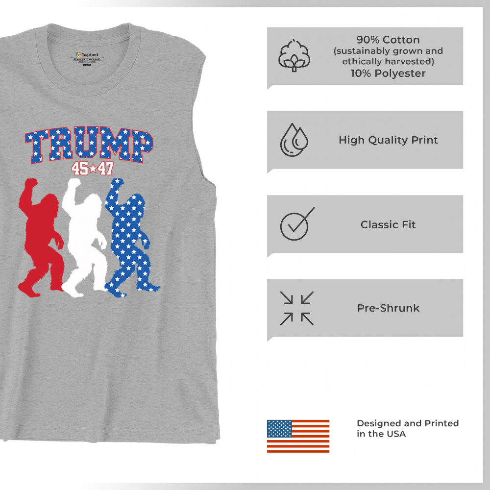 Unite humor and patriotism with the Trump 45/47 Bigfoot design! Featuring bold red, white, and blue Bigfoot silhouettes adorned with American flag stars, this eye-catching design supports Donald J. Trump, the Republican party, and the Red Wave movement. Embrace the fight for common sense, America First, and the people's mandate with this unique and fun statement piece.