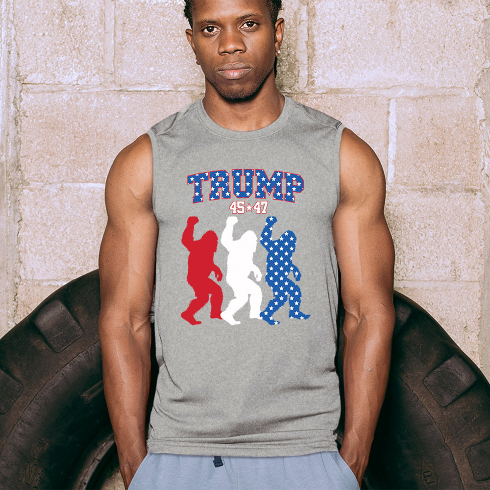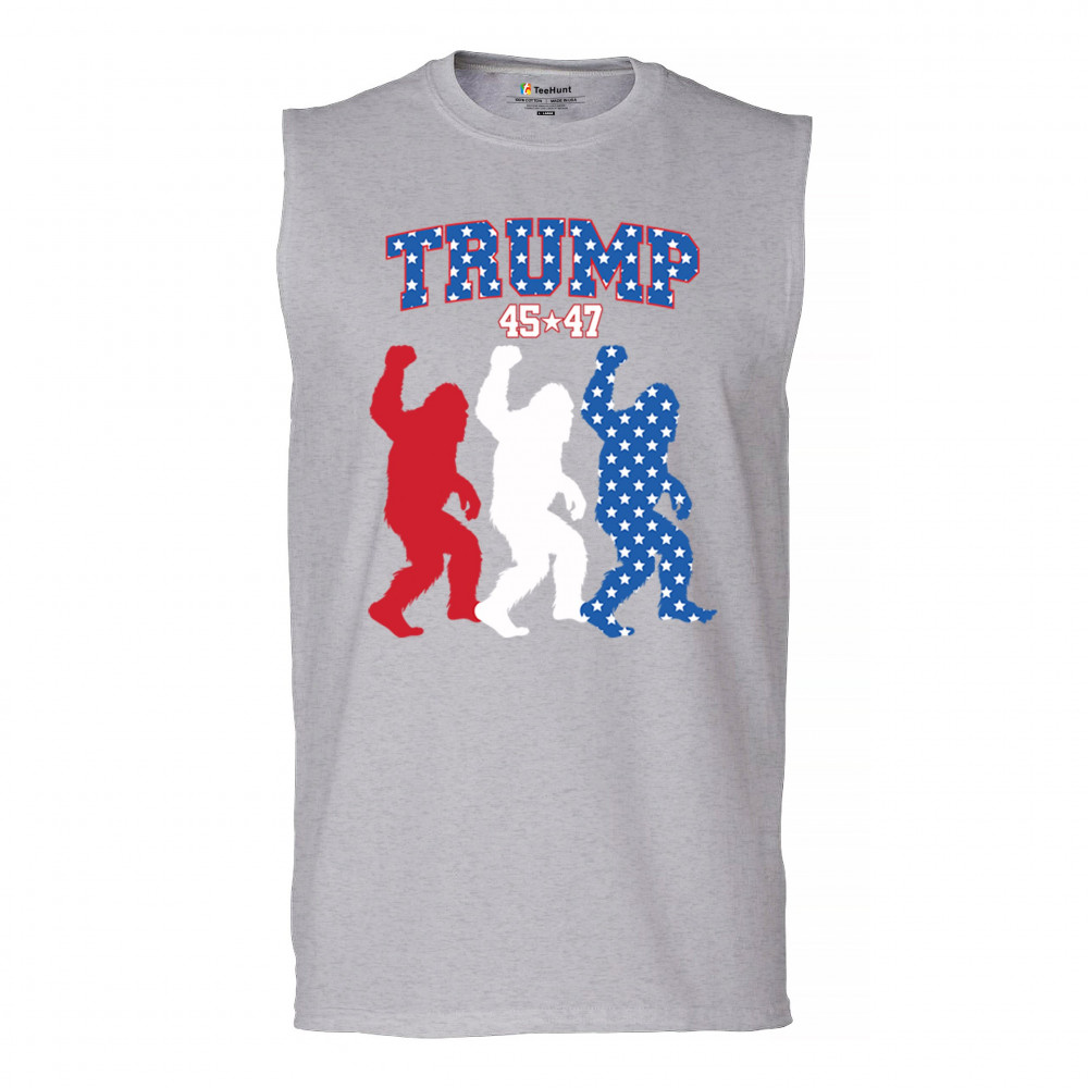 Trump 45/47 Bigfoot design in red, white, and blue with American flag stars. Celebrate patriotism, humor, and the fight for America First values.