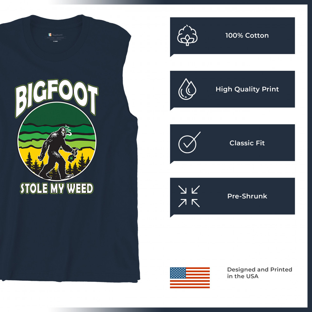 Humorous "Bigfoot Stole My Weed" design featuring Bigfoot and a cannabis leaf. Perfect for fans of Mary Jane, stoned humor, and a chill lifestyle.