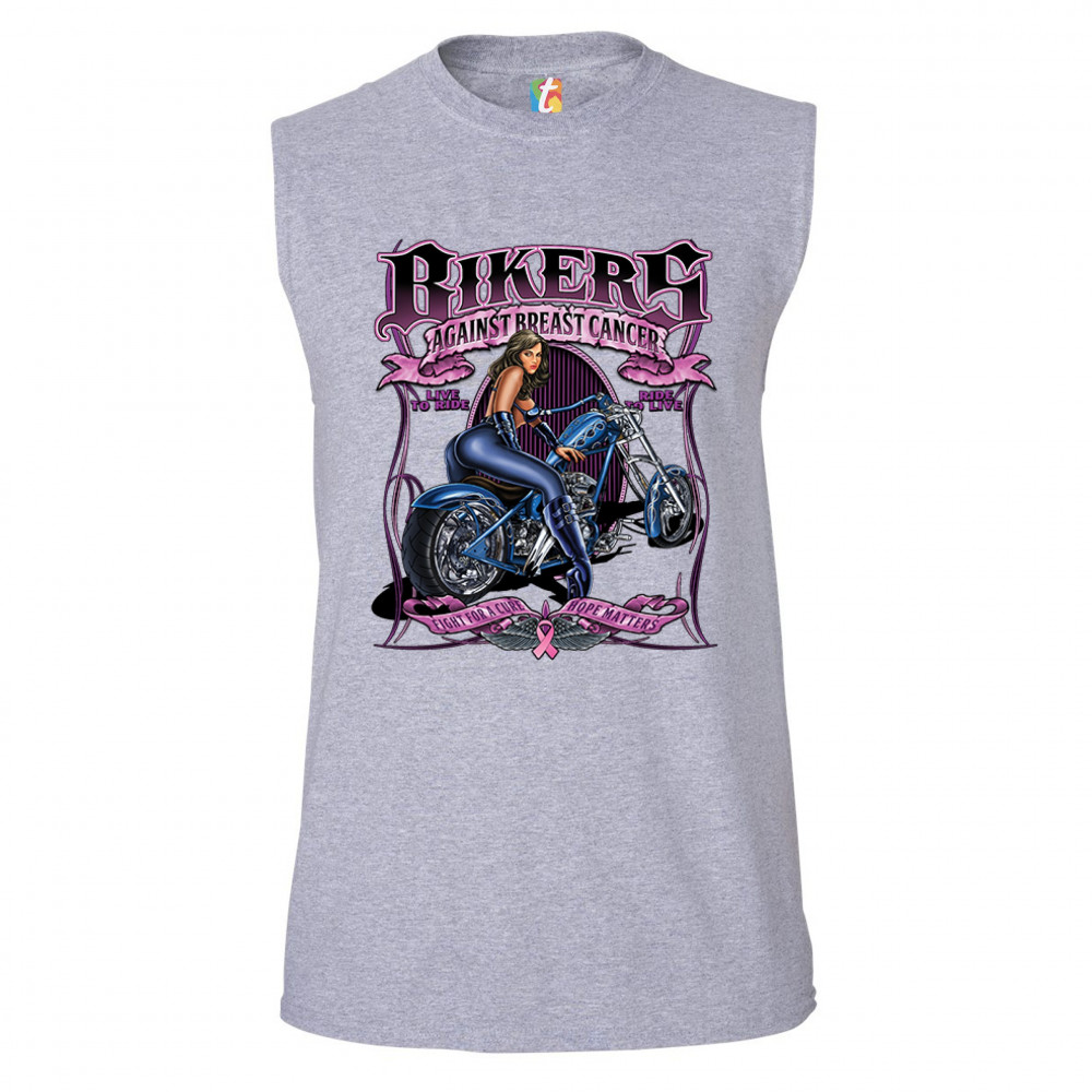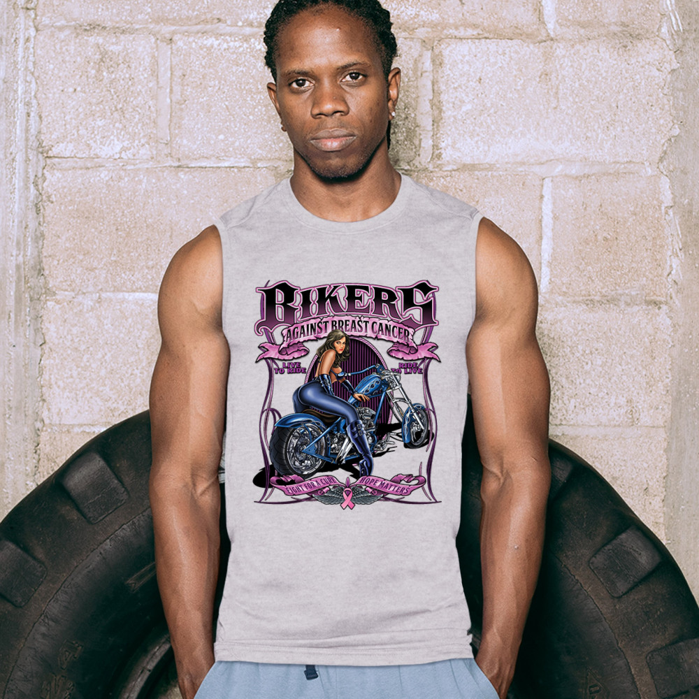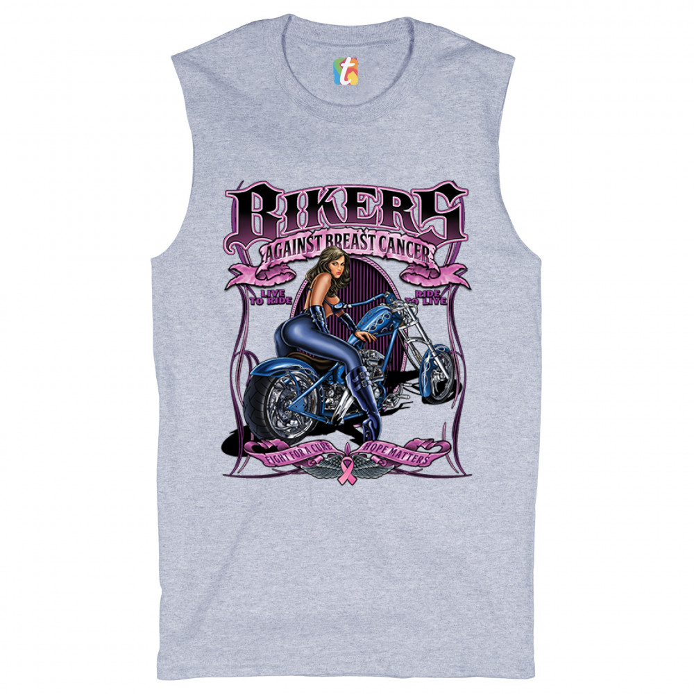 A print featuring a badass biker chick leaning on a chopper. The print says: "Bikers against breast cancer. Live to ride. Ride to live." At the bottom of the print there are two stripes with "fight for a cure, hope matters" written on them. Between the st