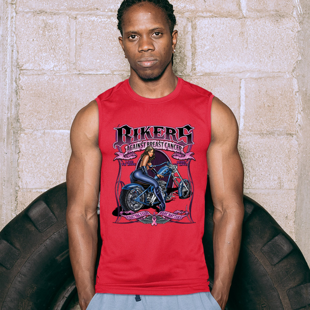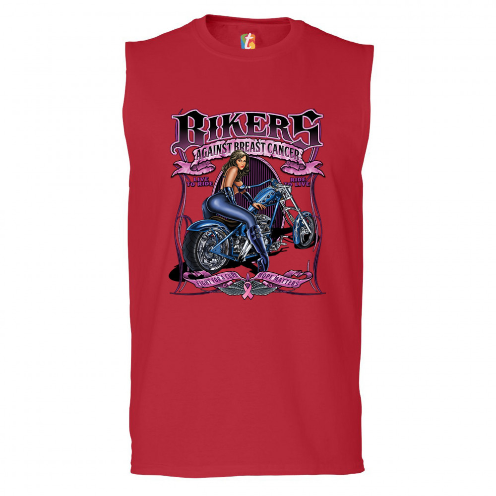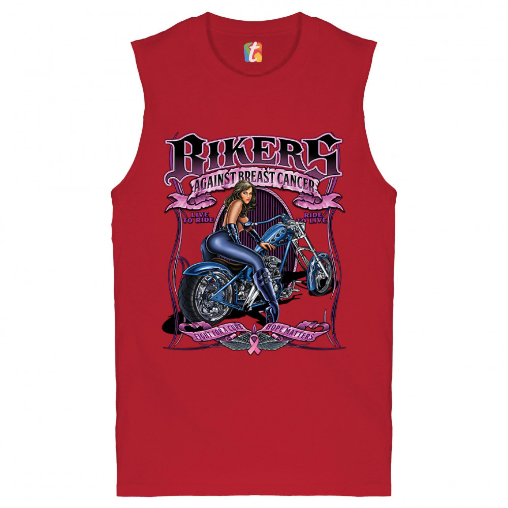 A print featuring a badass biker chick leaning on a chopper. The print says: "Bikers against breast cancer. Live to ride. Ride to live." At the bottom of the print there are two stripes with "fight for a cure, hope matters" written on them. Between the st