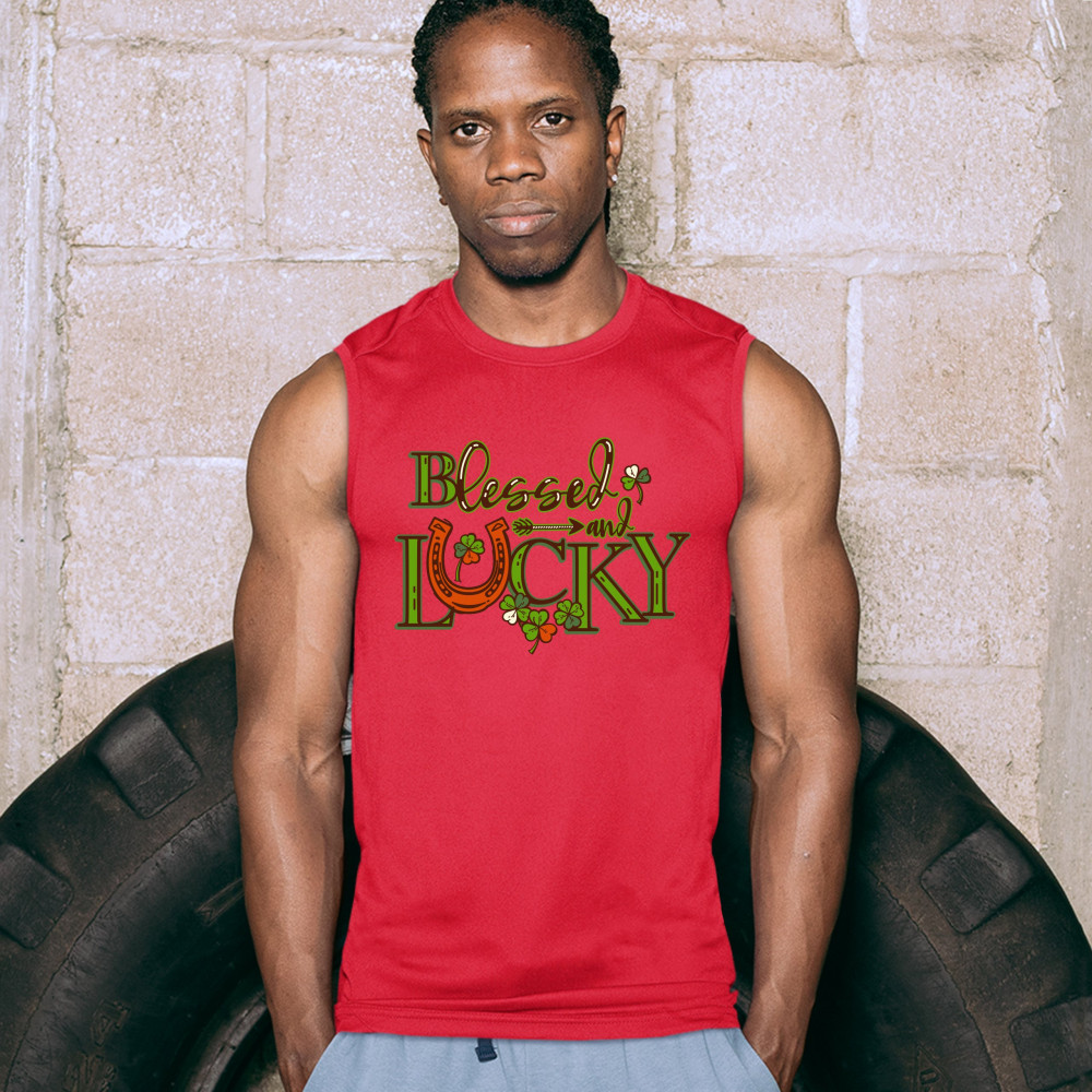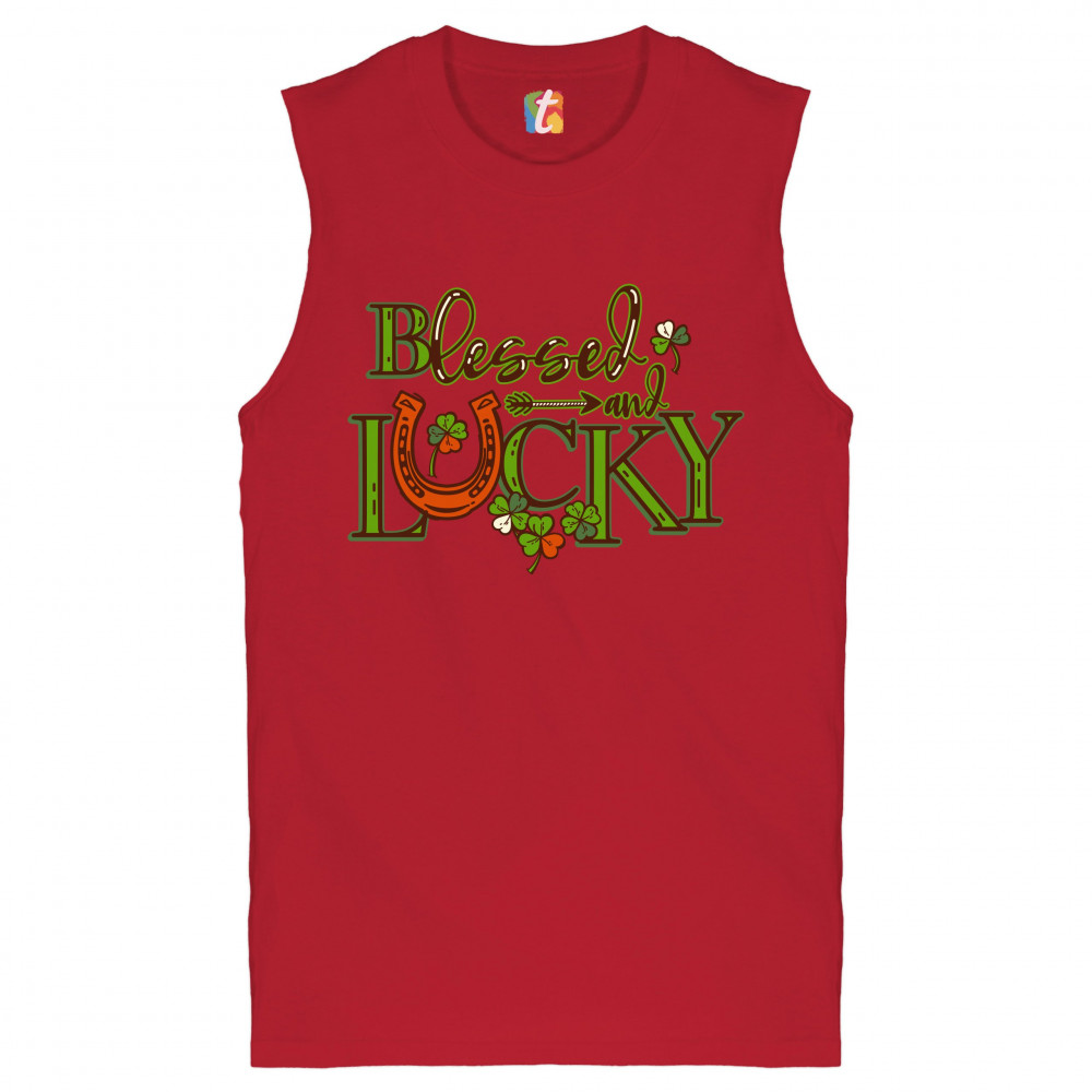 BLESSED AND LUCKY muscle shirt st. patrick's day clover irish malarkey men's red