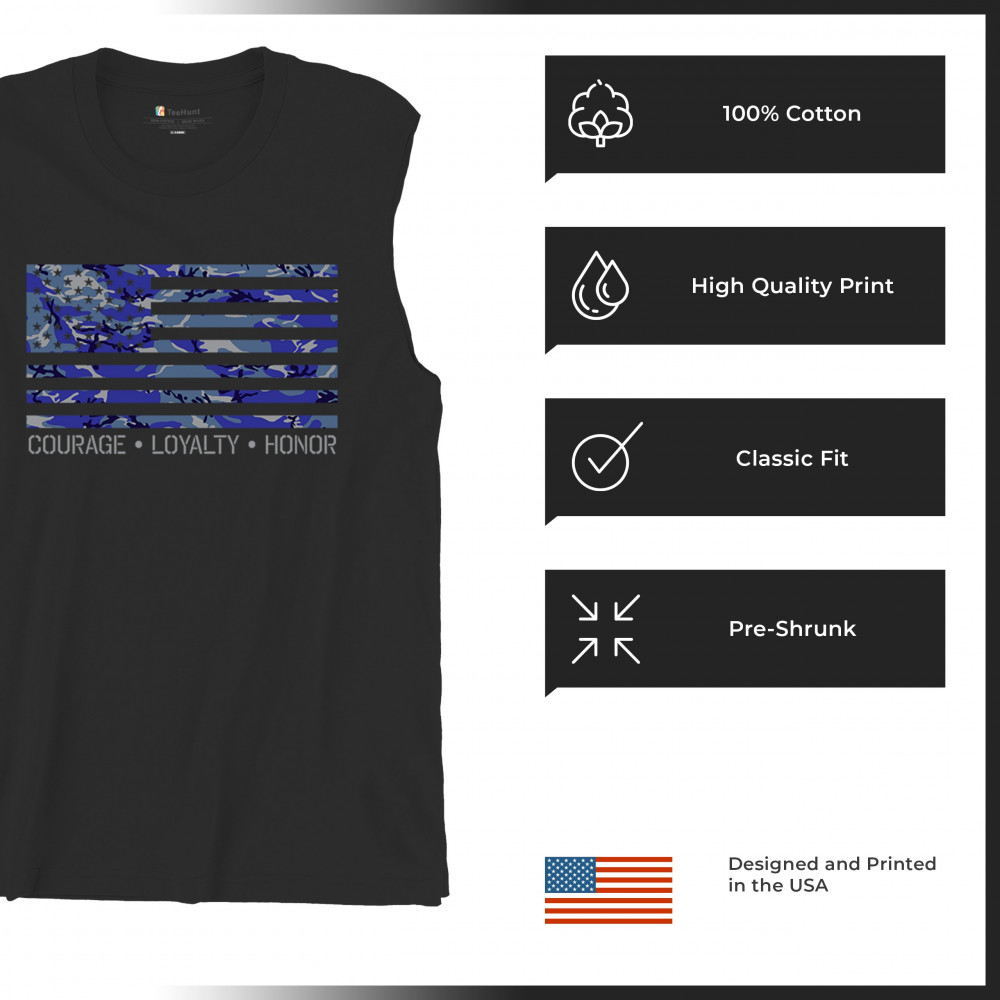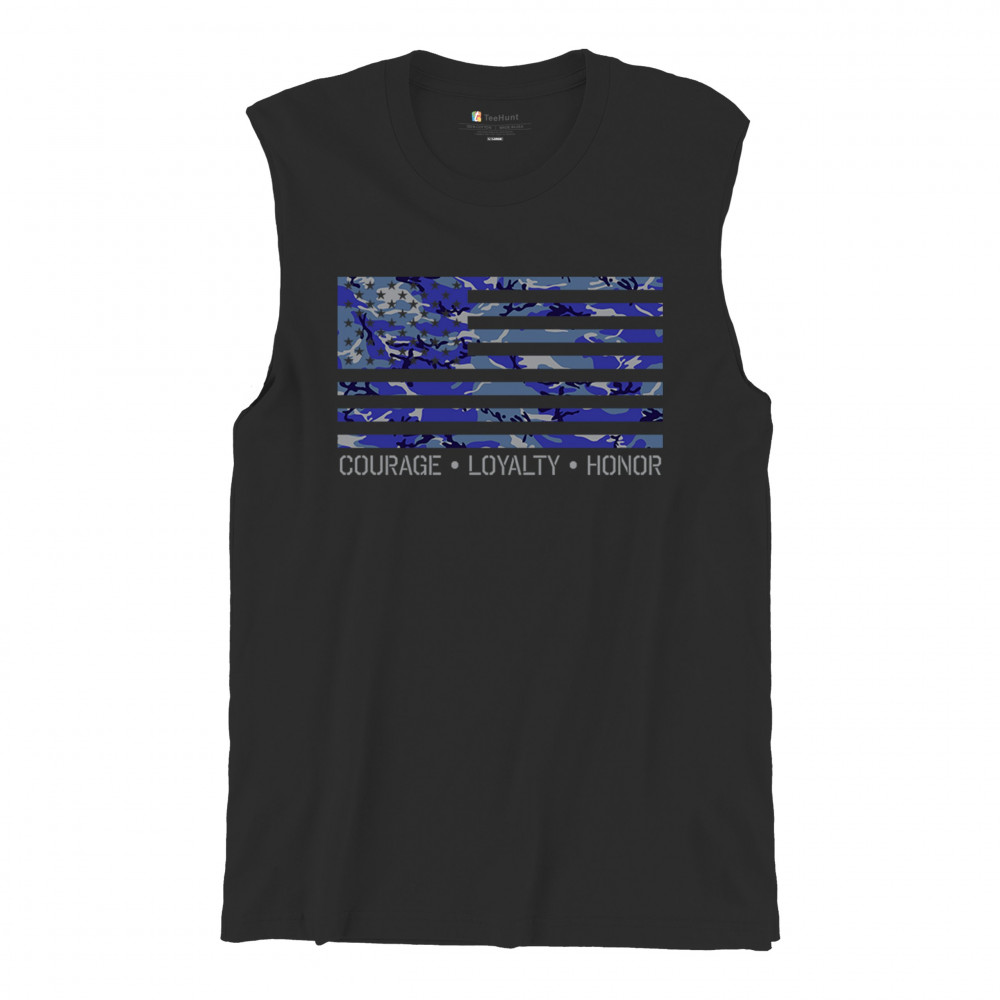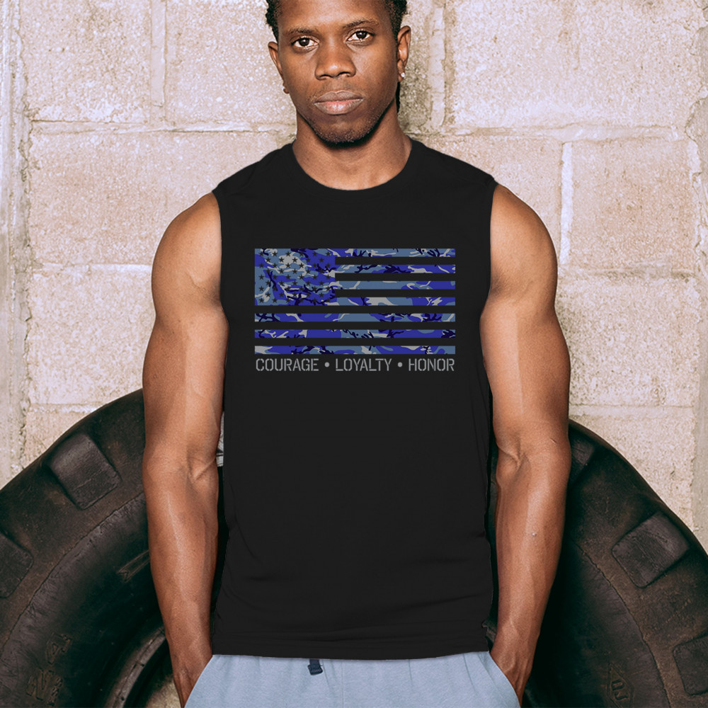Celebrate your patriotism with this distinctive shirt featuring a blue camouflage USA flag and the inspiring words "Courage, Loyalty, Honor". This shirt is perfect for veterans, military families, and all proud Americans. Made from premium fabric, it ensures both comfort and durability for everyday wear. Wear it on Memorial Day, Veterans Day, or any day to honor the bravery and commitment of those who serve our nation. This shirt is not just an apparel choice, but a statement of pride and respect.
