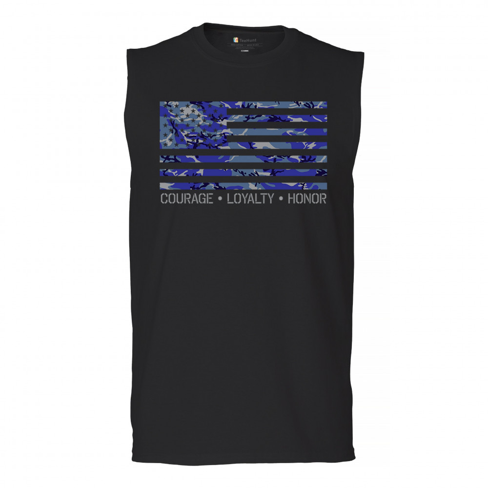 Patriotic shirt with blue camouflage USA flag and "Courage, Loyalty, Honor". Perfect for veterans and proud Americans. Ideal for Memorial Day and Veterans Day.