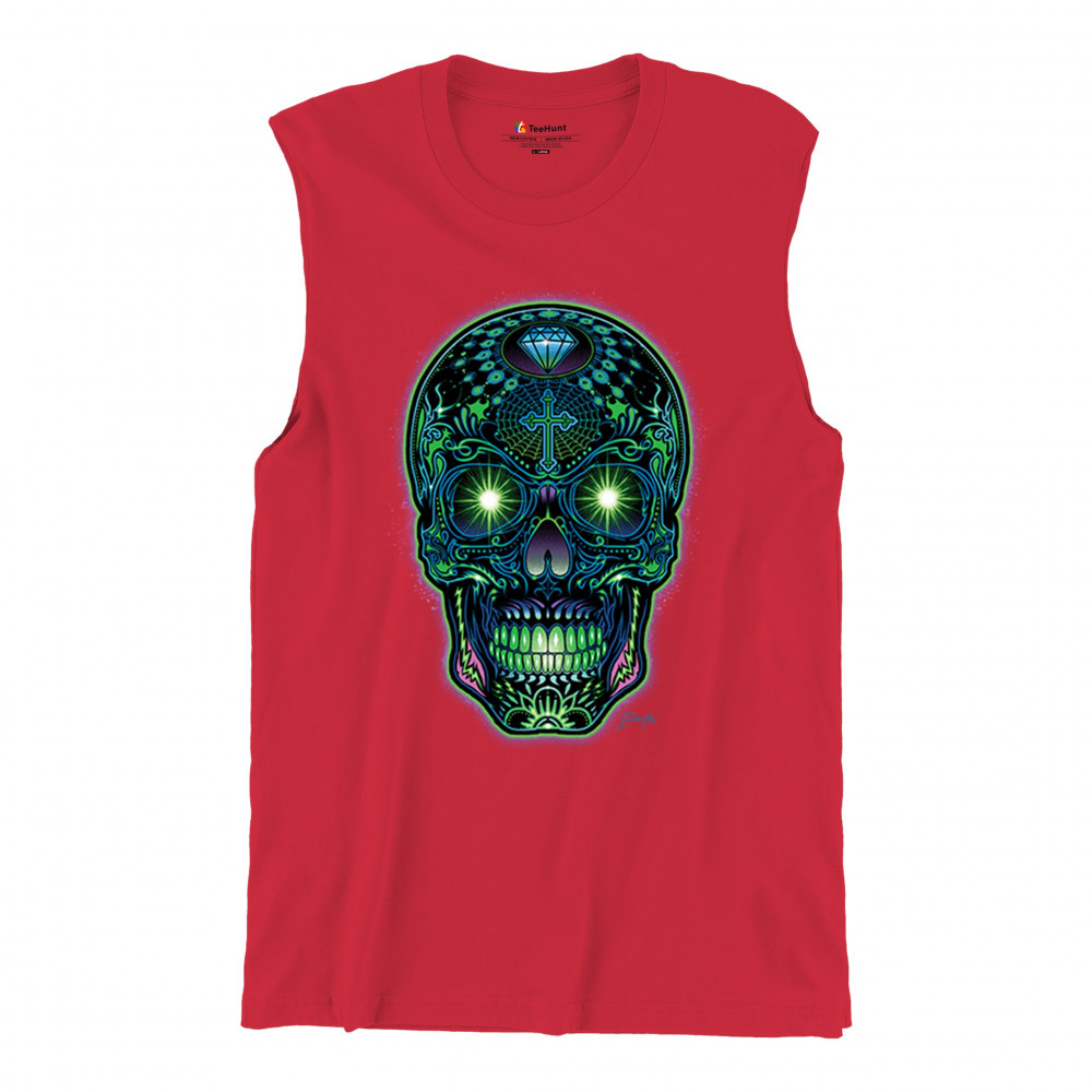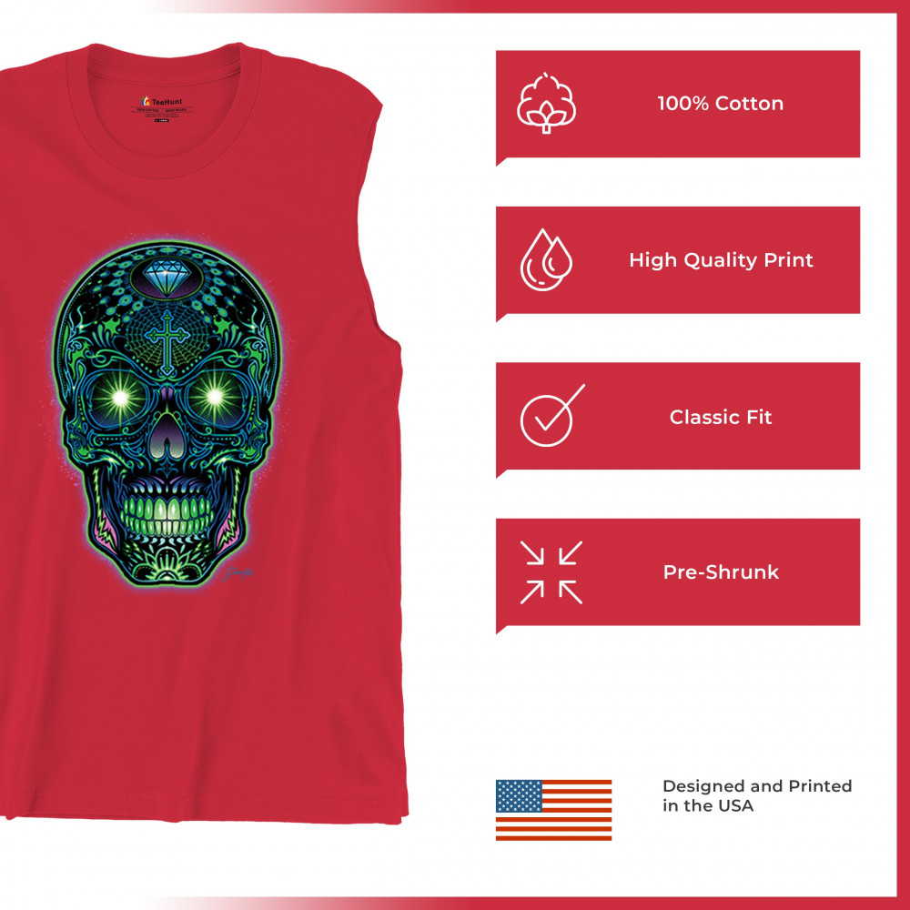 This electrified sugar skull design glows with neon energy and intricate details. Featuring green eyes, radiant cross, diamond, spider web, and vivid colors, it's a bold mash-up of psychedelic art, Day of the Dead tradition, and rave culture. A vibrant design perfect for skull fans and spiritual rebels alike.