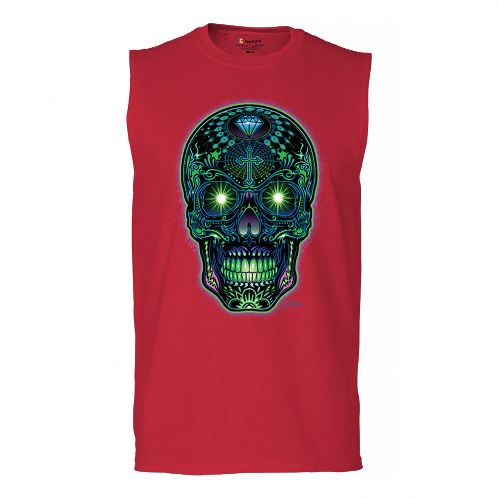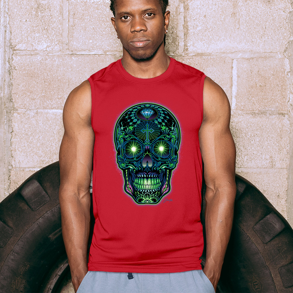 Electrified sugar skull with glowing green eyes, neon cross and diamond, perfect for rave lovers, skull art fans, and Day of the Dead style.