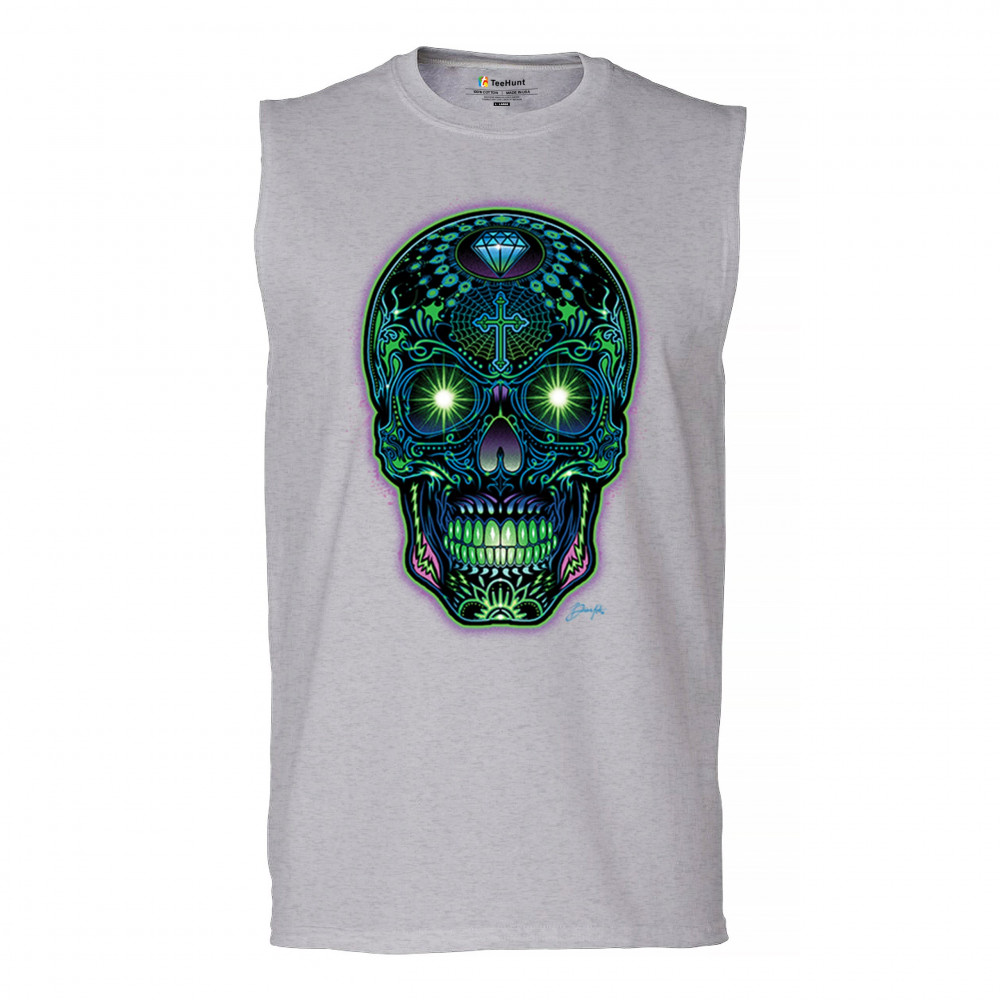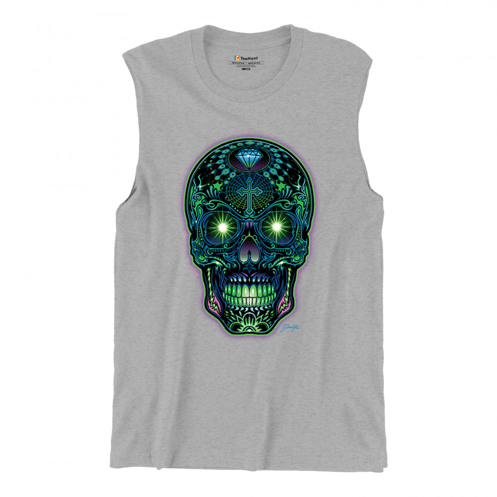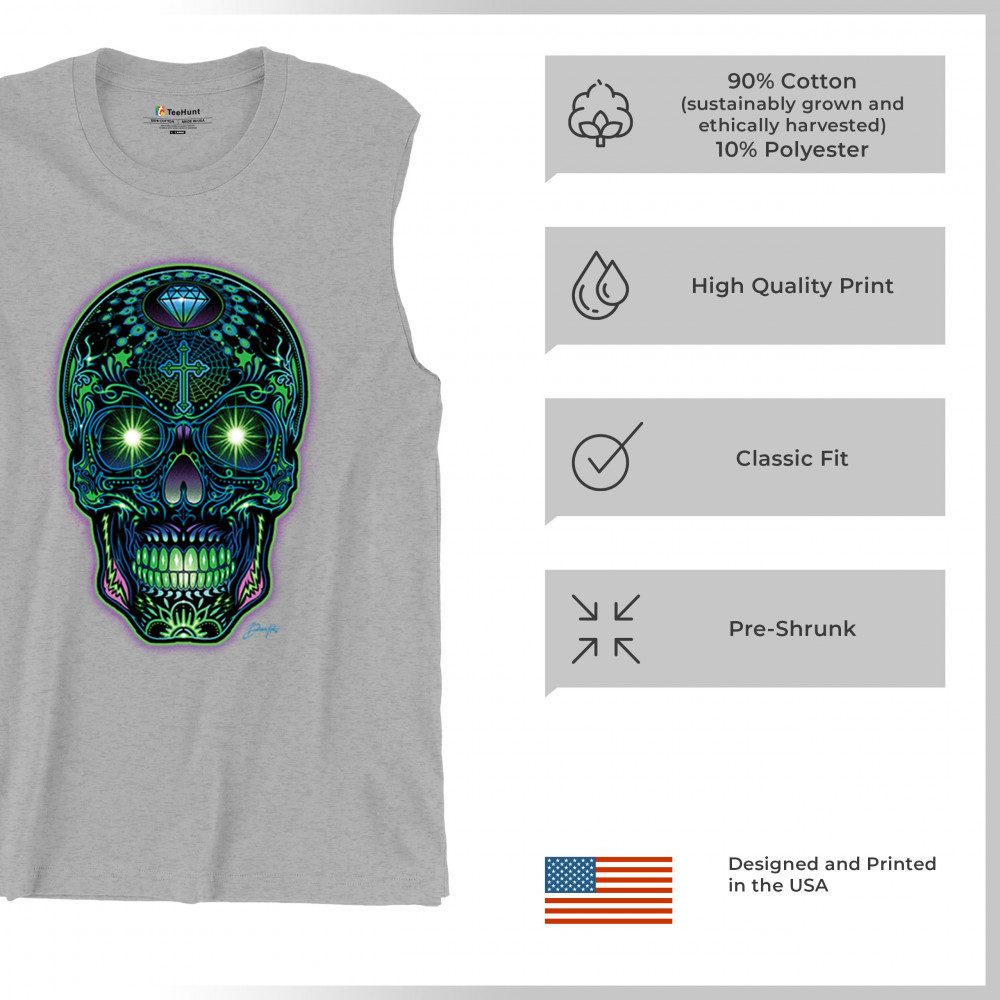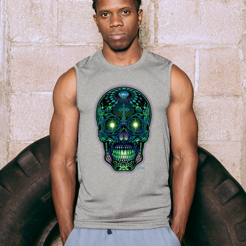 Electrified sugar skull with glowing green eyes, neon cross and diamond, perfect for rave lovers, skull art fans, and Day of the Dead style.