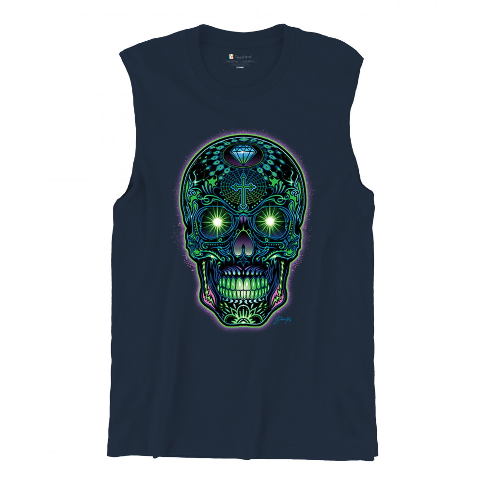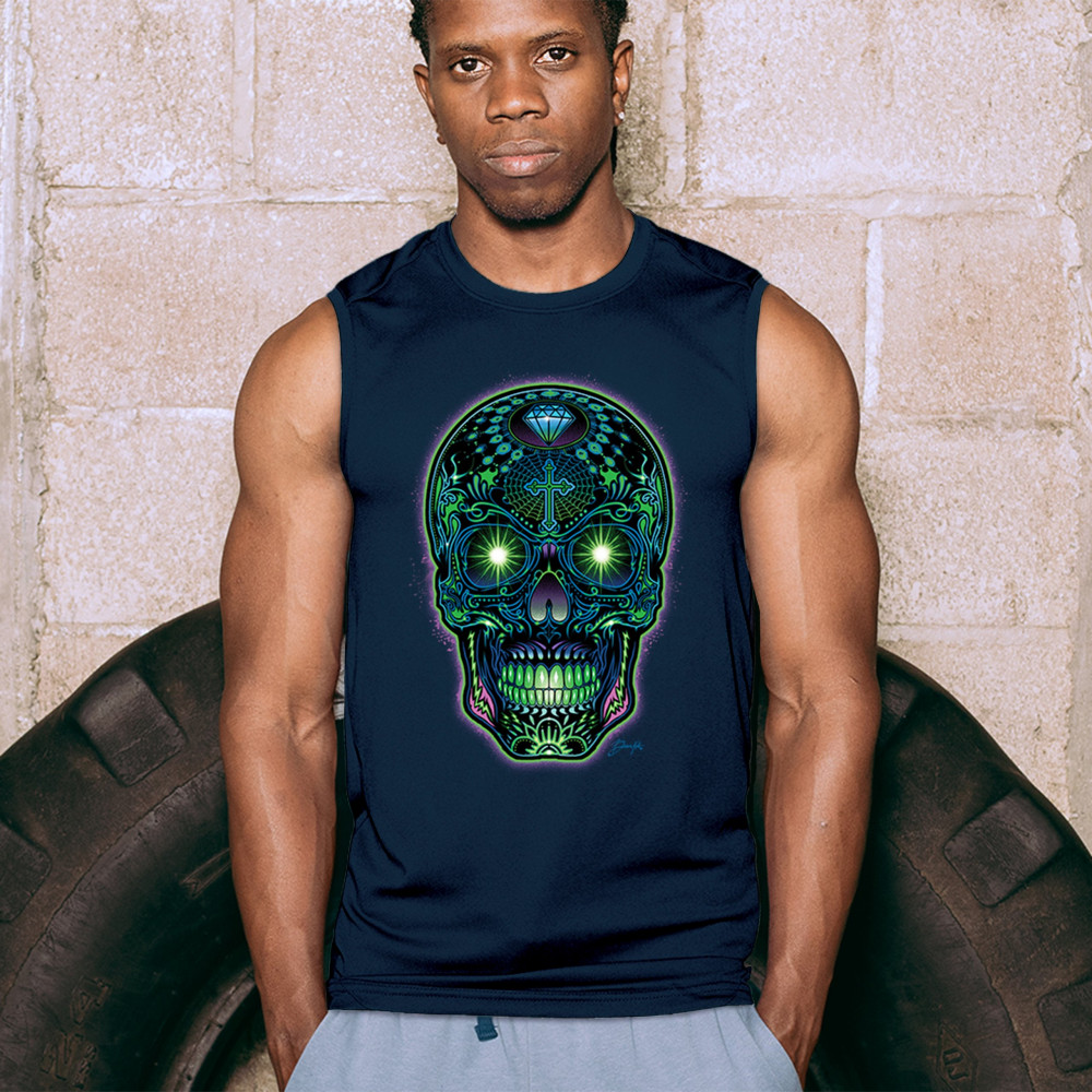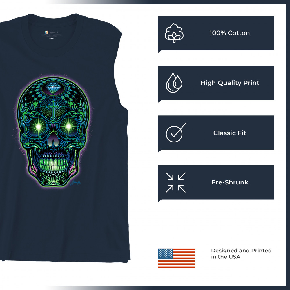 Electrified sugar skull with glowing green eyes, neon cross and diamond, perfect for rave lovers, skull art fans, and Day of the Dead style.