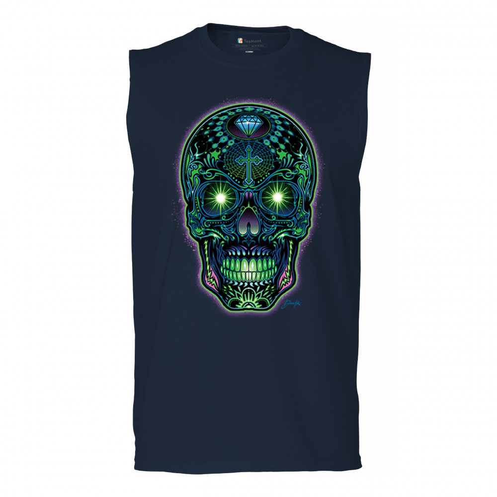 This electrified sugar skull design glows with neon energy and intricate details. Featuring green eyes, radiant cross, diamond, spider web, and vivid colors, it's a bold mash-up of psychedelic art, Day of the Dead tradition, and rave culture. A vibrant design perfect for skull fans and spiritual rebels alike.