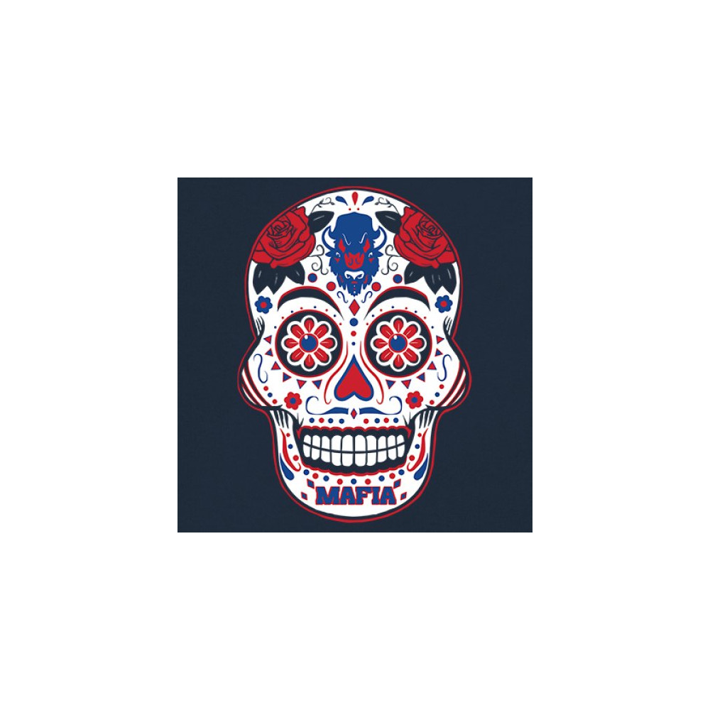 Buffalo Sugar Skull with NY Bleed Blue pride, Northern Grit, Queen City football, playoff energy, and fantasy fan culture.