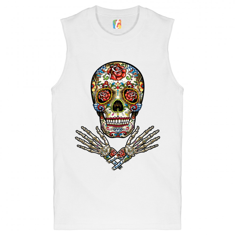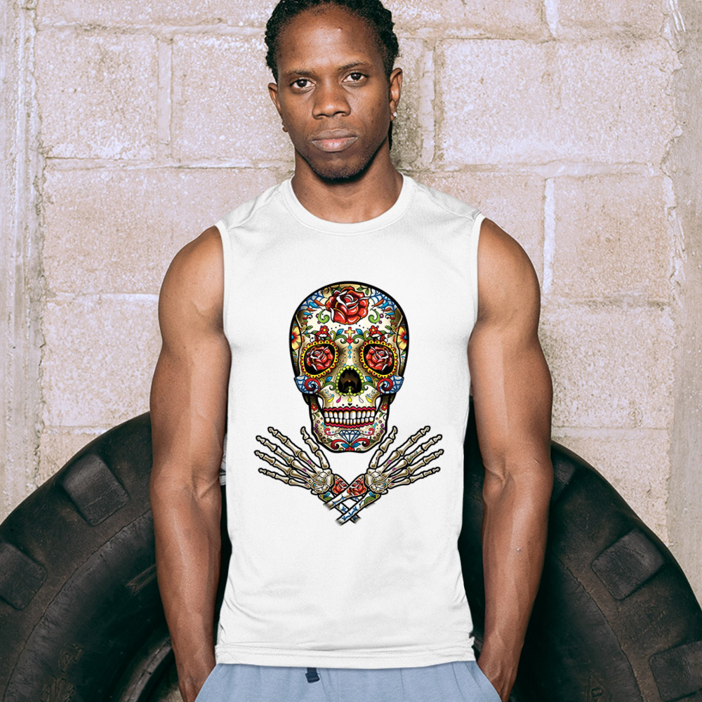A huge print featuring a big calavera with roses in the eye sockets. There is a cross between the eyes and a huge rose on the forehead. Below the skull there are crossed arms. A great choice for anyone who upholds the traditions and celebrates the Day of