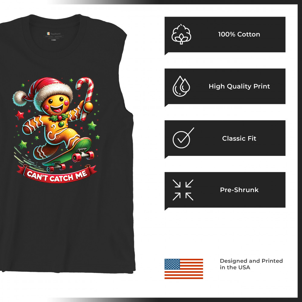 A fun Christmas design featuring a gingerbread character on a skateboard, candy cane in hand, and bright festive colors. Perfect for holiday party outfits, family gatherings, Christmas photos, festive humor fans, stocking stuffer gifting, winter celebrations, and anyone who loves playful seasonal graphics with cheerful personality.
