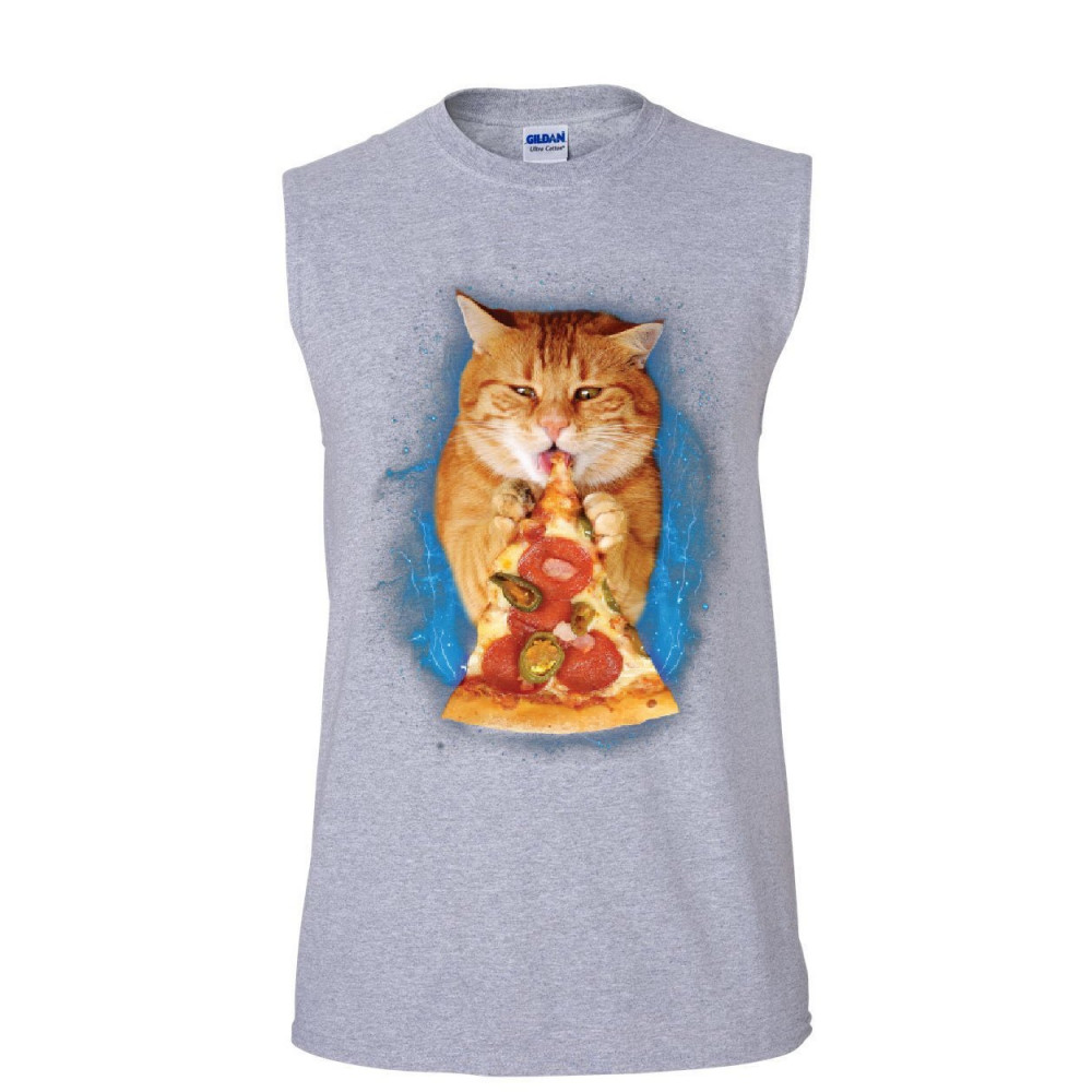 CAT EATING PIZZA muscle shirt funny weird kitten pet kitty peperoni sleeveless gray