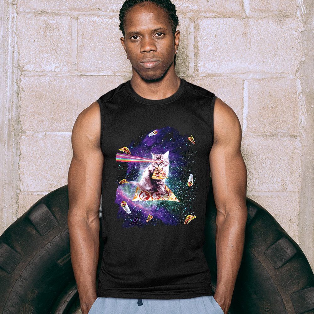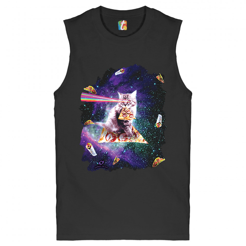 CAT FIRING RAINBOW LASER RIDING PIZZA SLICE IN SPACE muscle shirt weird men's black
