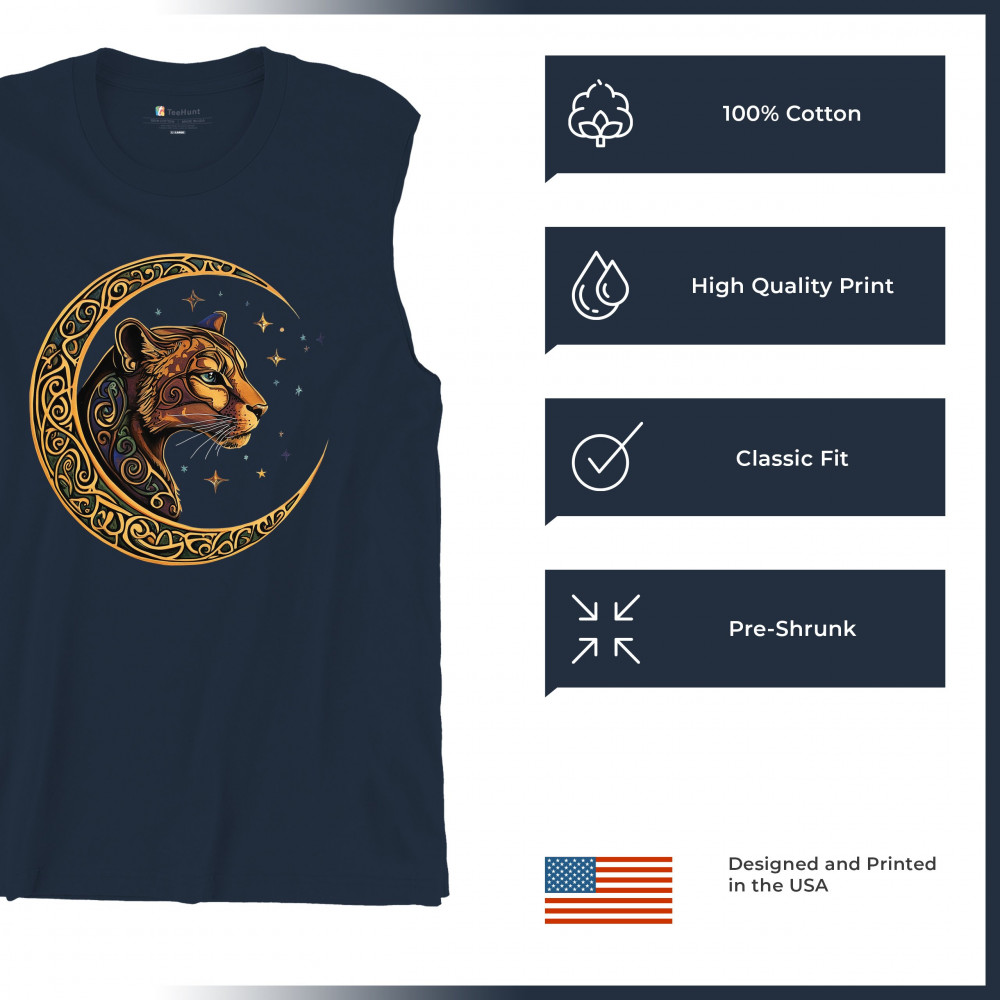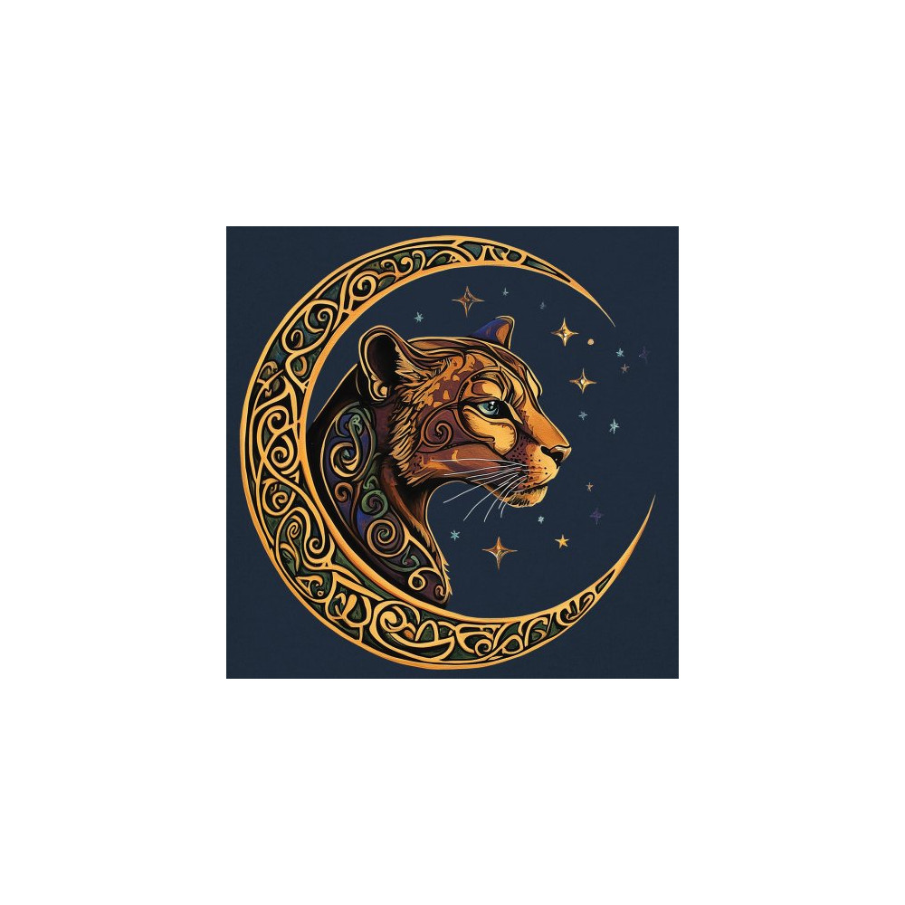 Mystical and elegant, this celestial leopard design merges wild animal strength with spiritual energy. Framed by a golden Celtic crescent moon and set against a starlit sky, it captures themes of nature, intuition, tribal symbolism, fantasy, and feminine power. Ideal for astrology fans, animal lovers, and seekers of cosmic connection.