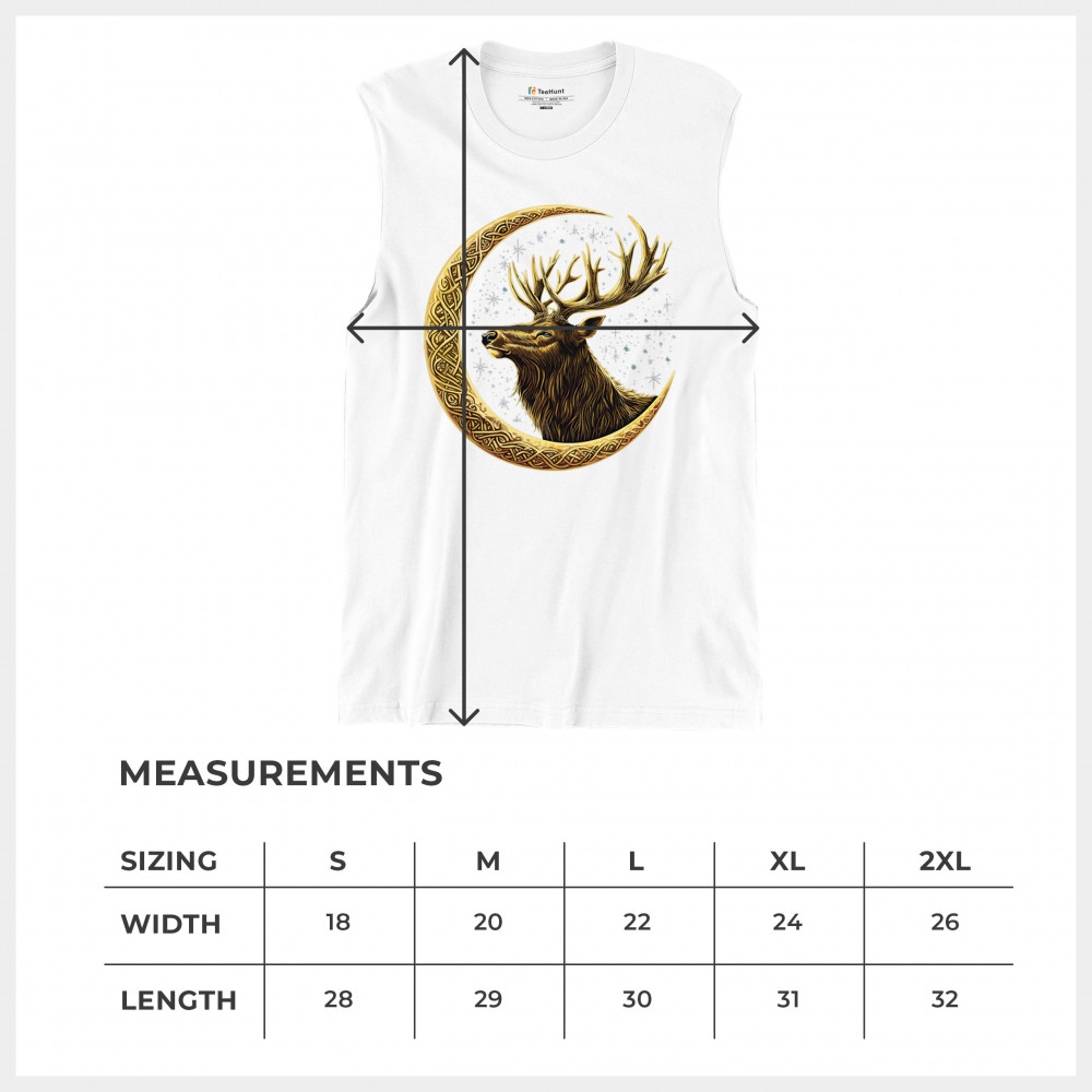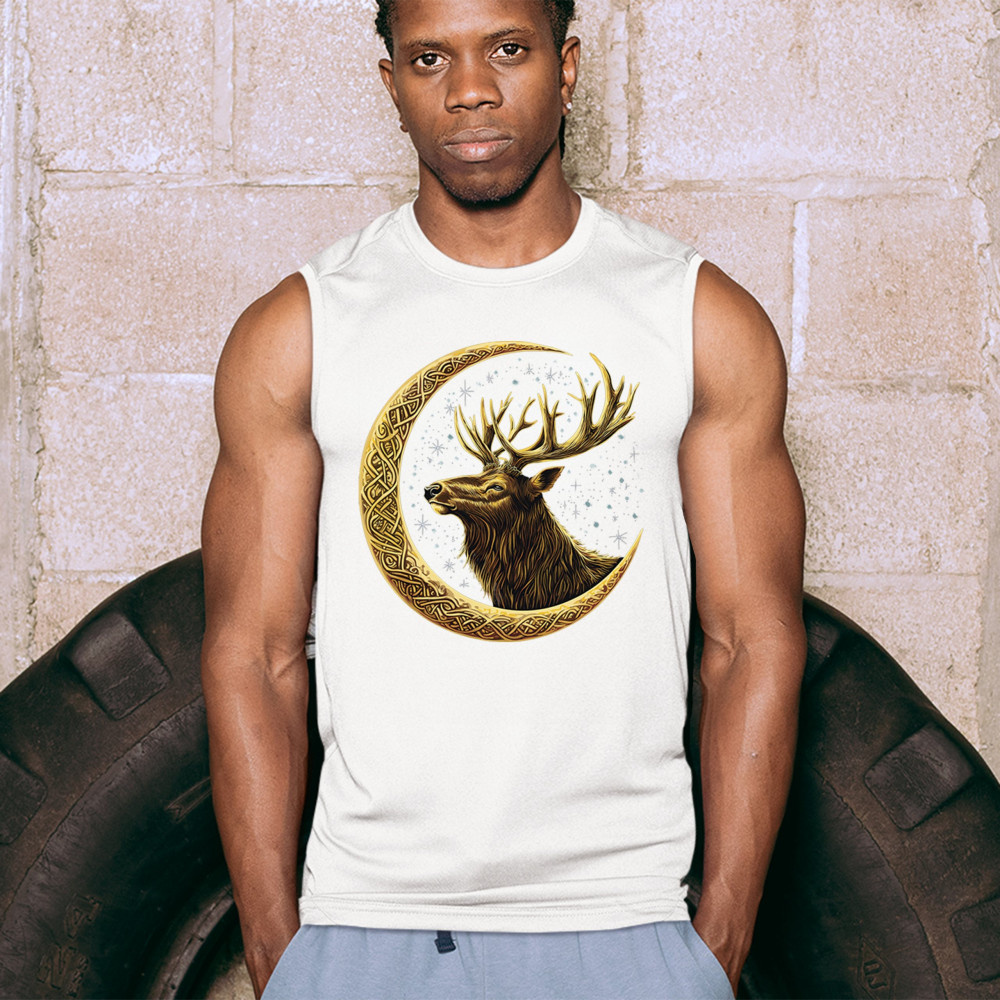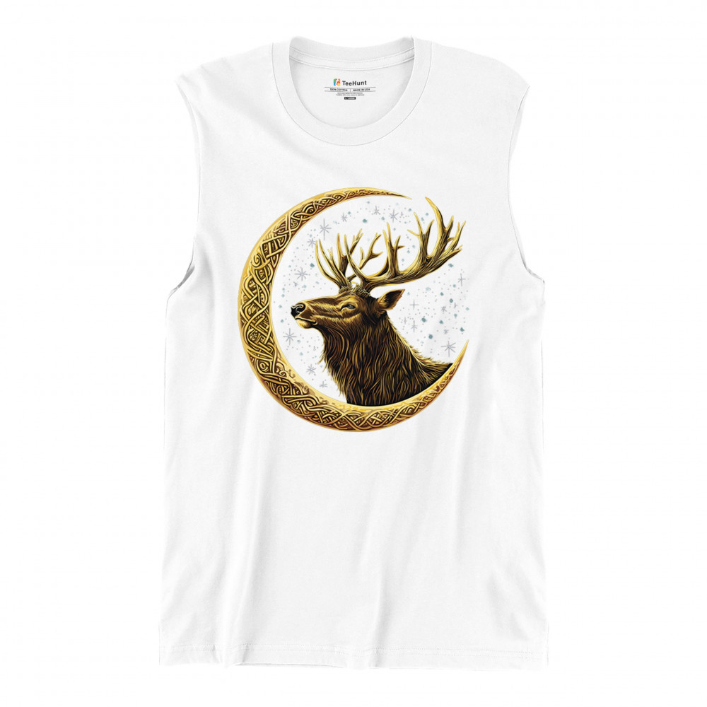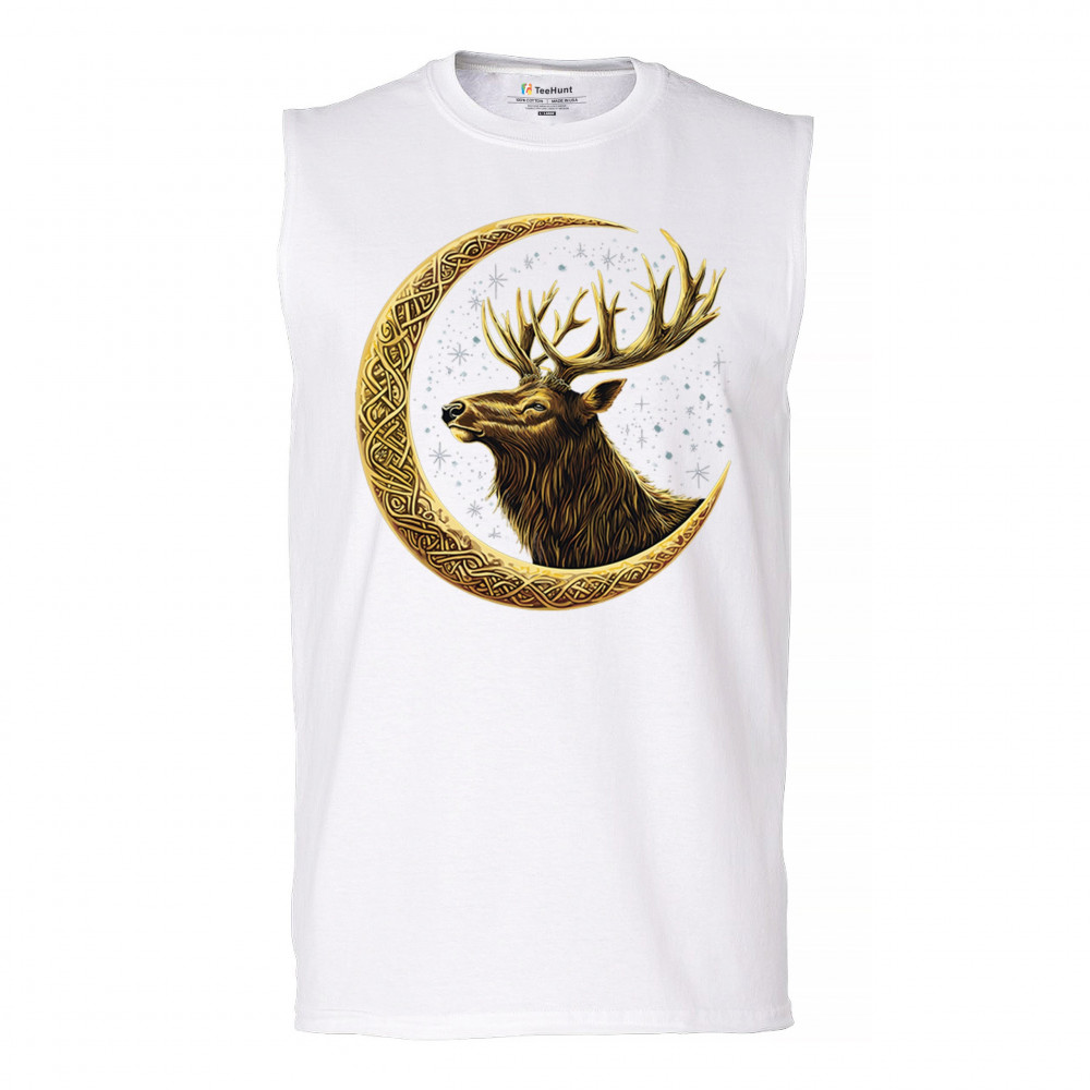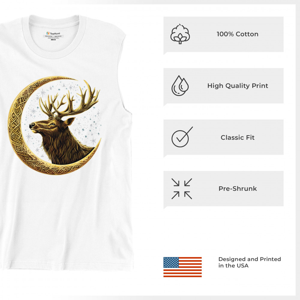 Celtic stag design with golden moon and cosmic stars. Symbolizes forest strength, leadership, and spiritual energy. Perfect for nature lovers.