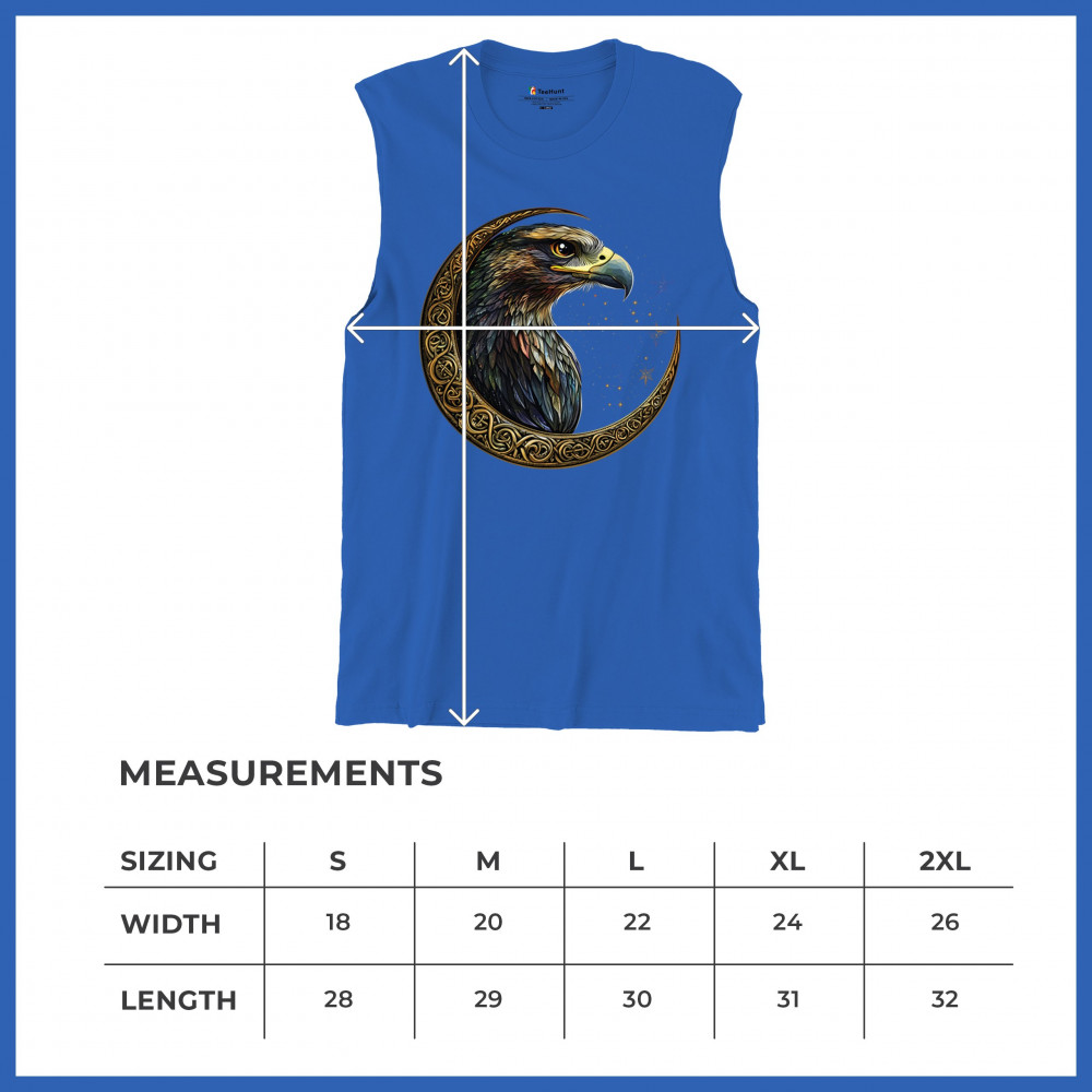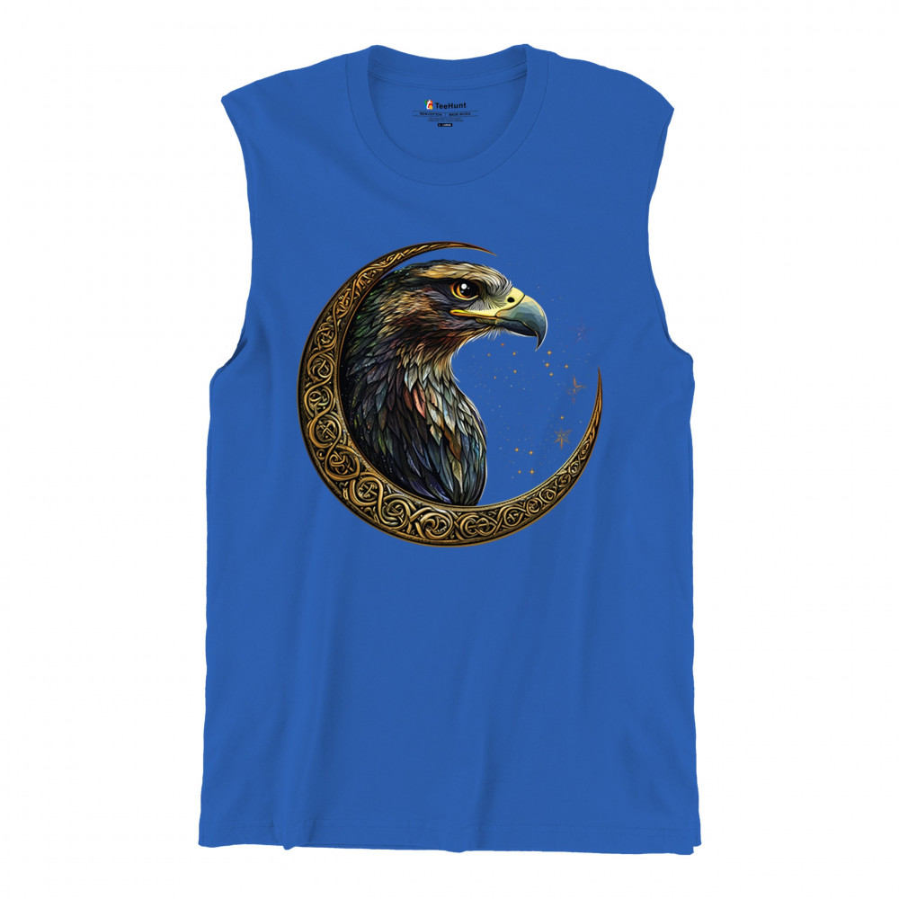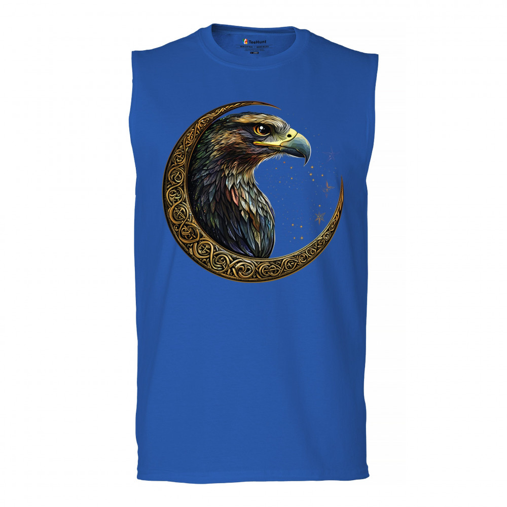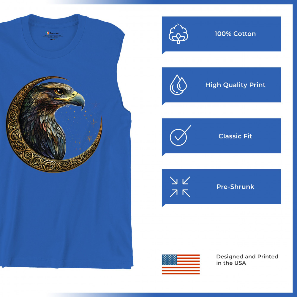 A beautifully detailed eagle with vibrant feathers is framed by a golden Celtic crescent moon and surrounded by a starry cosmic sky. This striking design represents freedom, spiritual power, and the mystery of the skies. Perfect for patriots, bird lovers, and those who connect with nature, tribal symbolism, and celestial art.