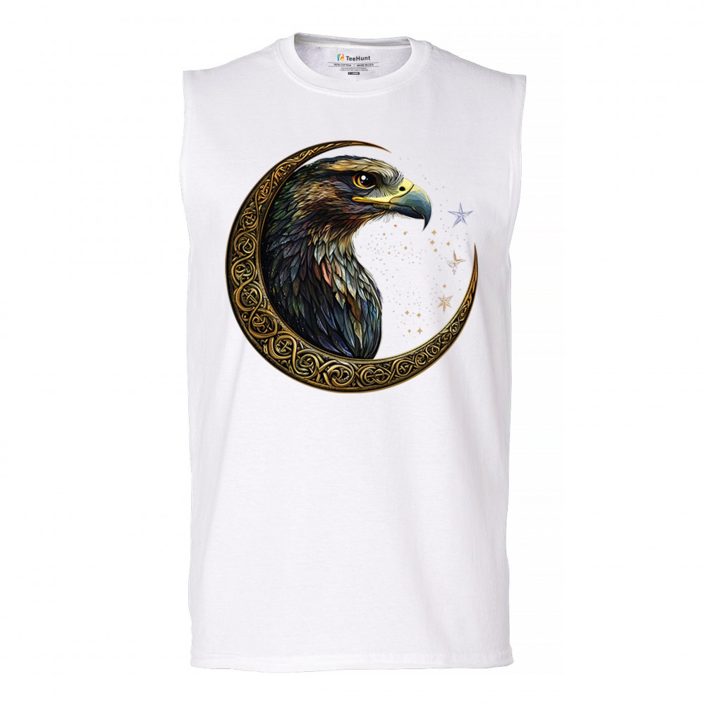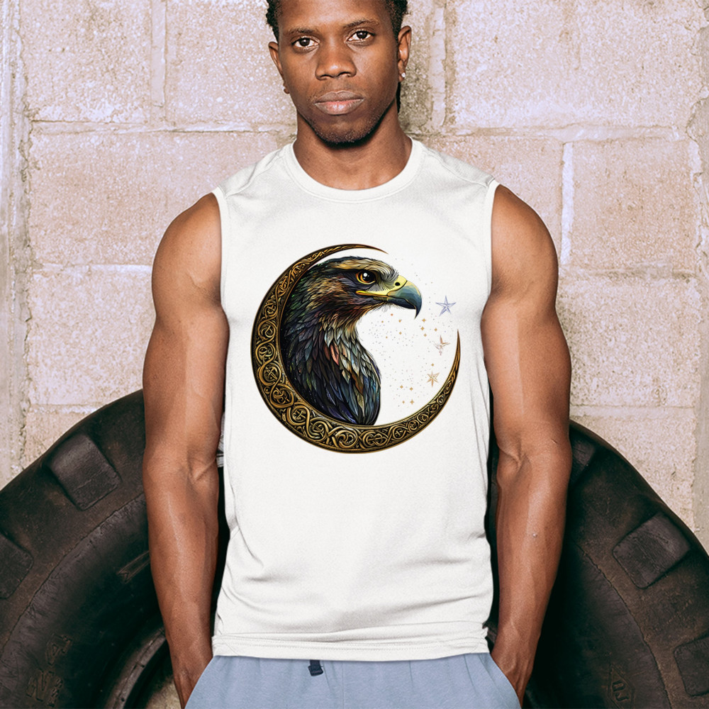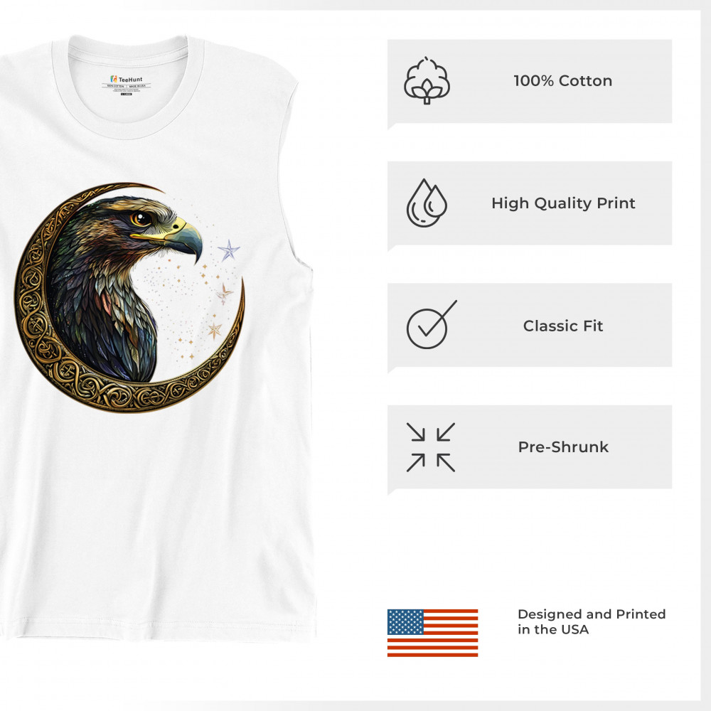 A beautifully detailed eagle with vibrant feathers is framed by a golden Celtic crescent moon and surrounded by a starry cosmic sky. This striking design represents freedom, spiritual power, and the mystery of the skies. Perfect for patriots, bird lovers, and those who connect with nature, tribal symbolism, and celestial art.