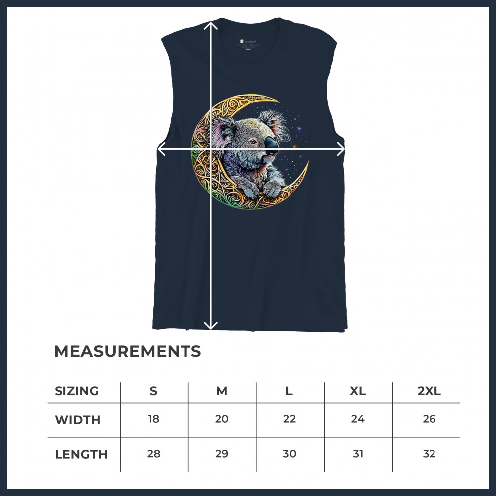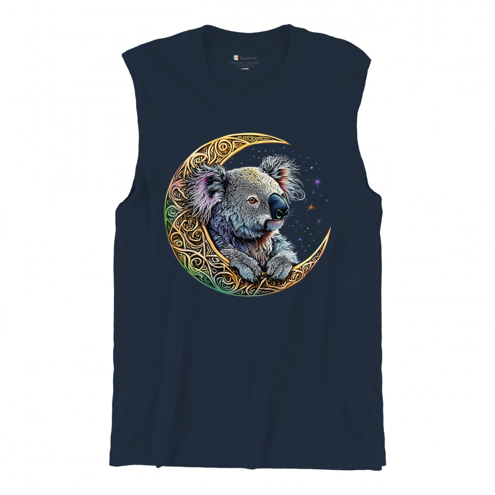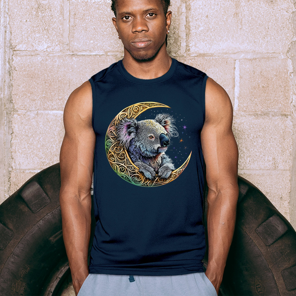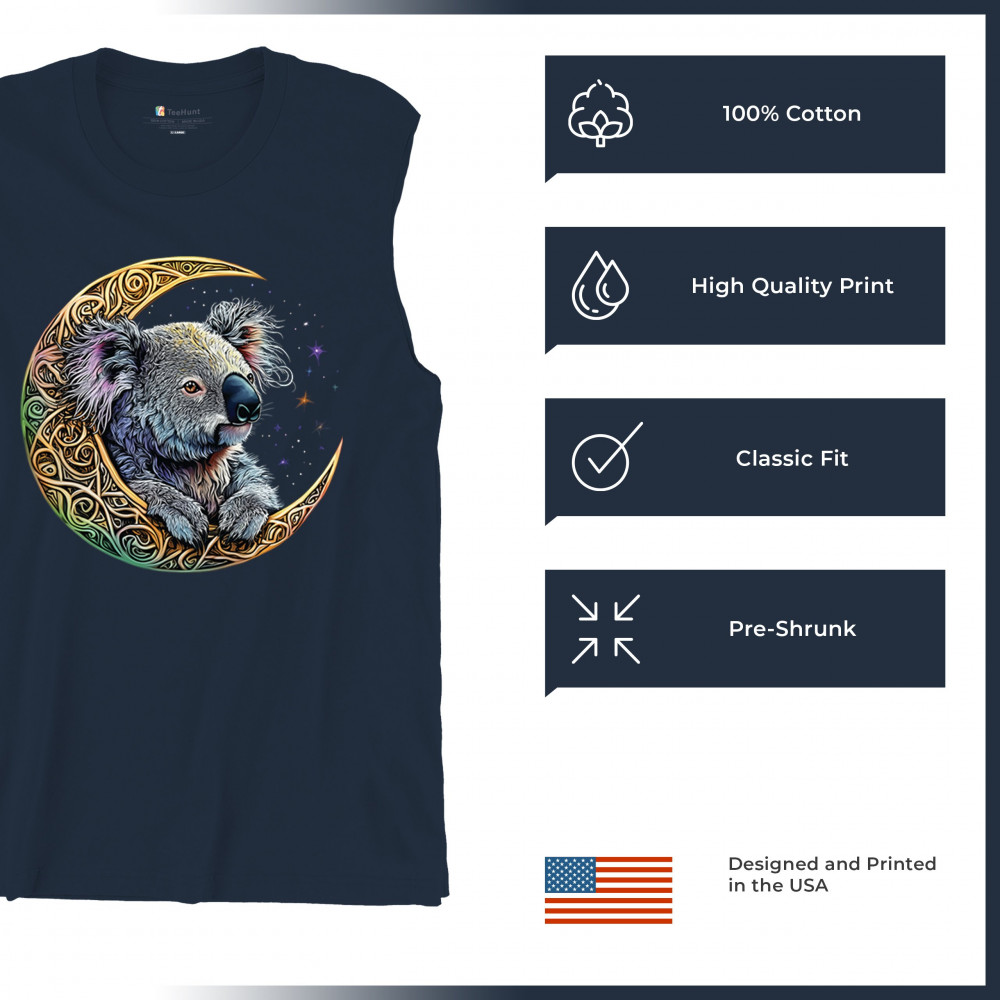 Koala resting in Celtic crescent moon with cosmic sky. A peaceful design for nature lovers, spiritual thinkers, and fantasy art fans.