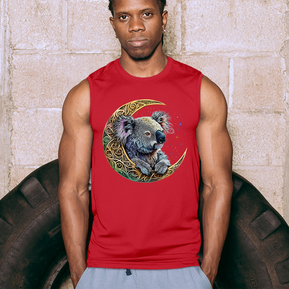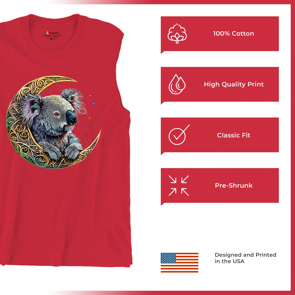 Koala resting in Celtic crescent moon with cosmic sky. A peaceful design for nature lovers, spiritual thinkers, and fantasy art fans.