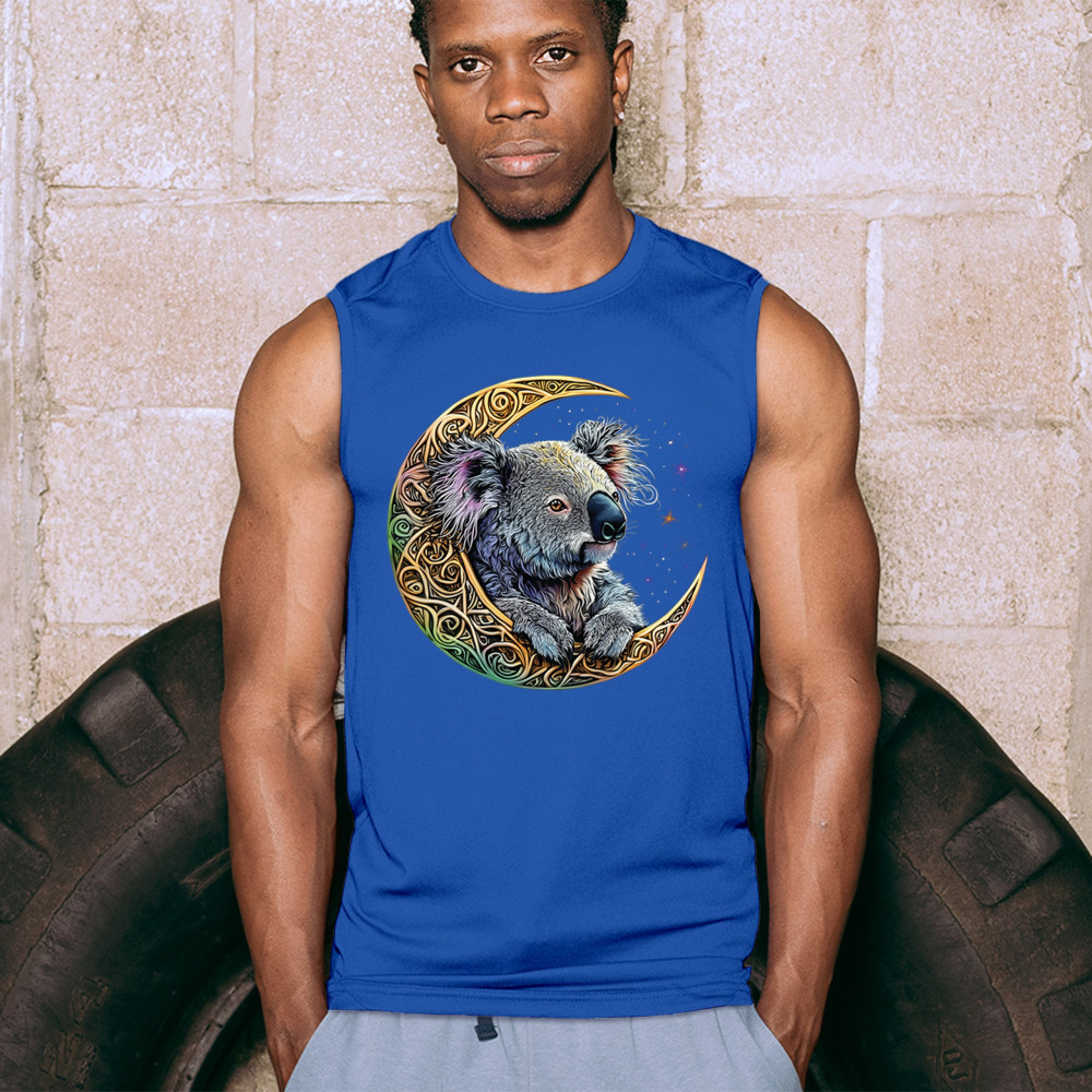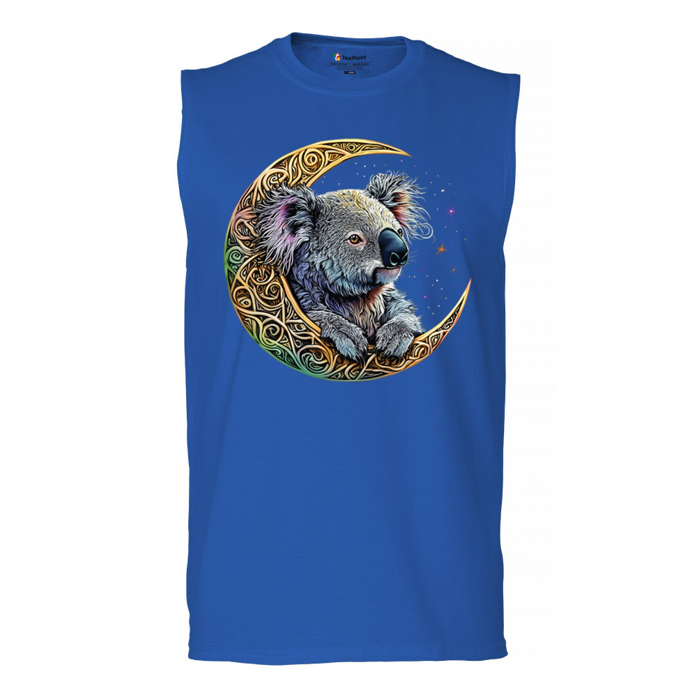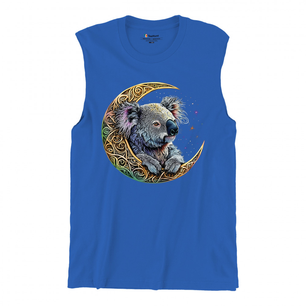 Koala resting in Celtic crescent moon with cosmic sky. A peaceful design for nature lovers, spiritual thinkers, and fantasy art fans.