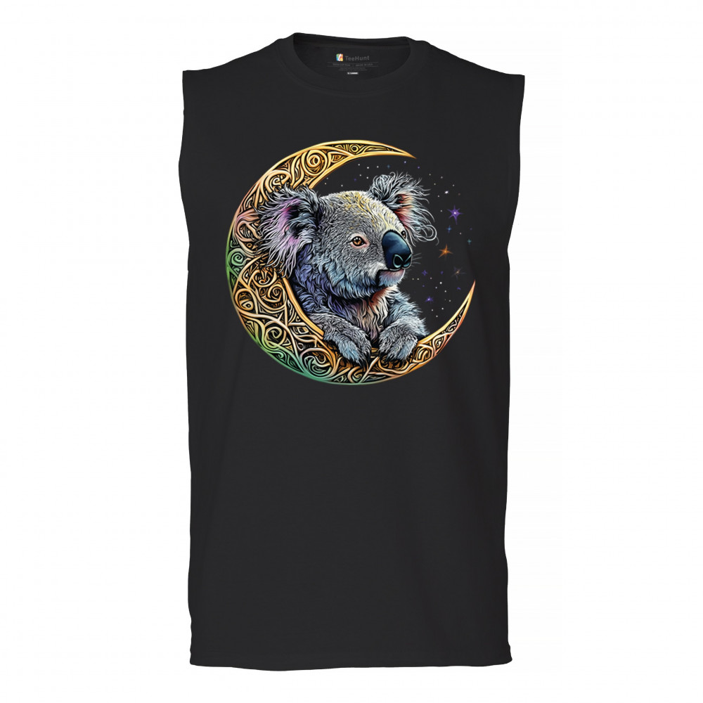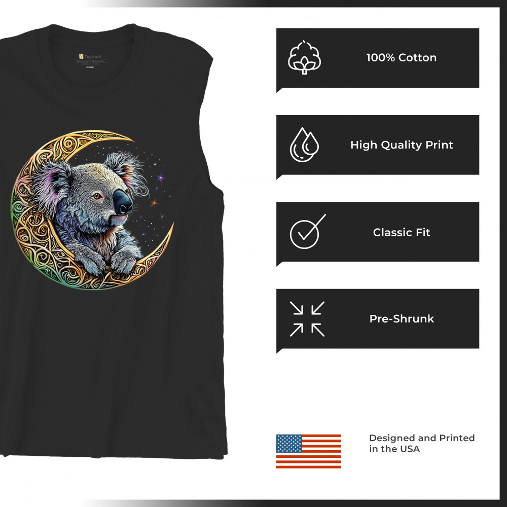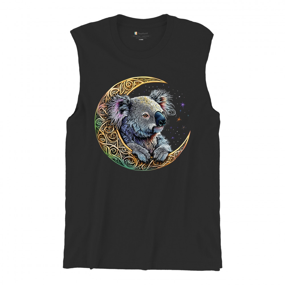 Koala resting in Celtic crescent moon with cosmic sky. A peaceful design for nature lovers, spiritual thinkers, and fantasy art fans.