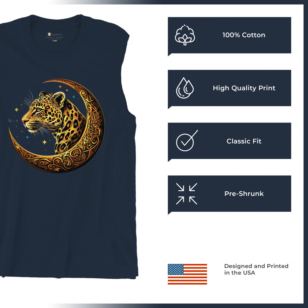Unleash wild energy and spiritual symbolism with this bold leopard design set inside a golden Celtic crescent moon. A cosmic starry background amplifies its mystical vibe, symbolizing agility, independence, and awareness. Perfect for big cat lovers, jungle animal fans, and seekers of fantasy or tribal-inspired art.