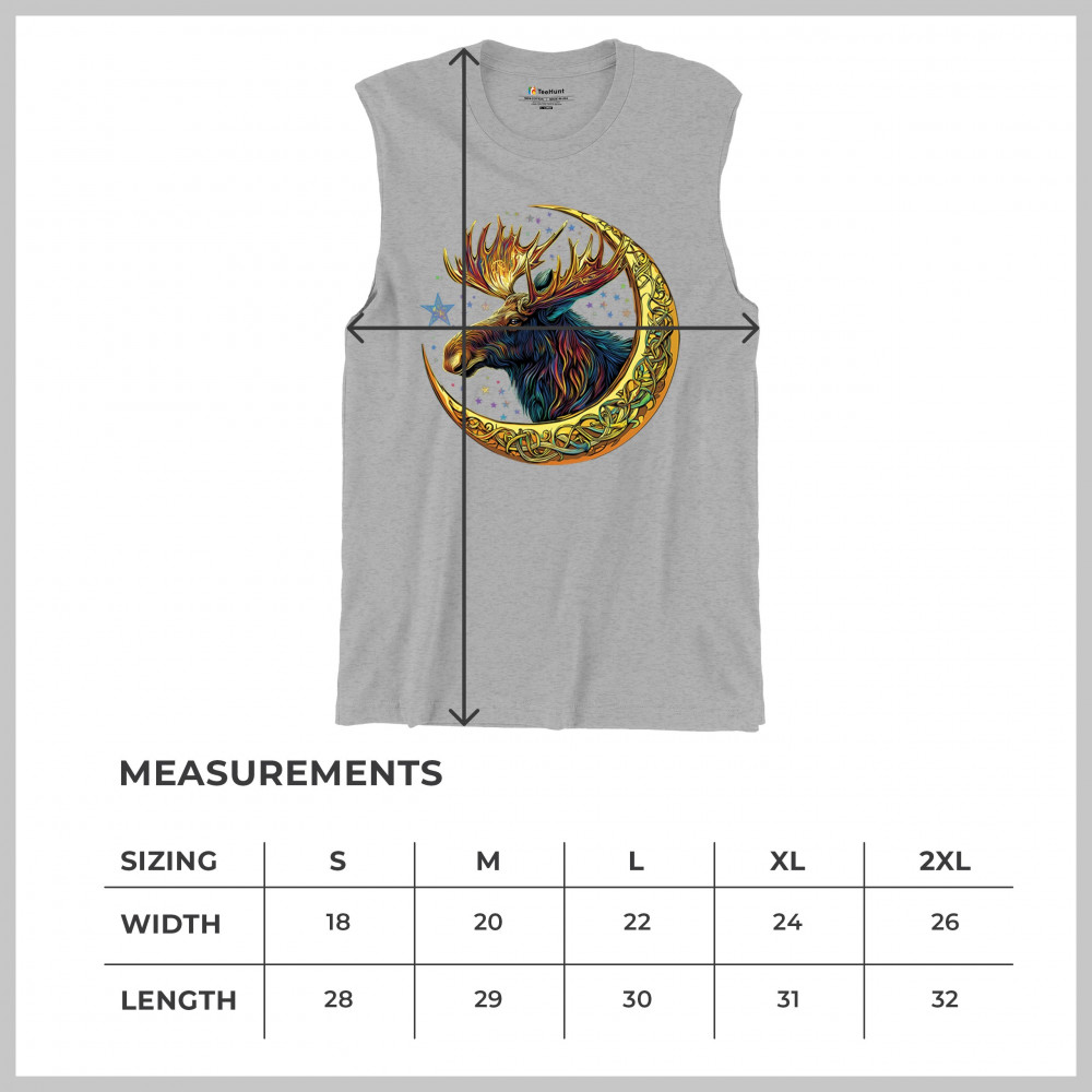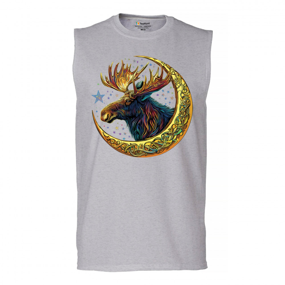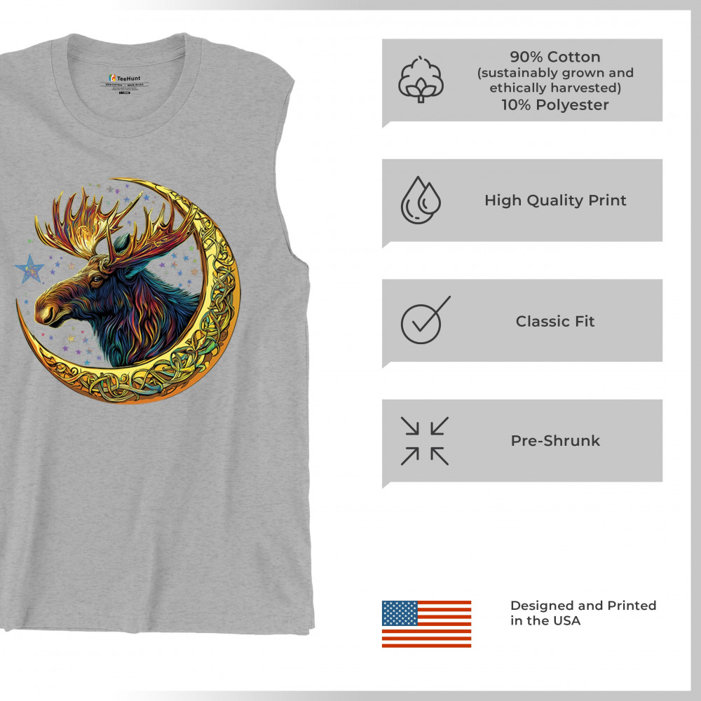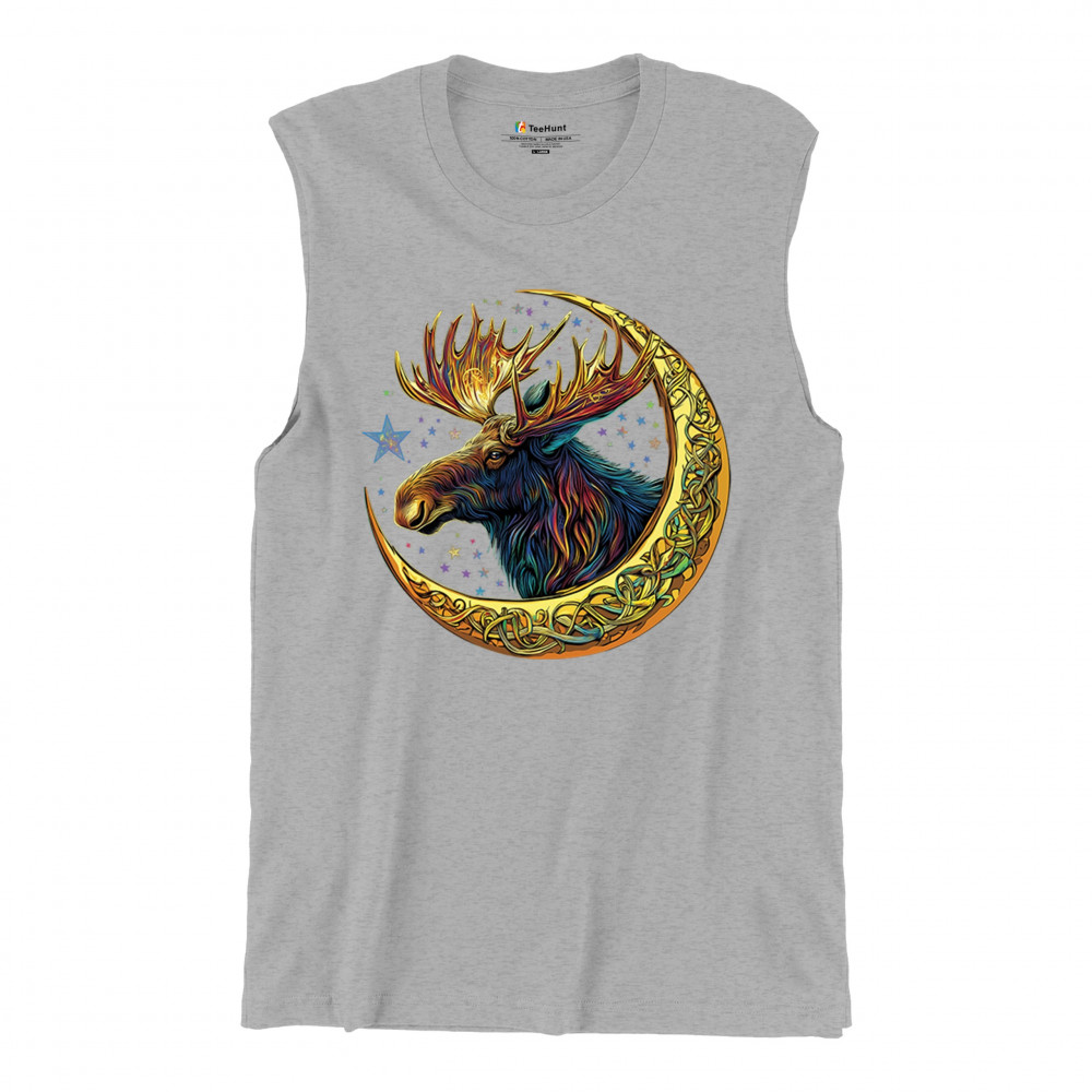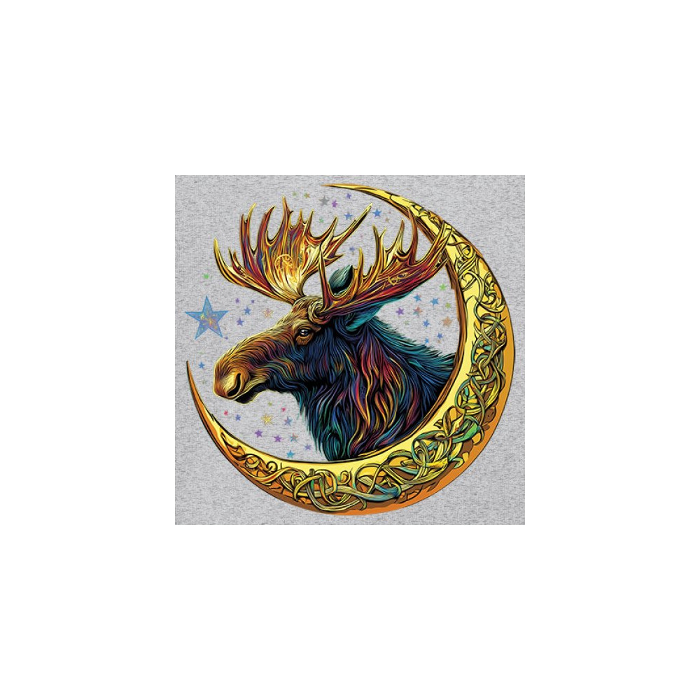 Mystical moose in gold Celtic crescent moon design—symbolizes strength, nature wisdom, and cosmic spirit for fantasy lovers and woodland fans.