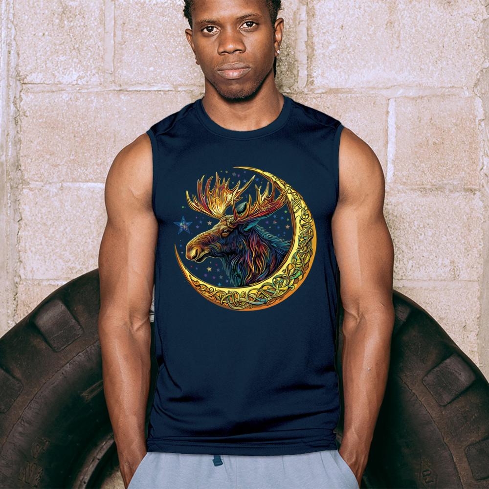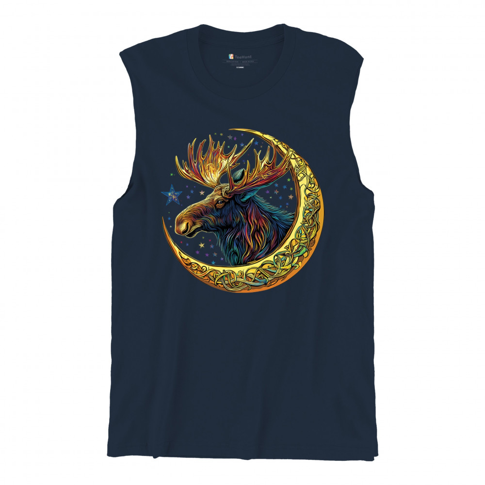 Mystical moose in gold Celtic crescent moon design—symbolizes strength, nature wisdom, and cosmic spirit for fantasy lovers and woodland fans.