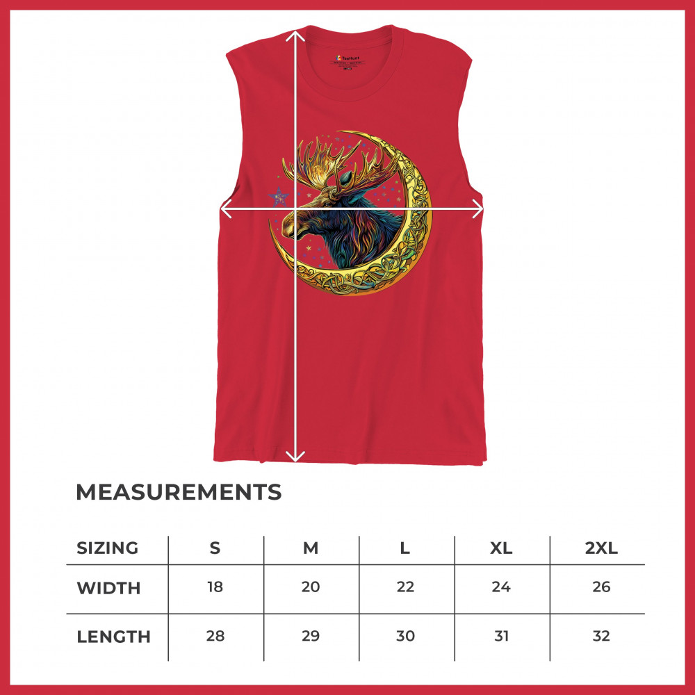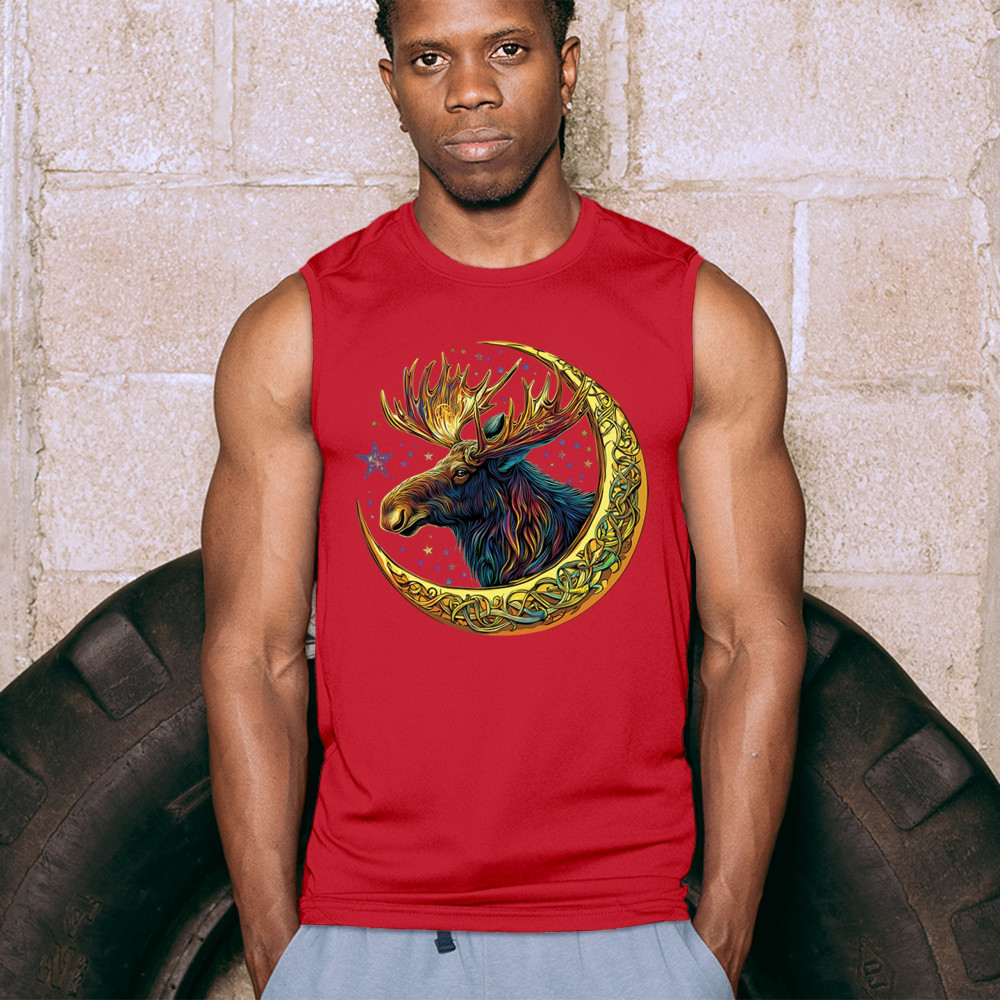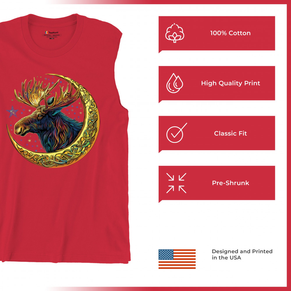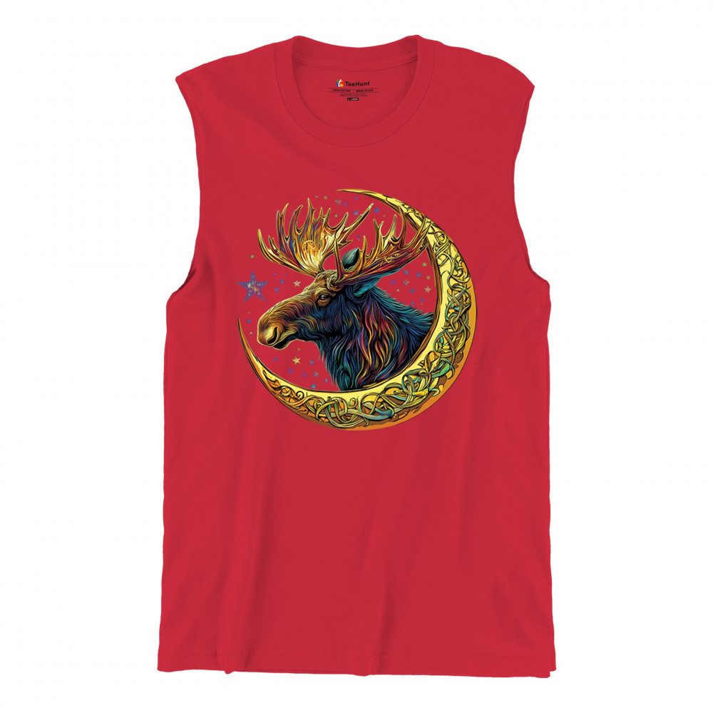 Mystical moose in gold Celtic crescent moon design—symbolizes strength, nature wisdom, and cosmic spirit for fantasy lovers and woodland fans.