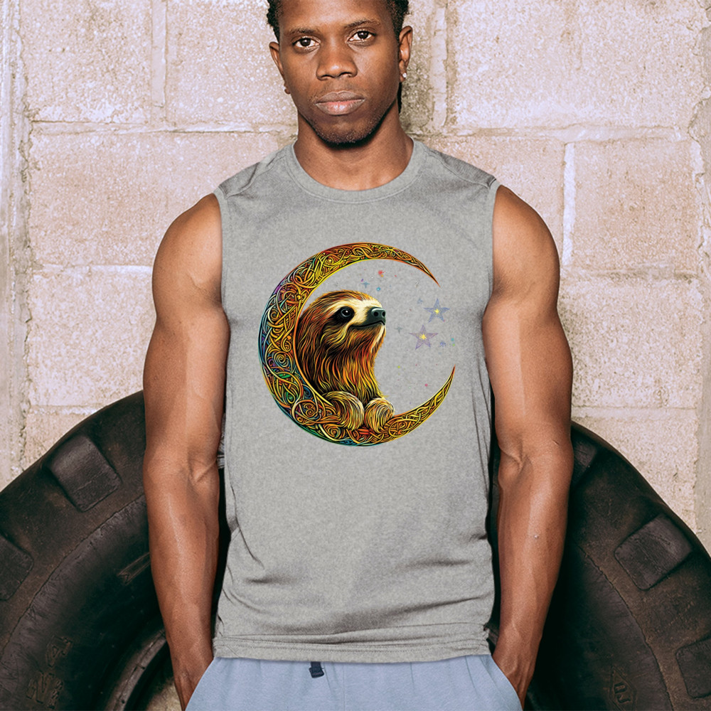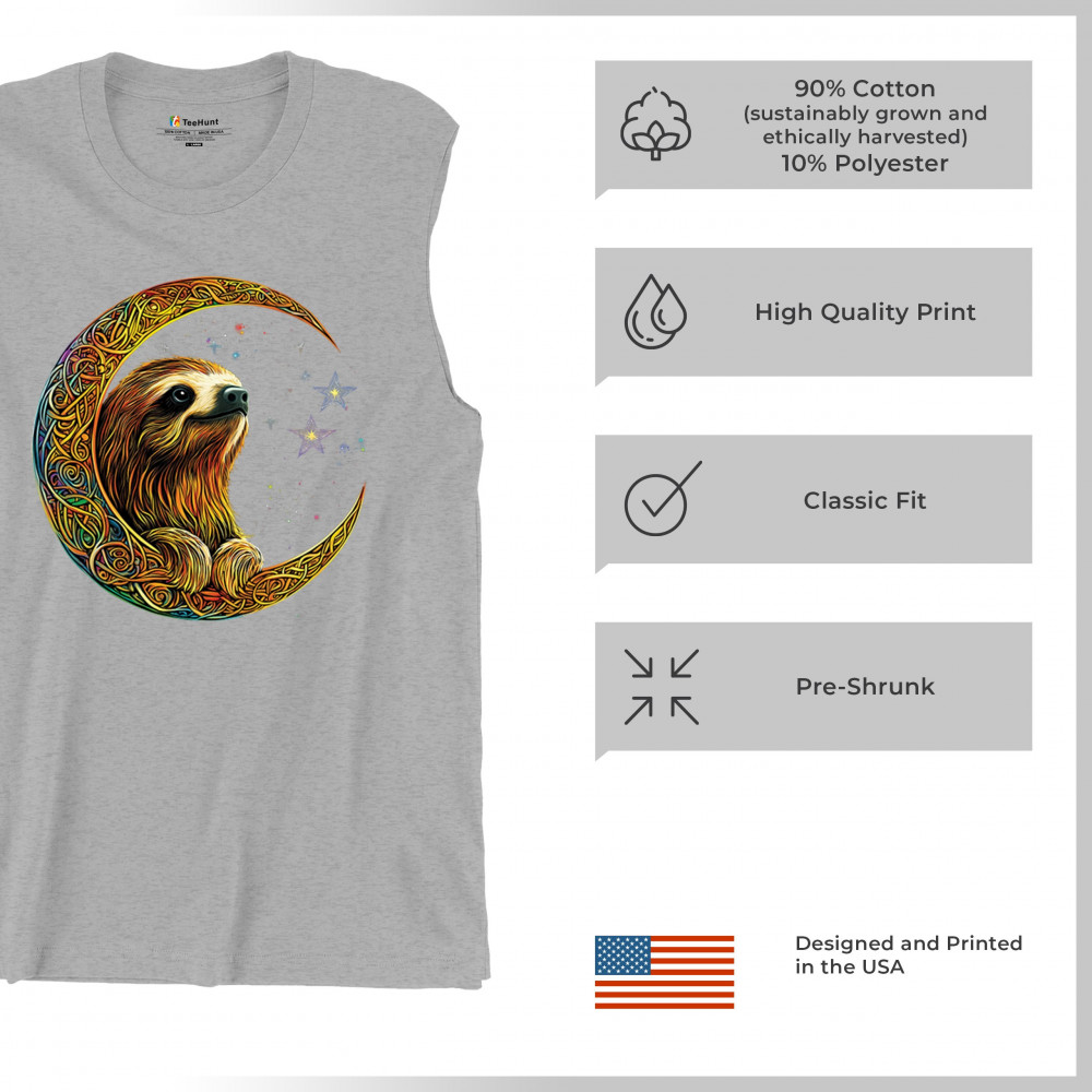 Celebrate peace and presence with this stunning sloth design cradled in a gold Celtic crescent moon. Surrounded by a vibrant starry sky, the image blends jungle whimsy with tribal patterns and mystical vibes. A perfect design for lovers of fantasy animals, mindfulness, and slow living. A beautiful tribute to spiritual stillness and cosmic calm.