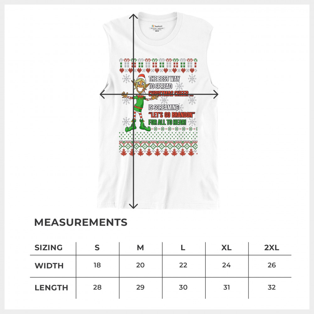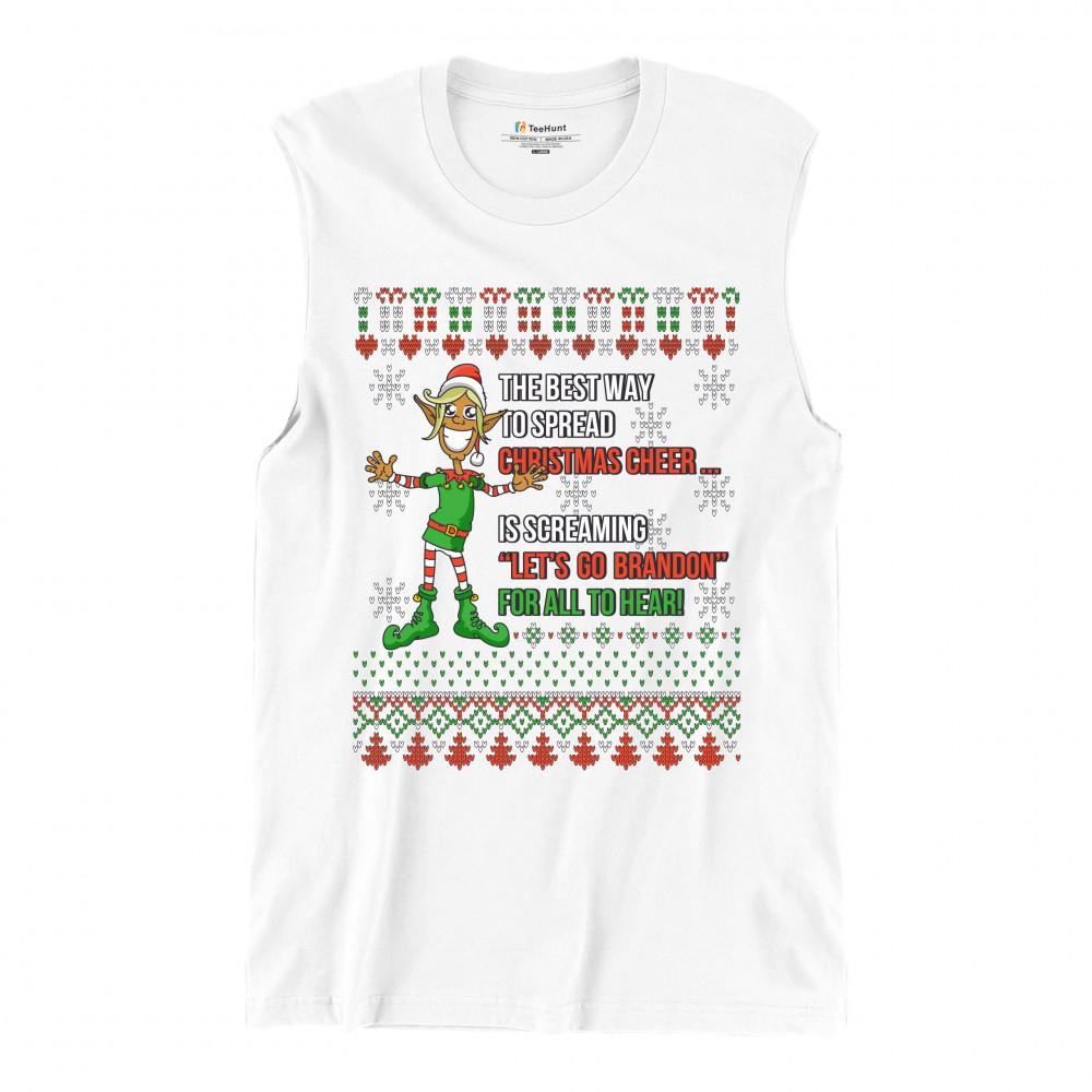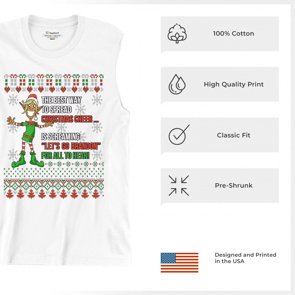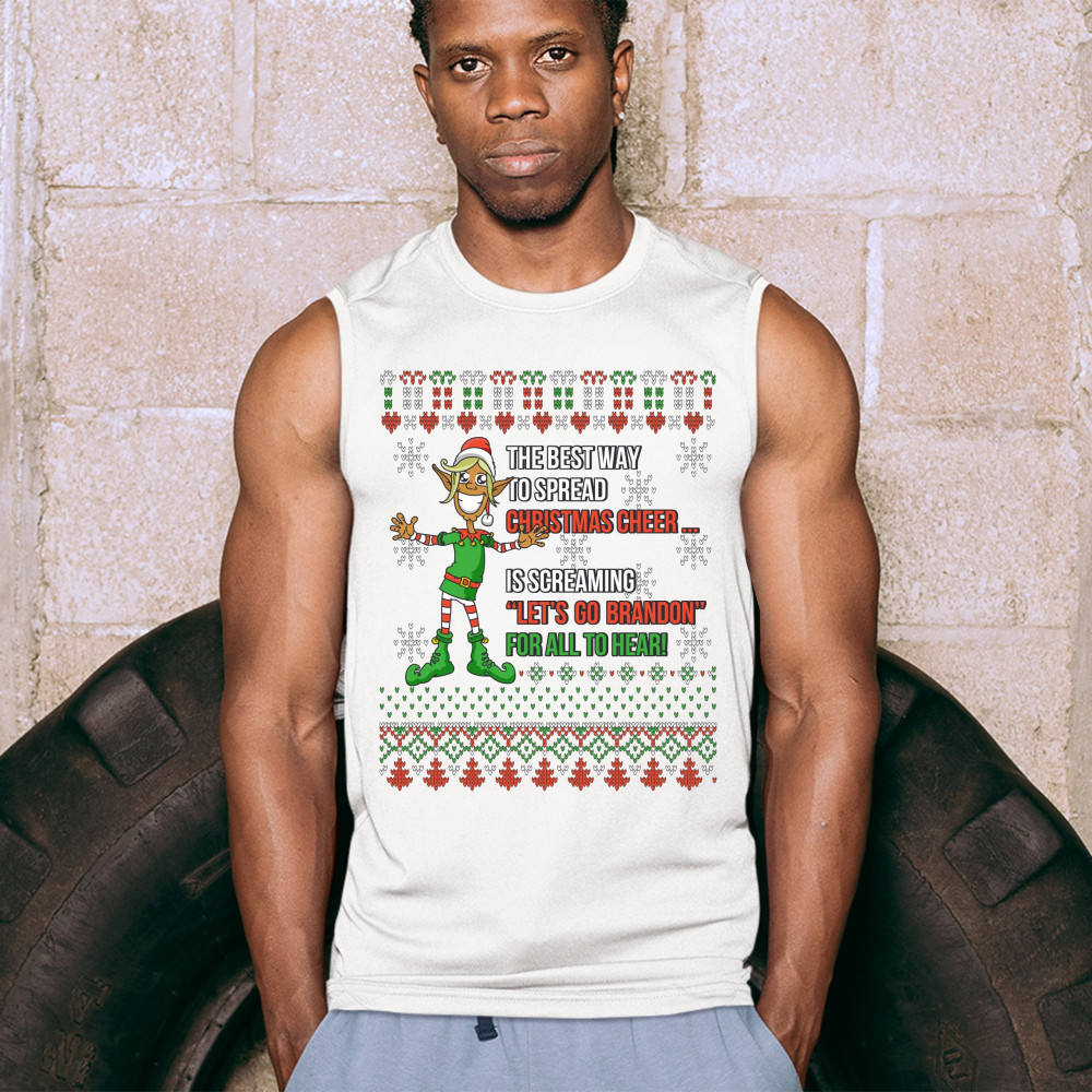 A funny print saying: "The Best Way to Spread Christmas Cheer Is Screaming Let's Go Brandon for All to Hear" and featuring a smiling elf. The print is decorated as a Christmas ugly Sweater. A great choice to wear for a Christmas or New Year's Eve party an