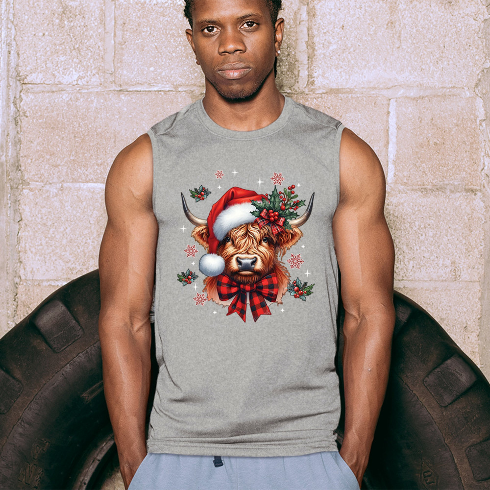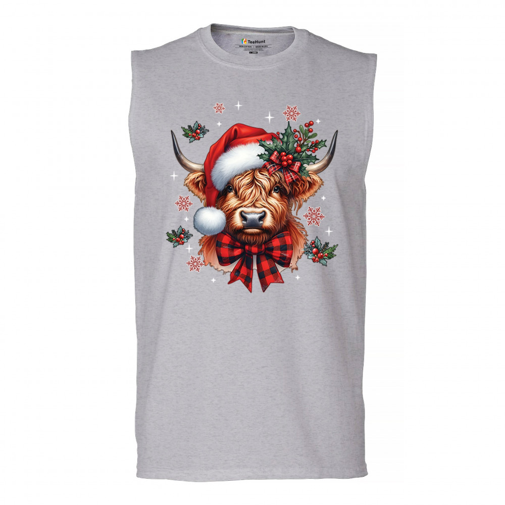 Festive Highland cow Christmas design with Santa hat, plaid bow, holly, and rustic farmhouse holiday charm. Perfect for cozy winter decor.
