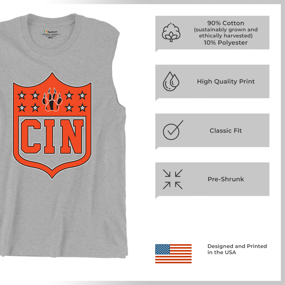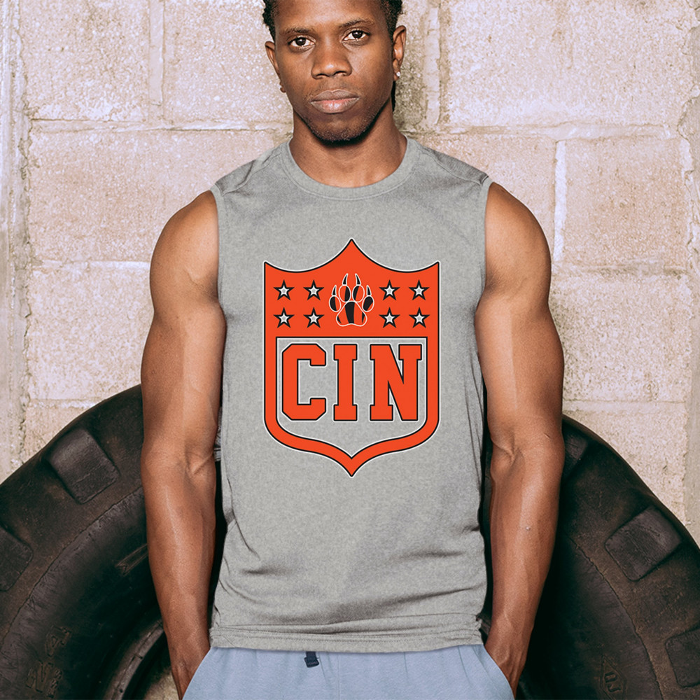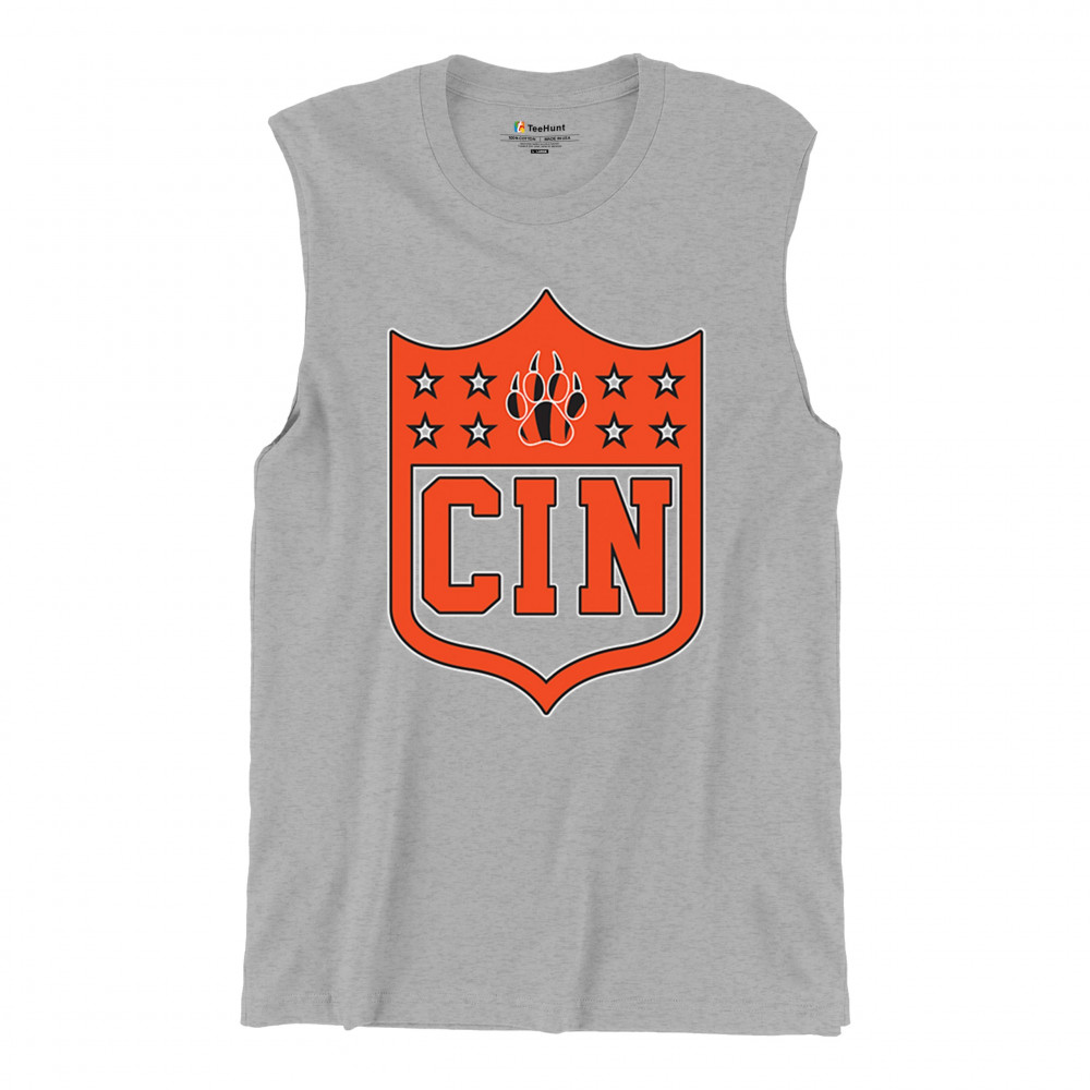 Bold CIN paw shield for Cincinnati football fans. Retro crest style, underdog spirit, and vintage game day gear for true Cincinnati grit.