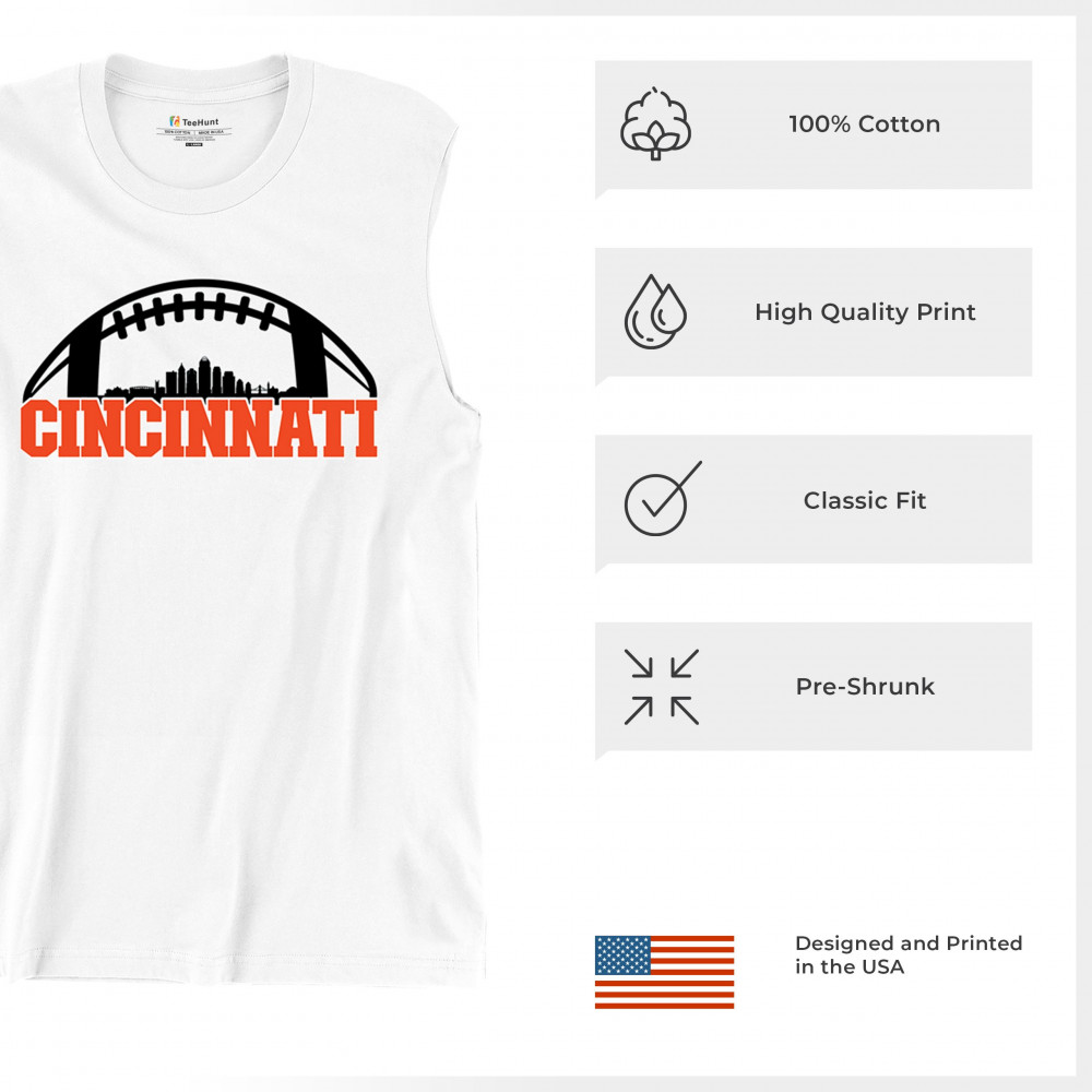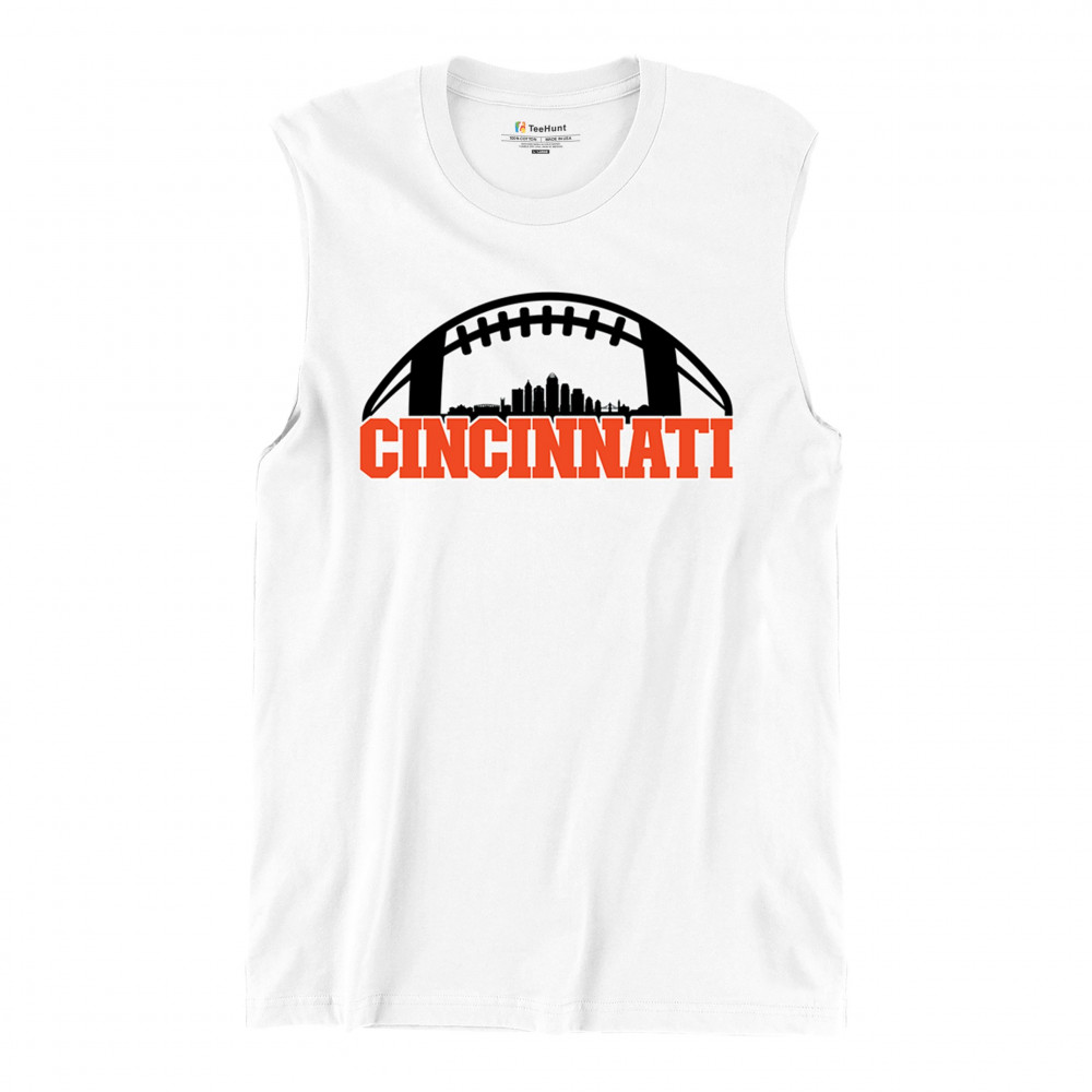 Celebrate Cincinnati and football with this bold skyline design under a football arch. Perfect for fans, tailgates, and game days!