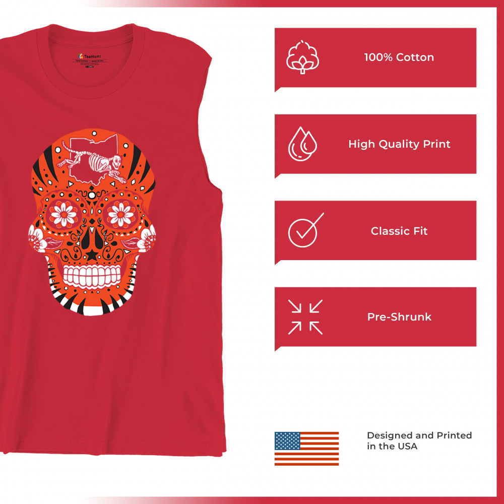 Cinci Sugar Skull with Queen City Paw, underdog grit, black & orange pride, Game Day energy, and playoff vibes.