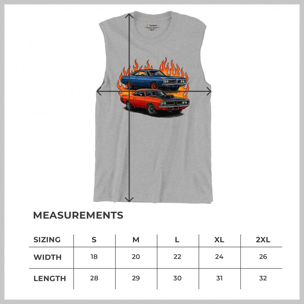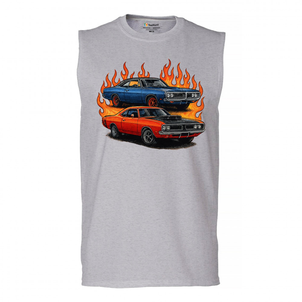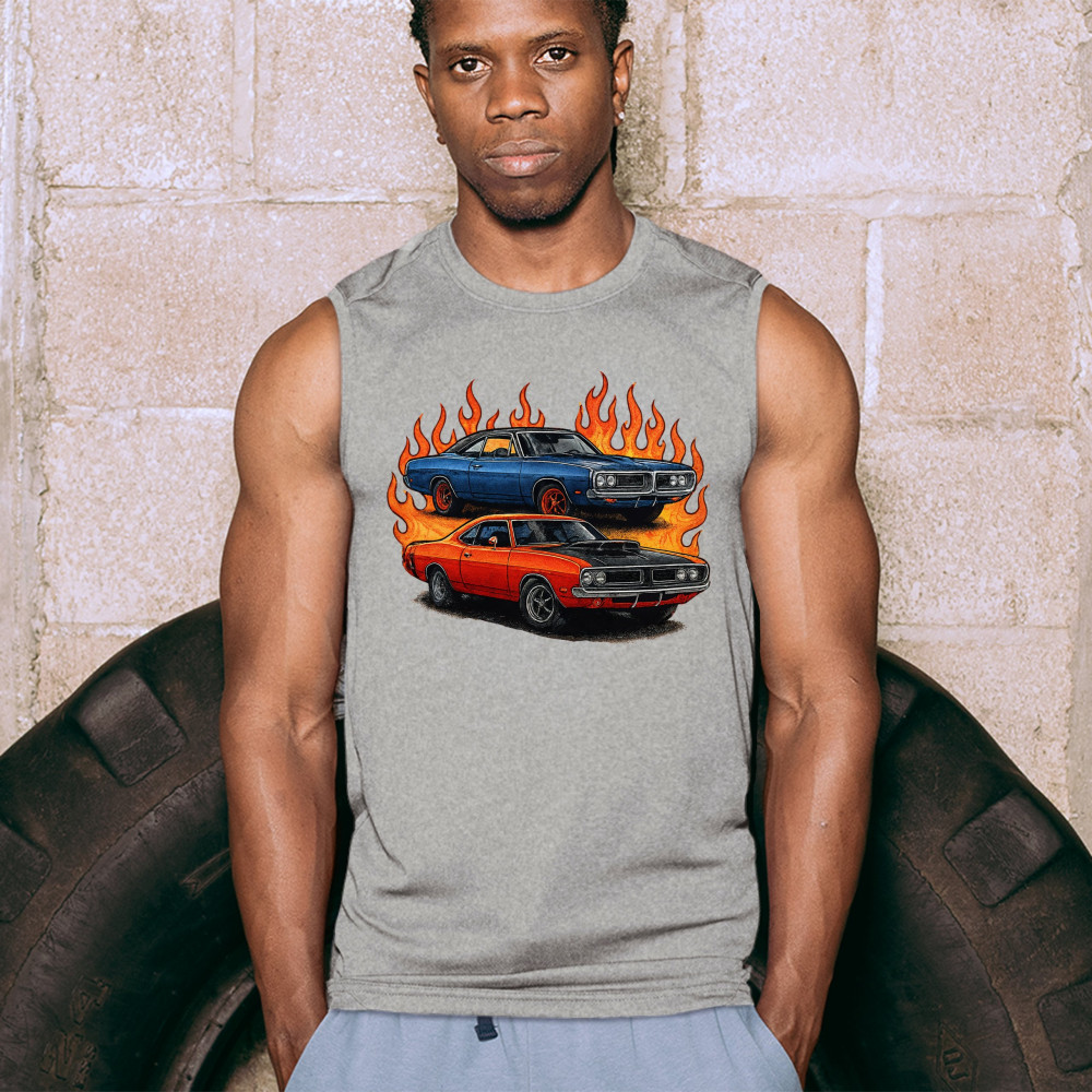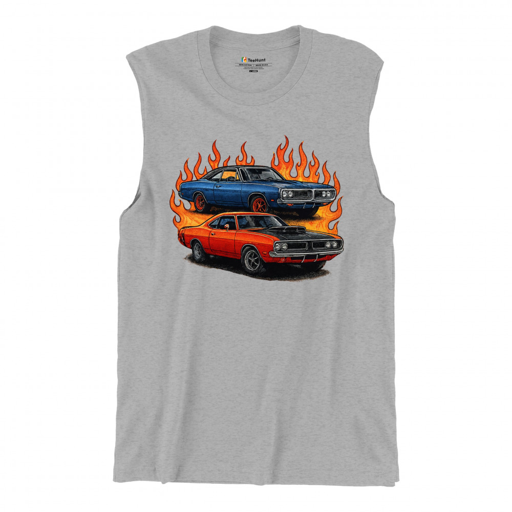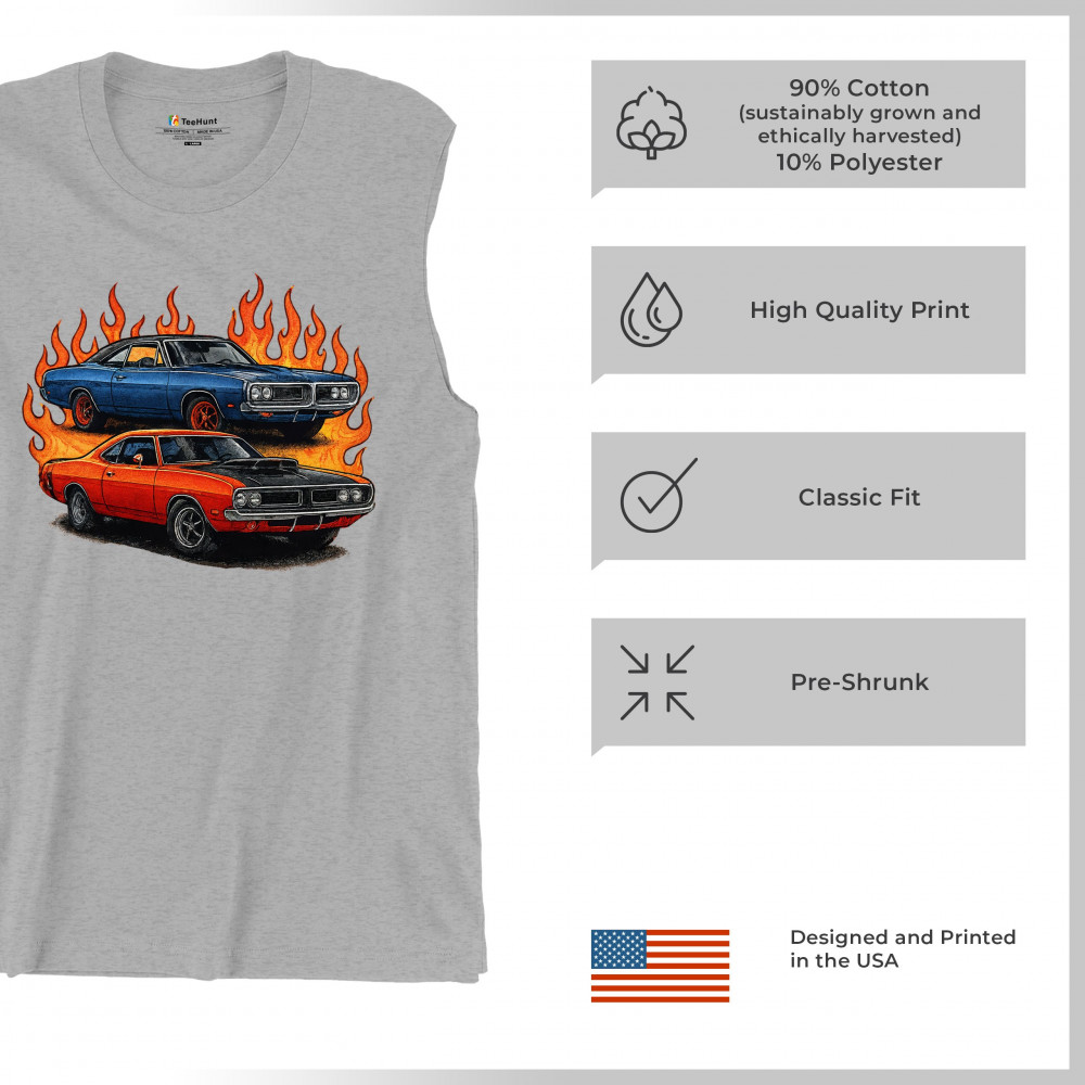 Bold flame design with classic muscle cars for gearheads and vintage horsepower lovers. Perfect for shows, cruise meets, and burnout nights.