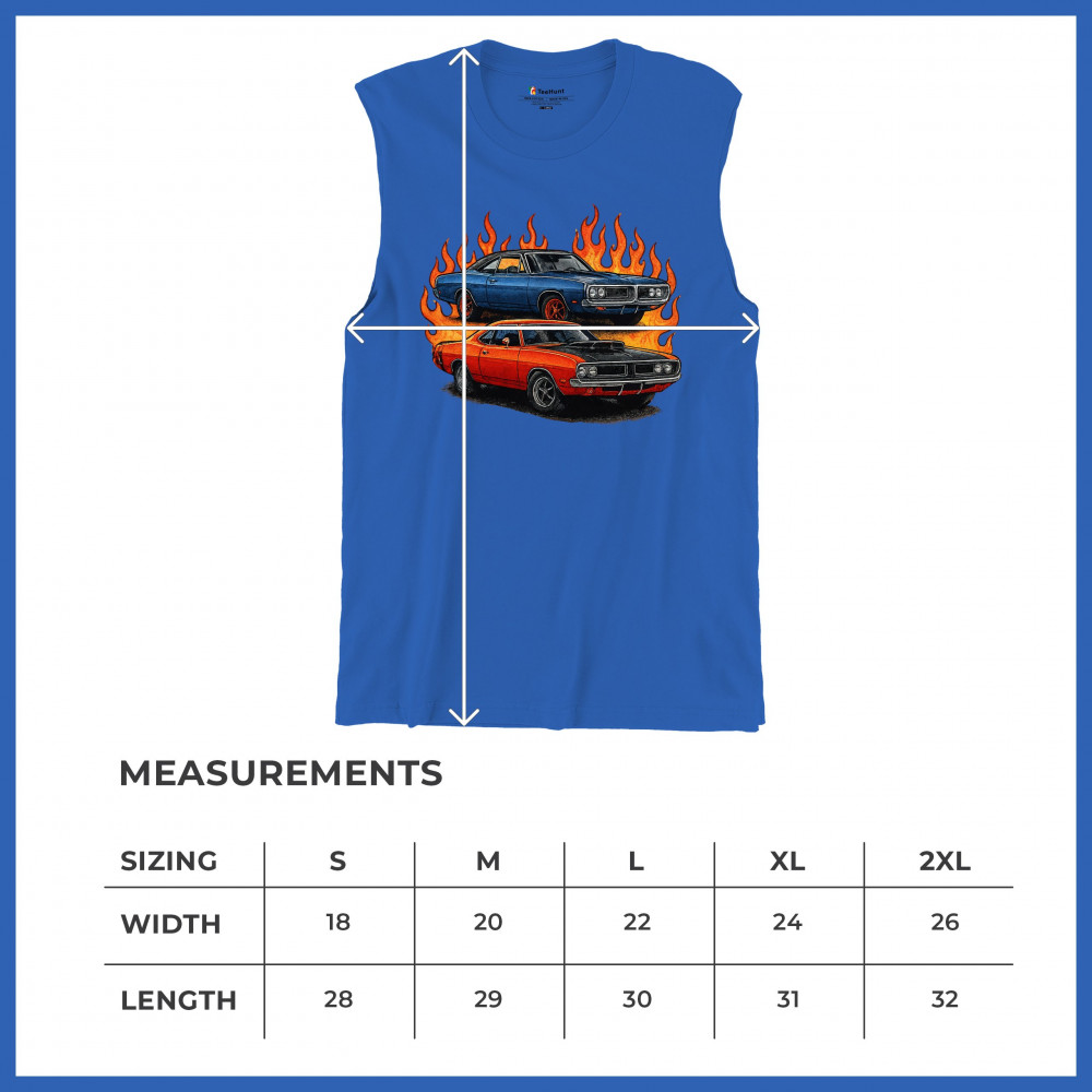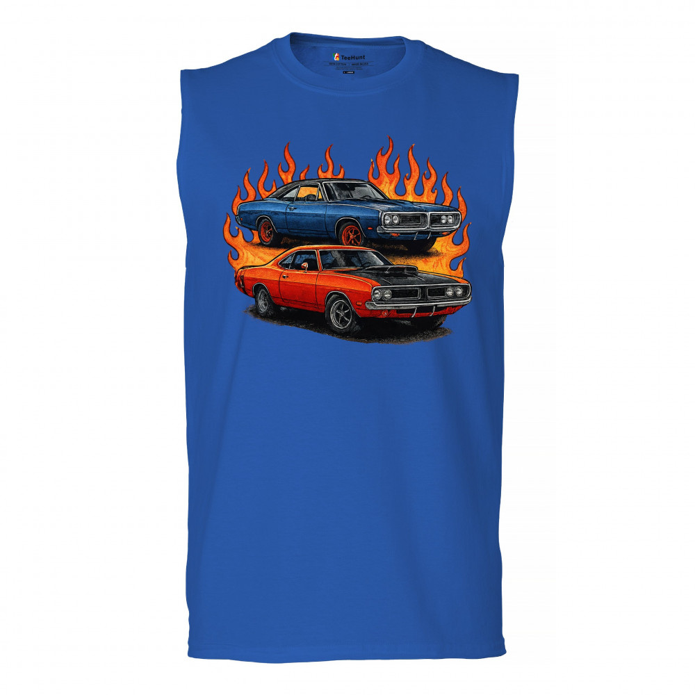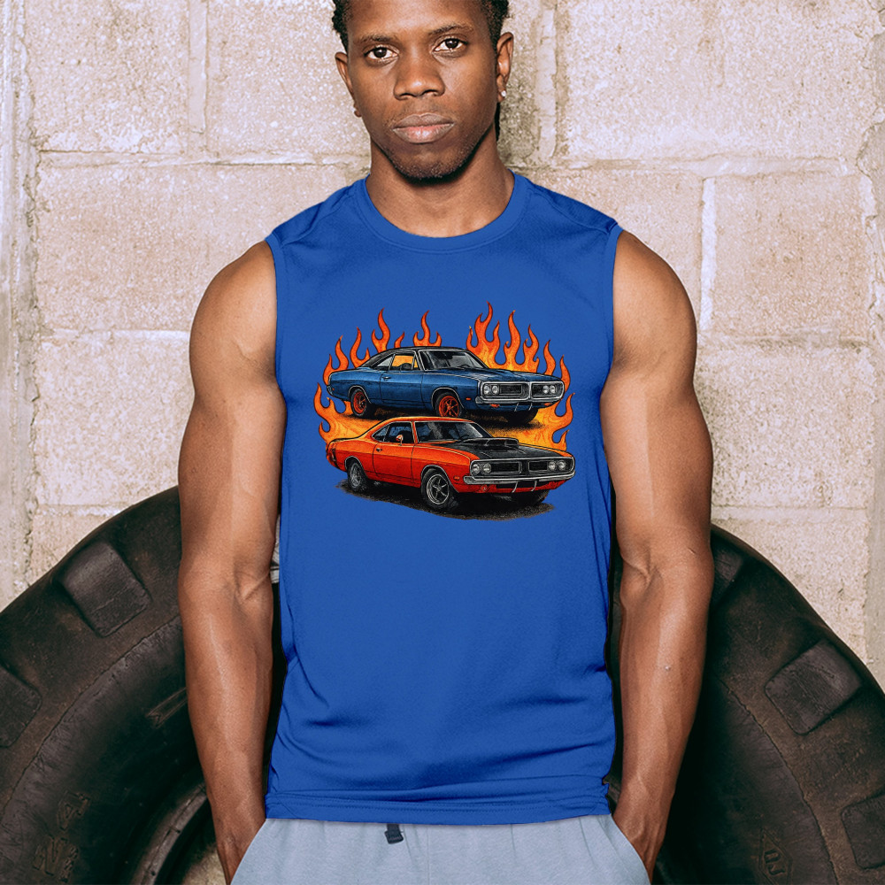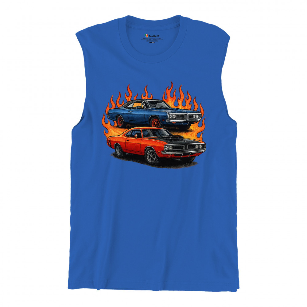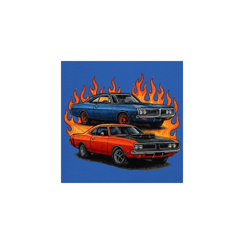 Bold flame design with classic muscle cars for gearheads and vintage horsepower lovers. Perfect for shows, cruise meets, and burnout nights.