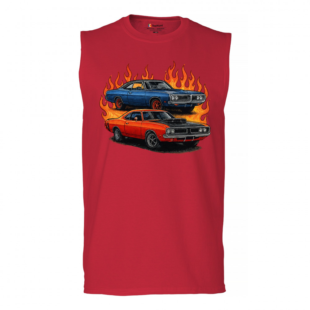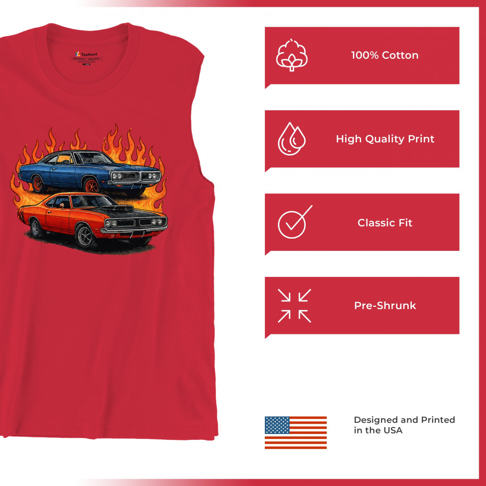 Bold flame design with classic muscle cars for gearheads and vintage horsepower lovers. Perfect for shows, cruise meets, and burnout nights.
