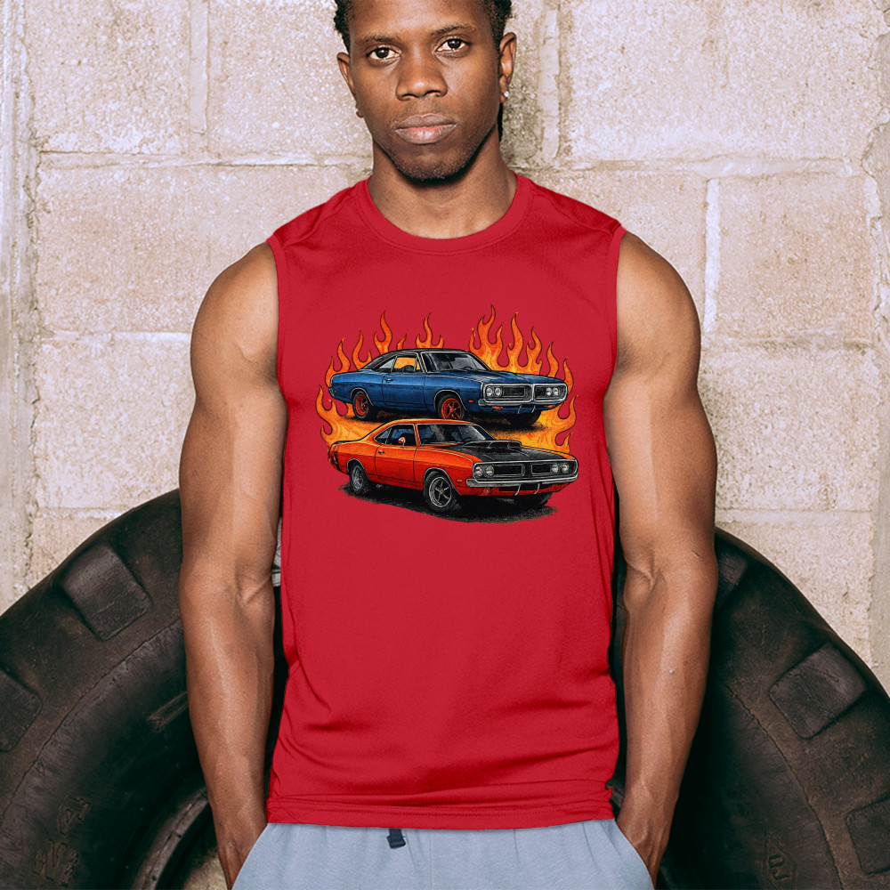 This flame-wrapped design showcases two classic muscle cars set ablaze with attitude, style, and vintage horsepower. Made for adrenaline seekers, rev heads, and car lovers who thrive on raw speed and retro fire. Whether at a burnout meet or a car show, this design lets your muscle car pride burn bright.