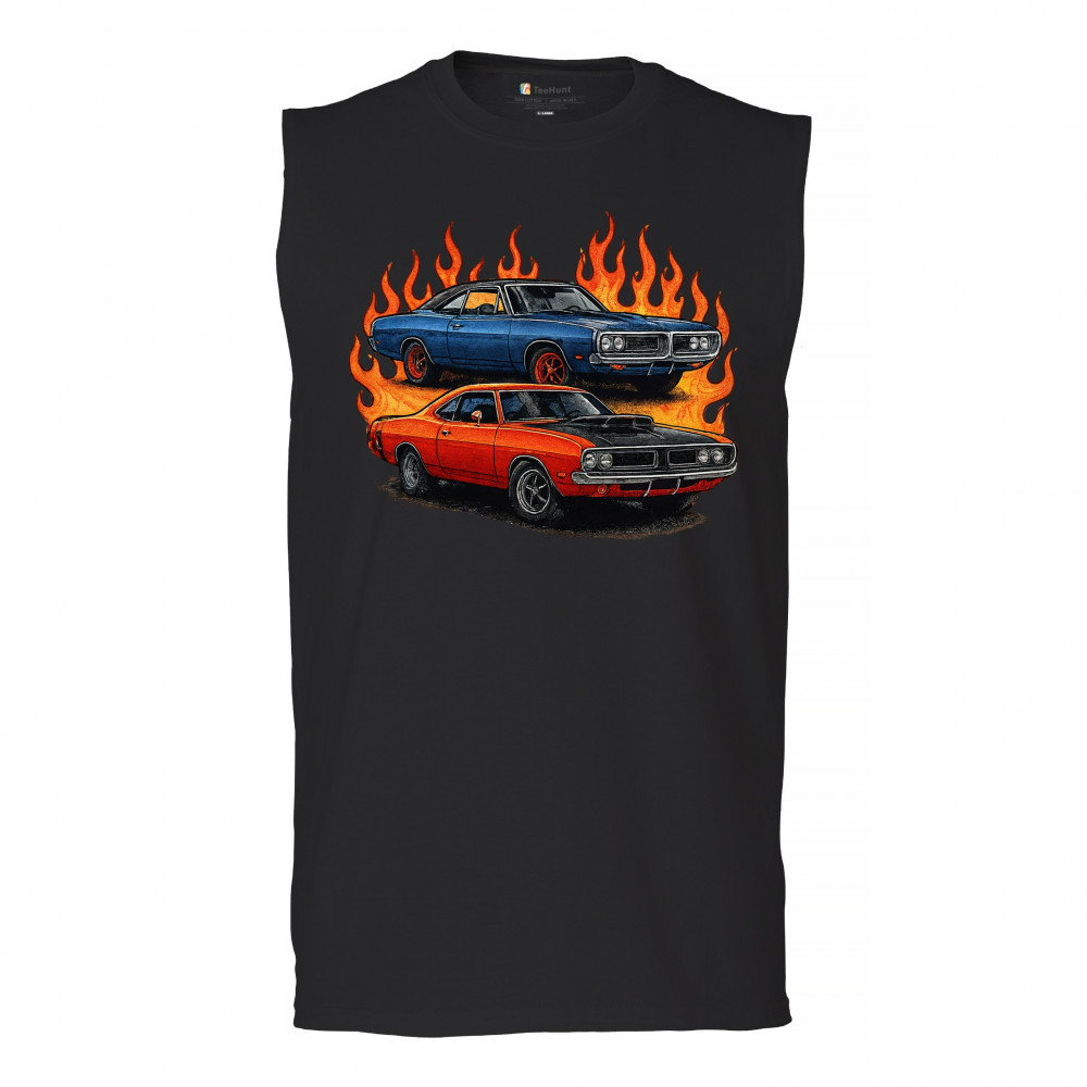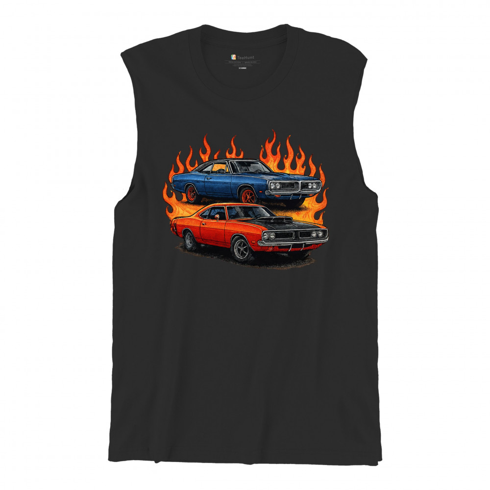 Bold flame design with classic muscle cars for gearheads and vintage horsepower lovers. Perfect for shows, cruise meets, and burnout nights.