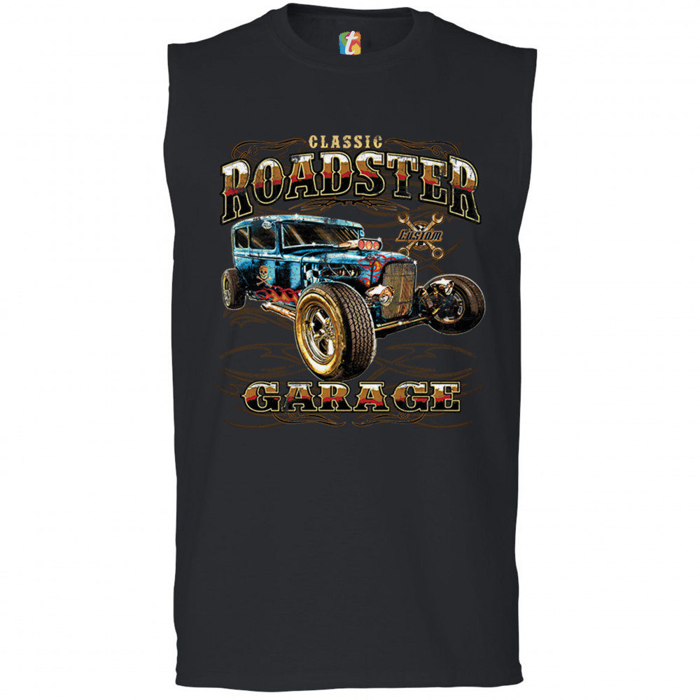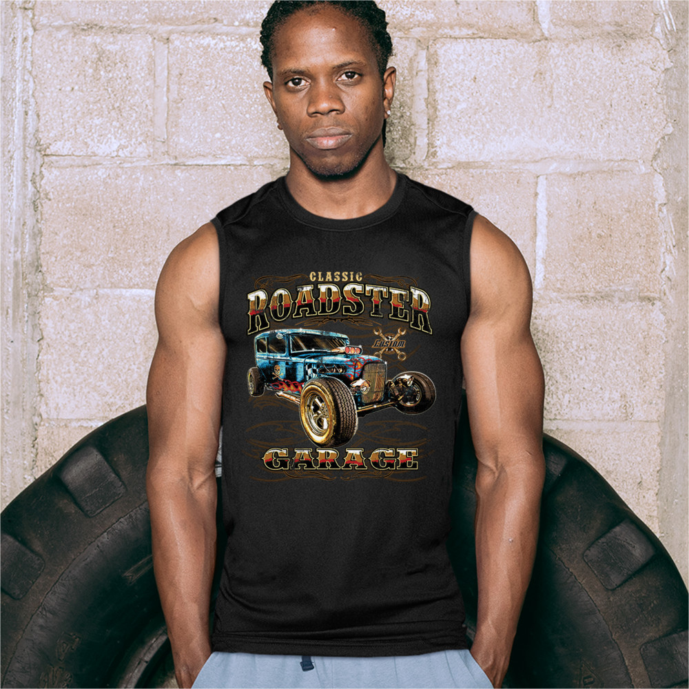 A print featuring a vintage-looking rat rod with flames and a skull with crossbones painted on it's side. "Classic Roadster" is written in the top and "Garage" in the bottom of the print. In the background there is a sign with crossed wrenches which says "custom". Great for Route 66 and hot rod fans.