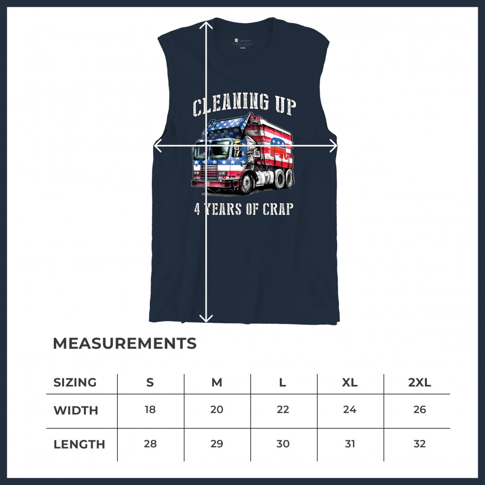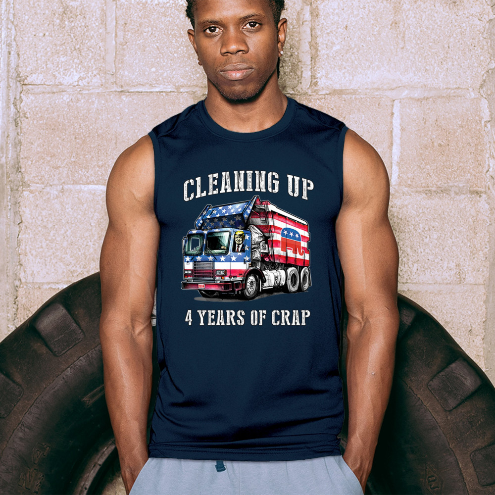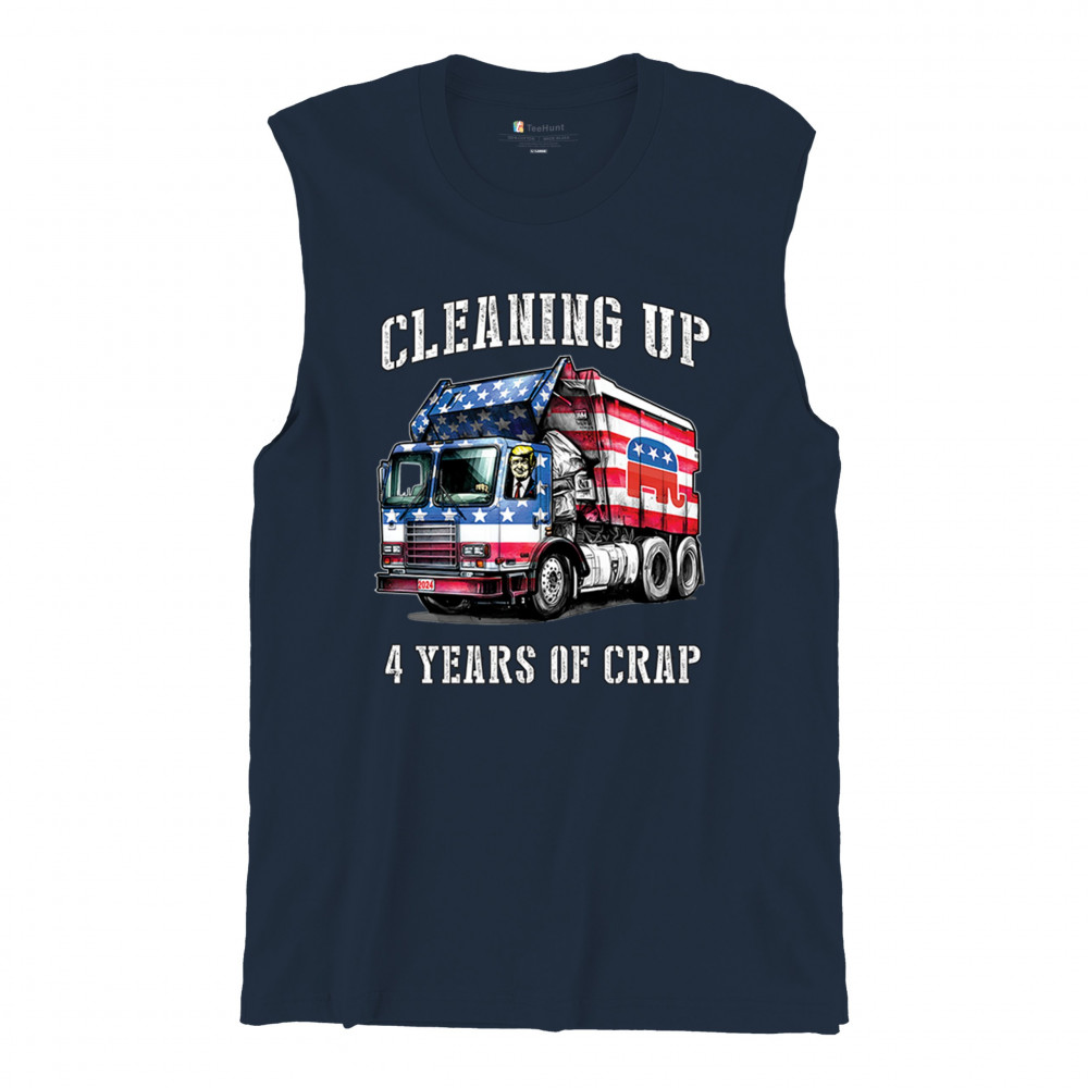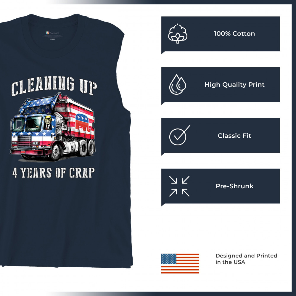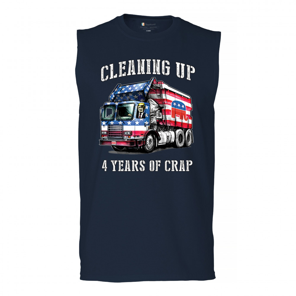 Bold "Cleaning Up 4 Years of Crap" design featuring Trump, the GOP, and the American flag. Perfect for proud conservatives and patriots.