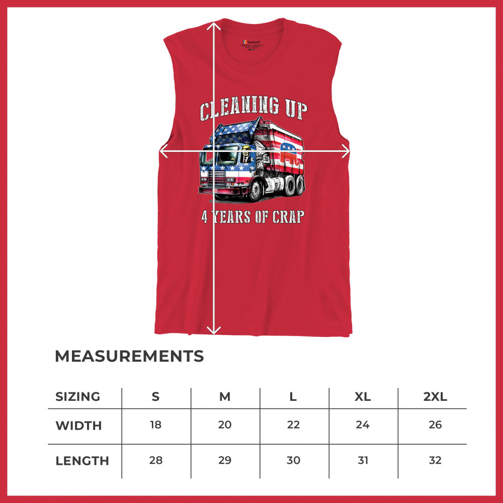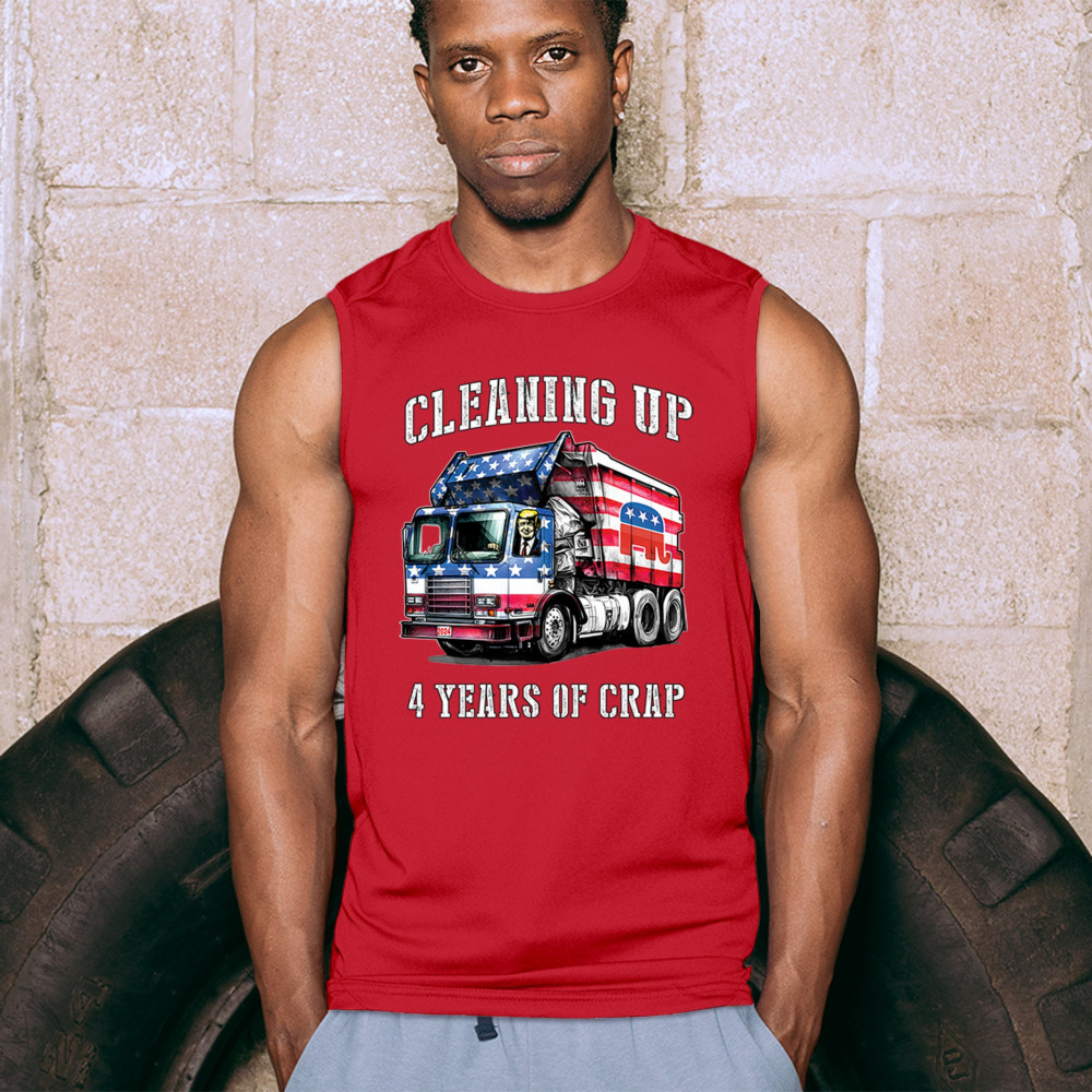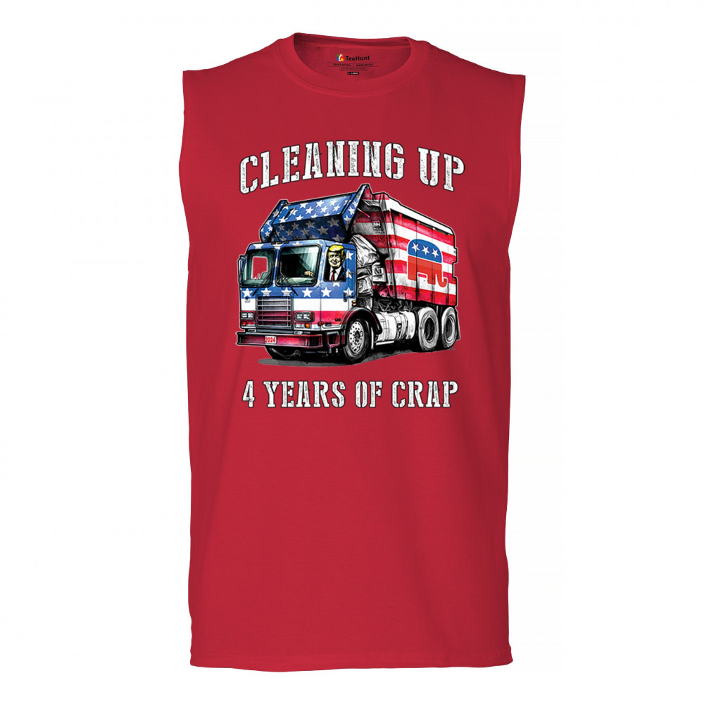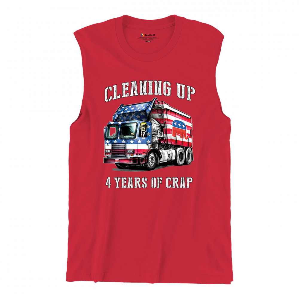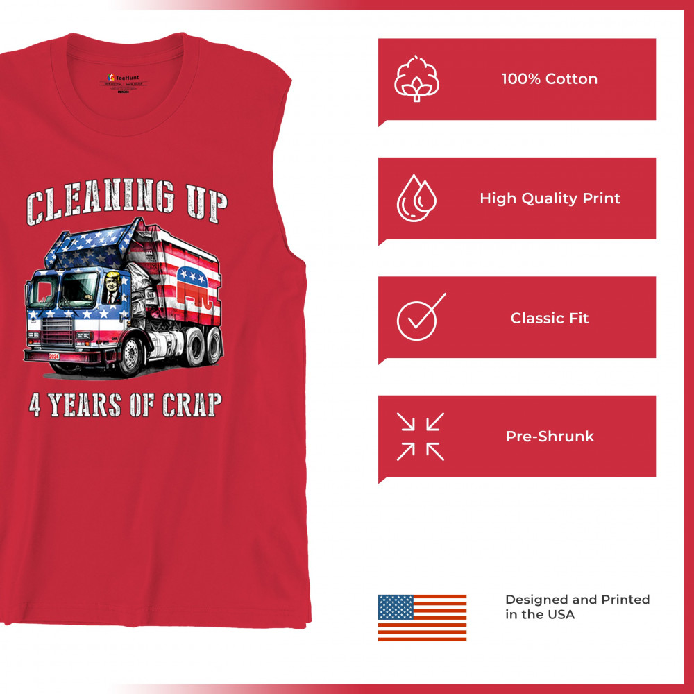 Bold "Cleaning Up 4 Years of Crap" design featuring Trump, the GOP, and the American flag. Perfect for proud conservatives and patriots.