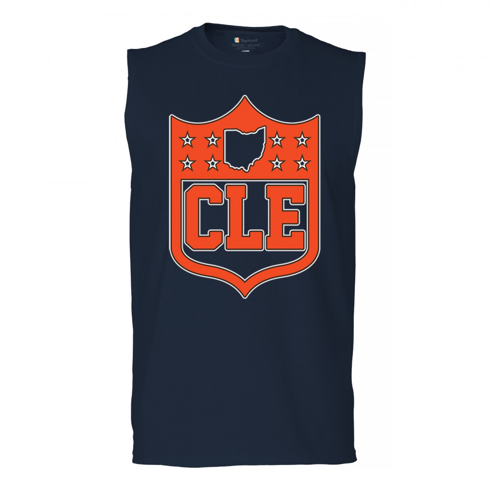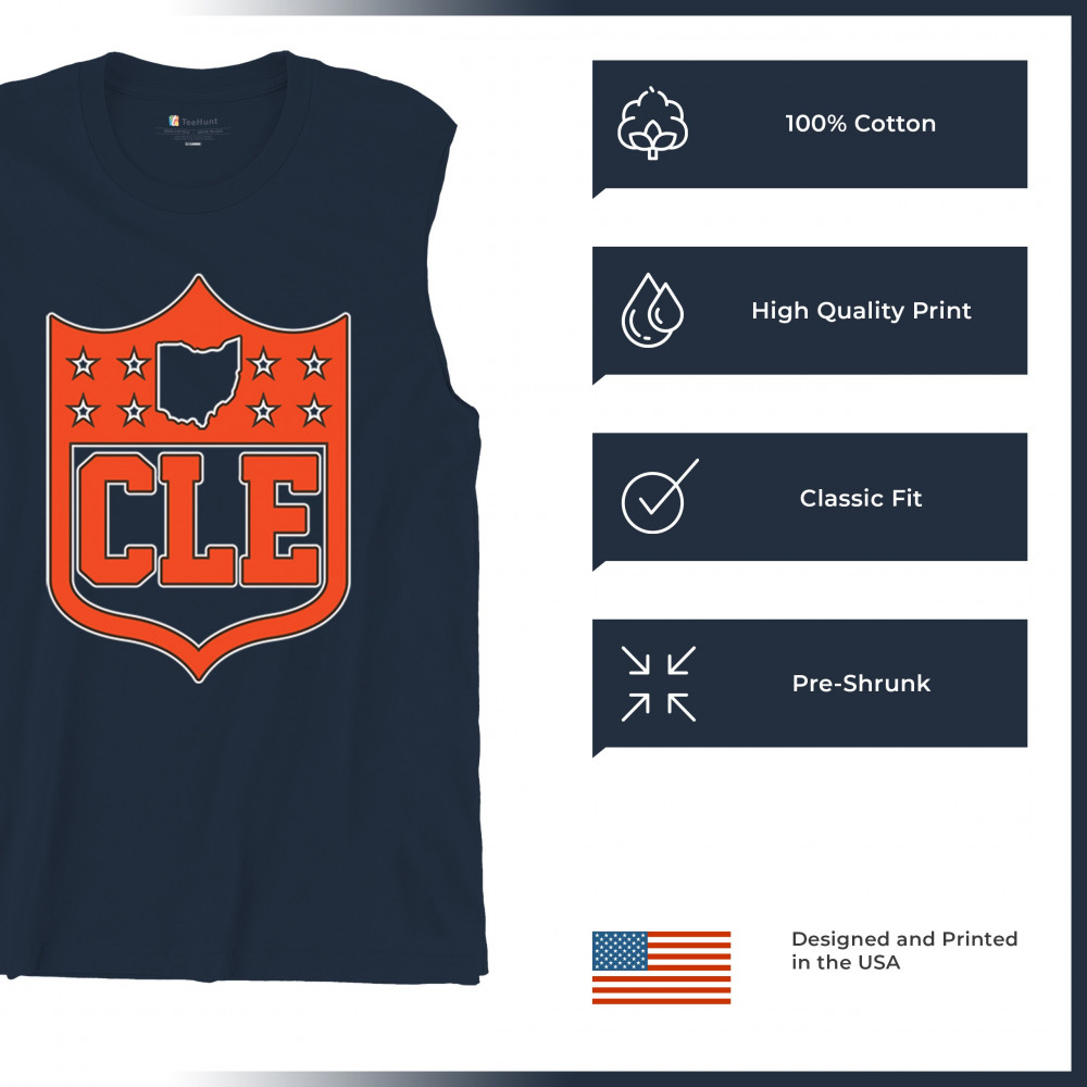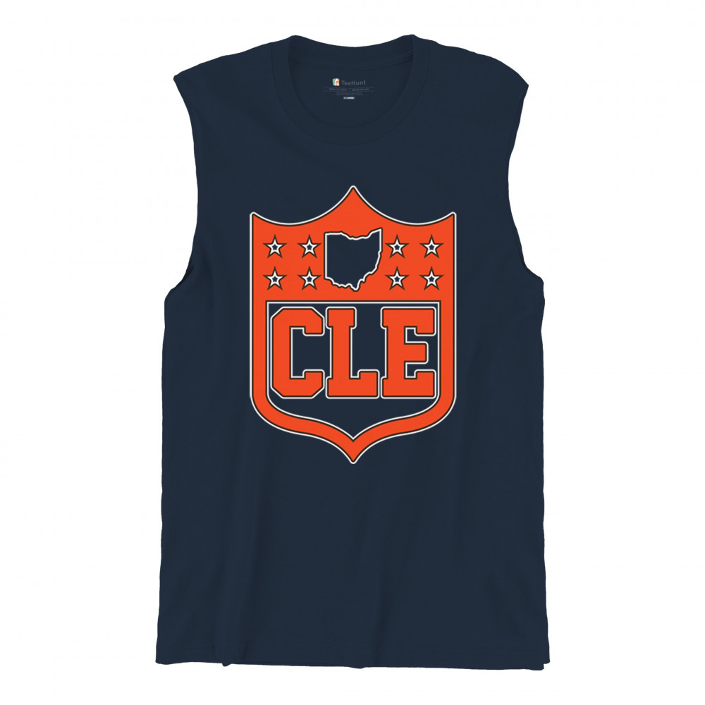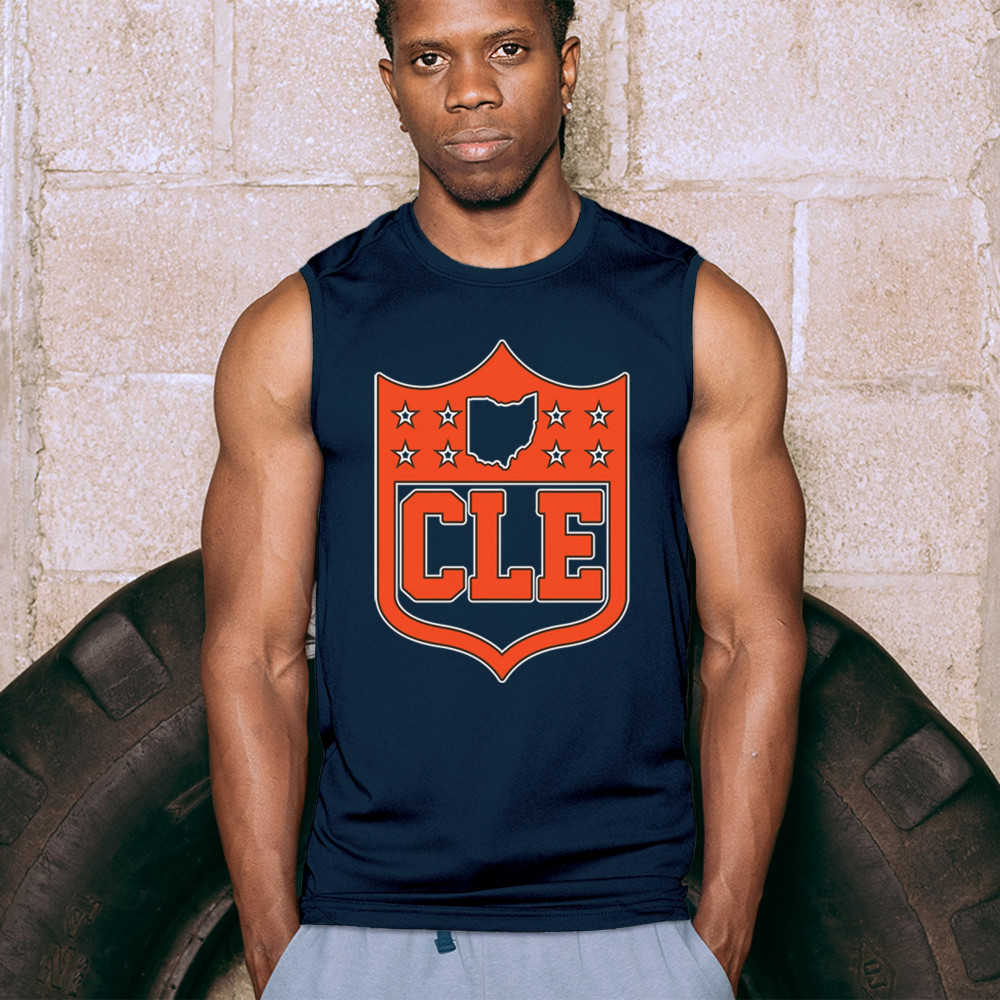 Bold CLE shield design honoring Cleveland football nation with Rust Belt pride, underdog grit, and blue collar sports heritage.
