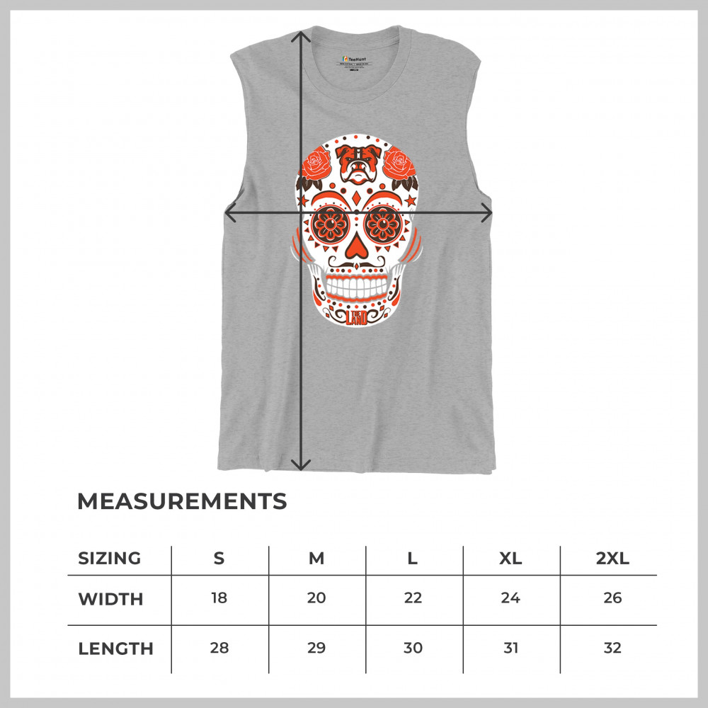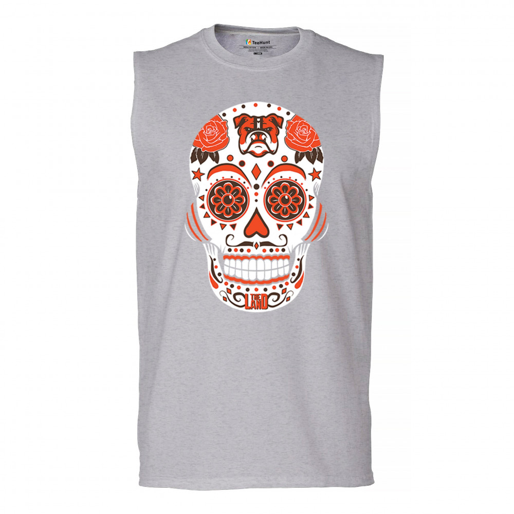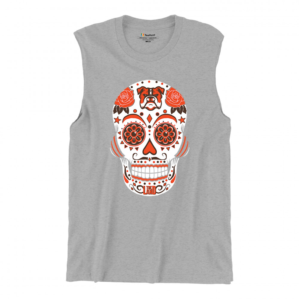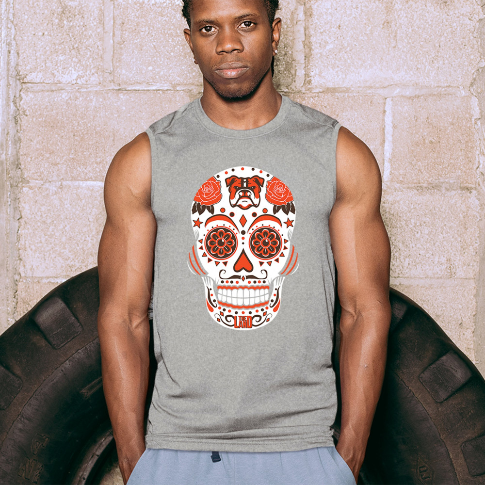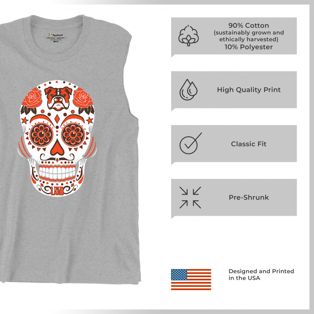 Cleveland Sugar Skull with Lake Erie pride, Rust Belt football grit, orange & brown tradition, playoff vibes, and Game Day passion.