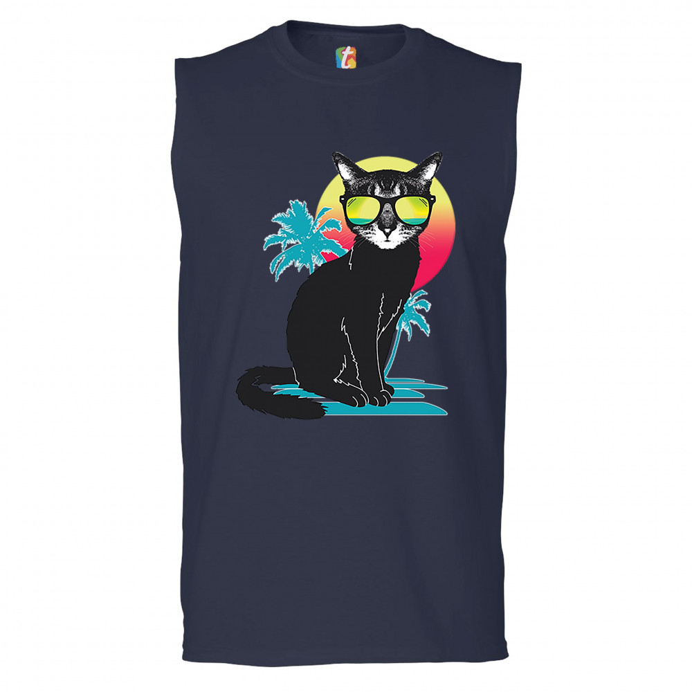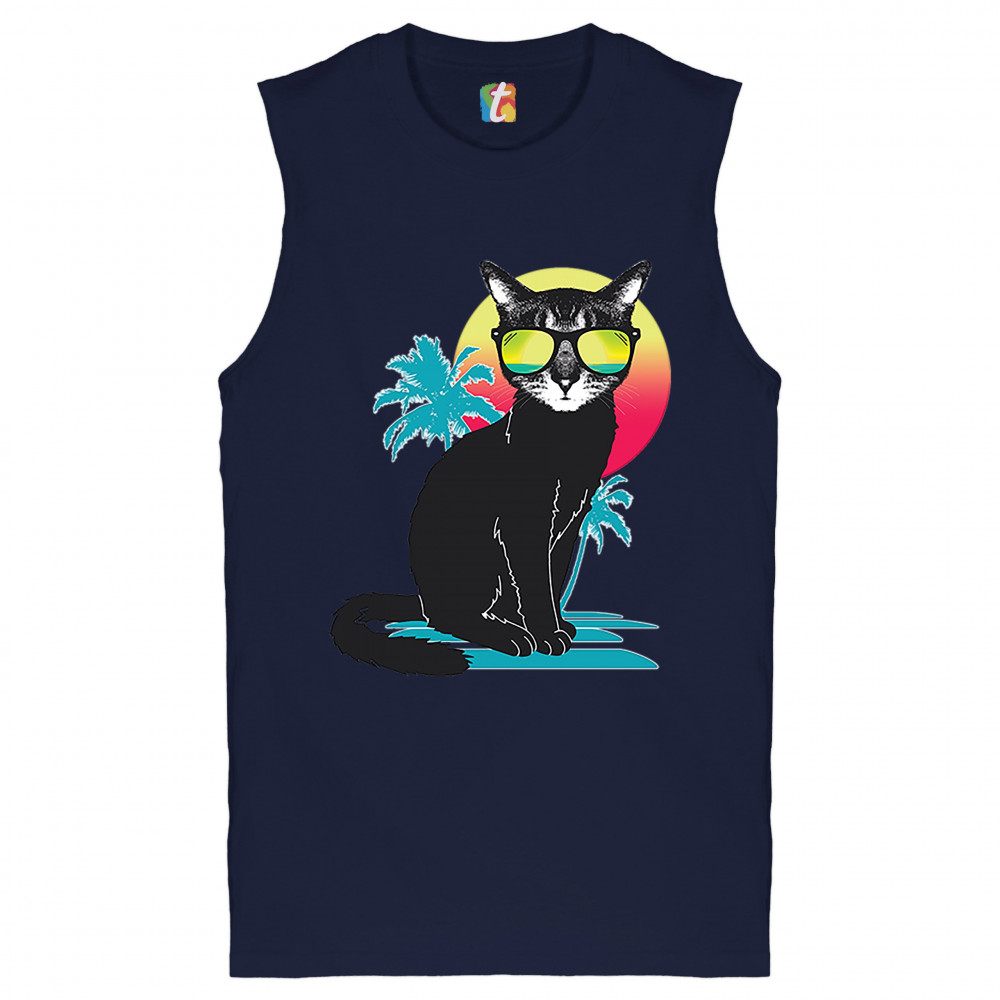 COOL SUMMER CAT muscle shirt neon kitty on a beach animal lovers men's navy blue
