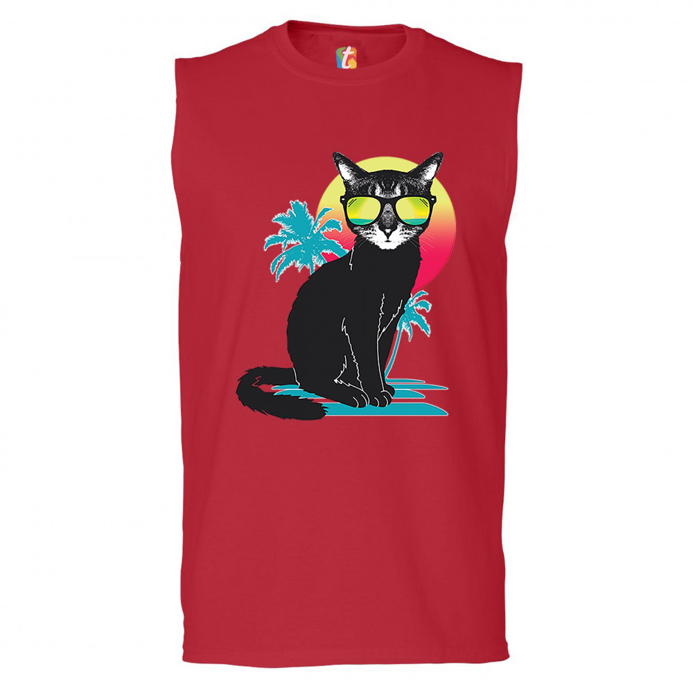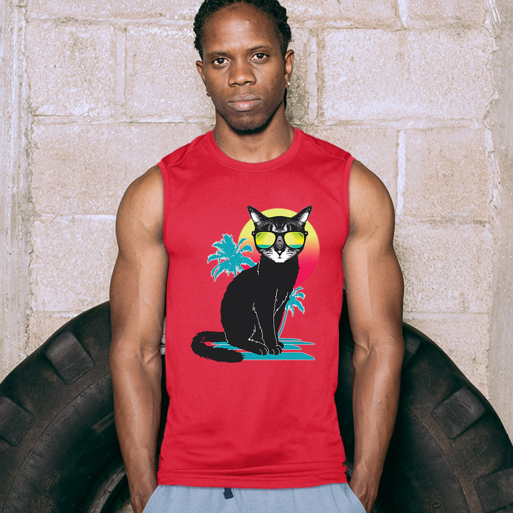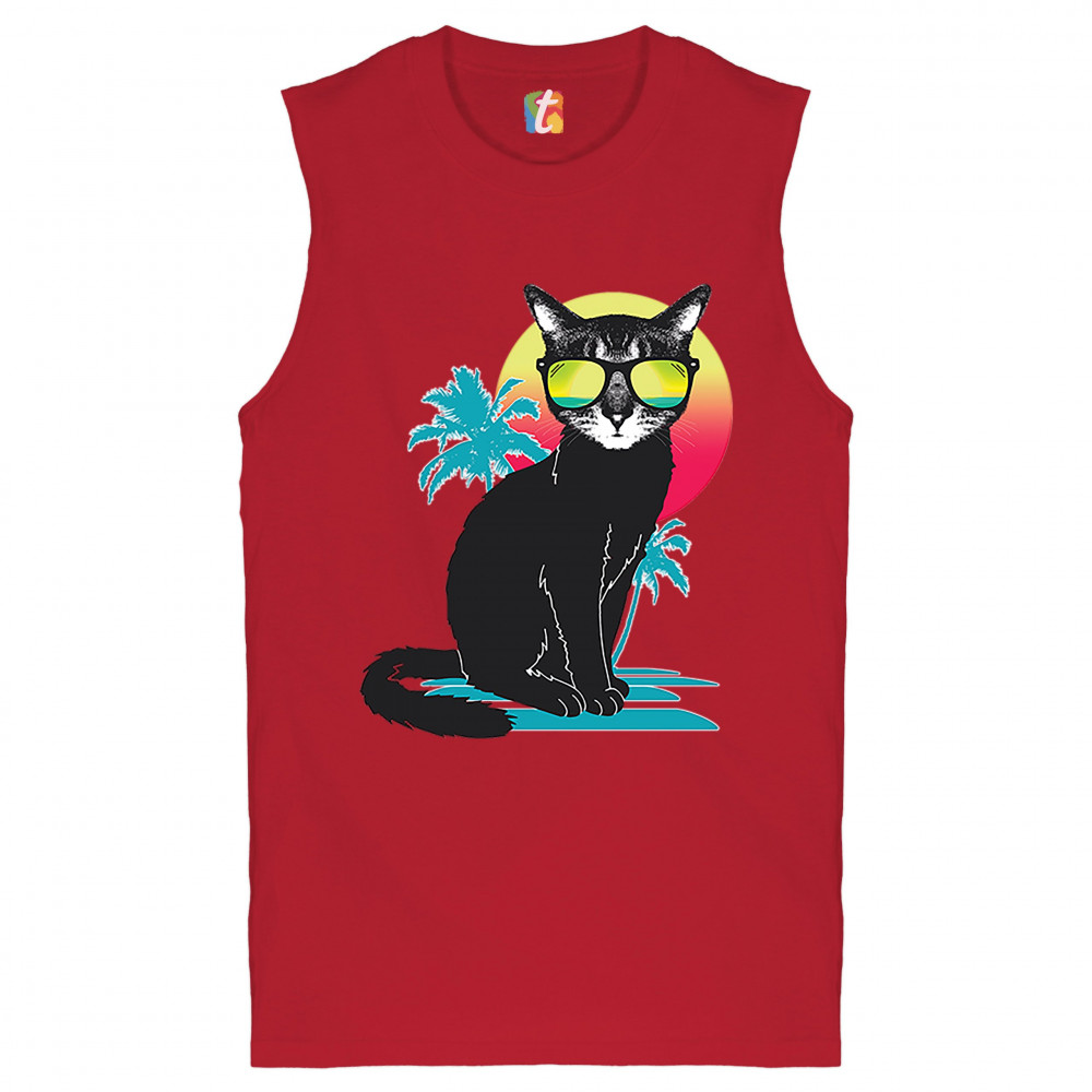COOL SUMMER CAT muscle shirt neon kitty on a beach animal lovers men's red